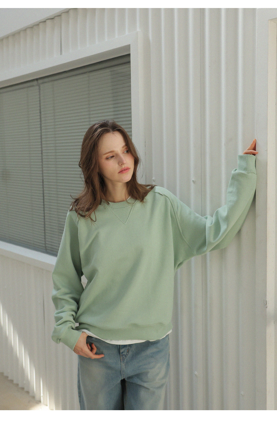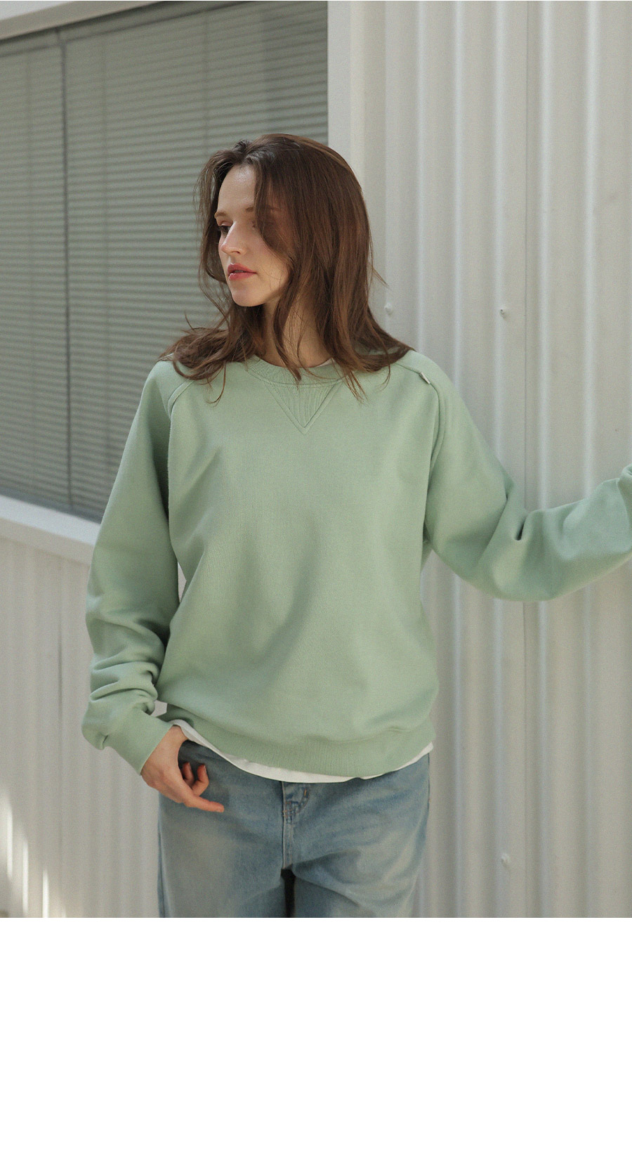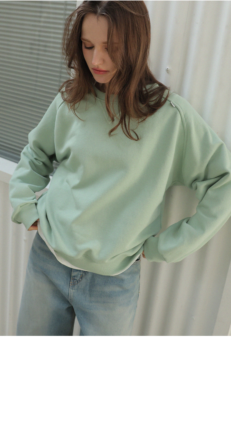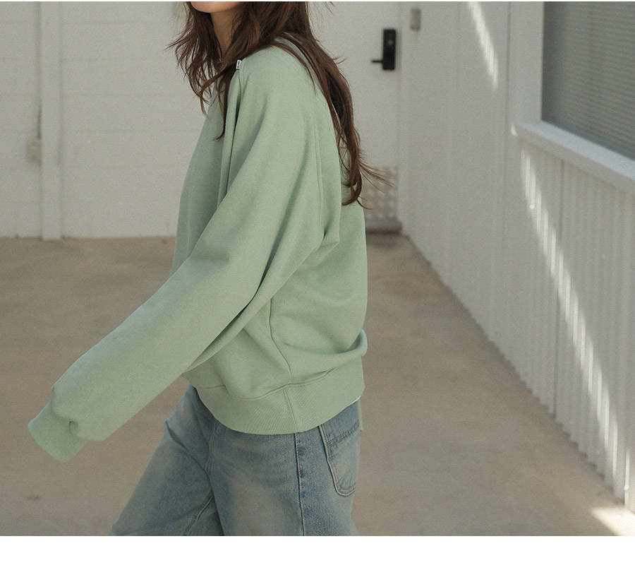 "어깨라인의 유니크한 절개 패턴 디자인이 포인트가 되는 맨투맨"