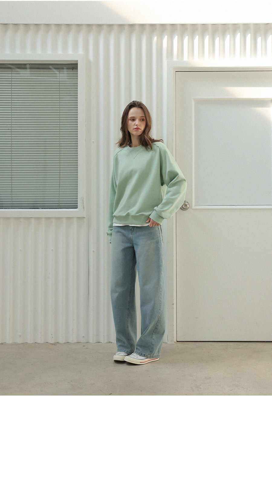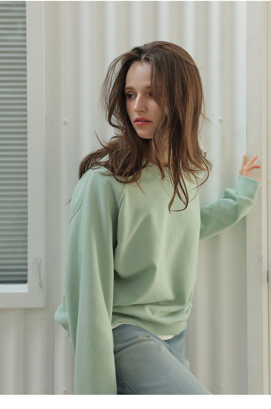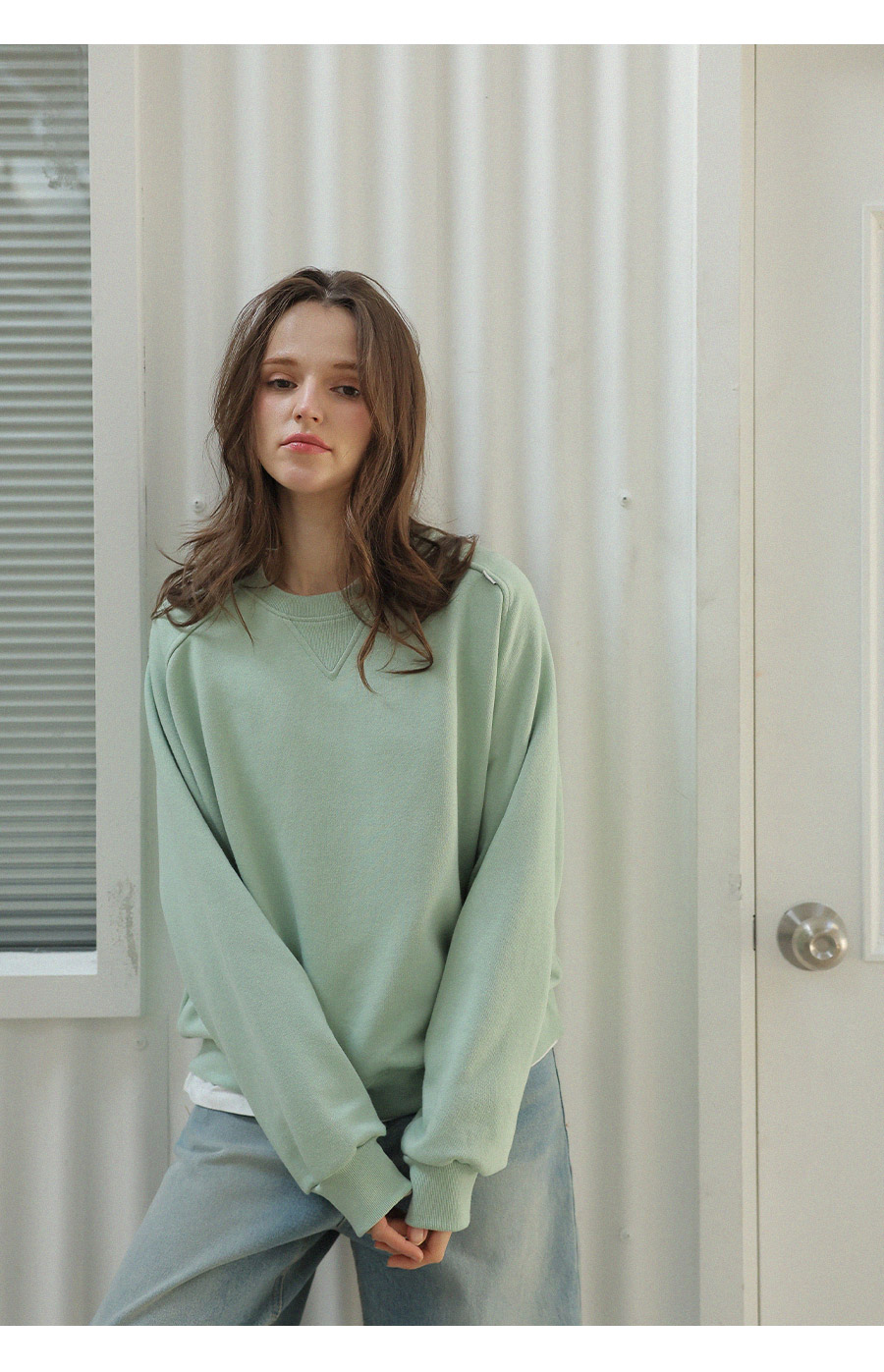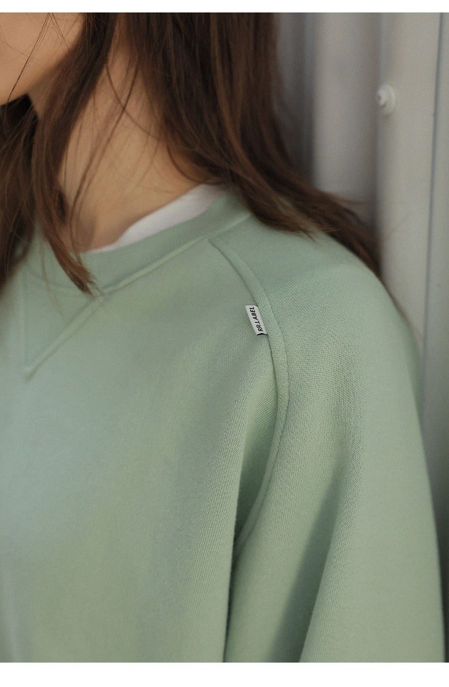 "어깨라인의 유니크한 절개 패턴 디자인이 포인트가 되는 맨투맨"