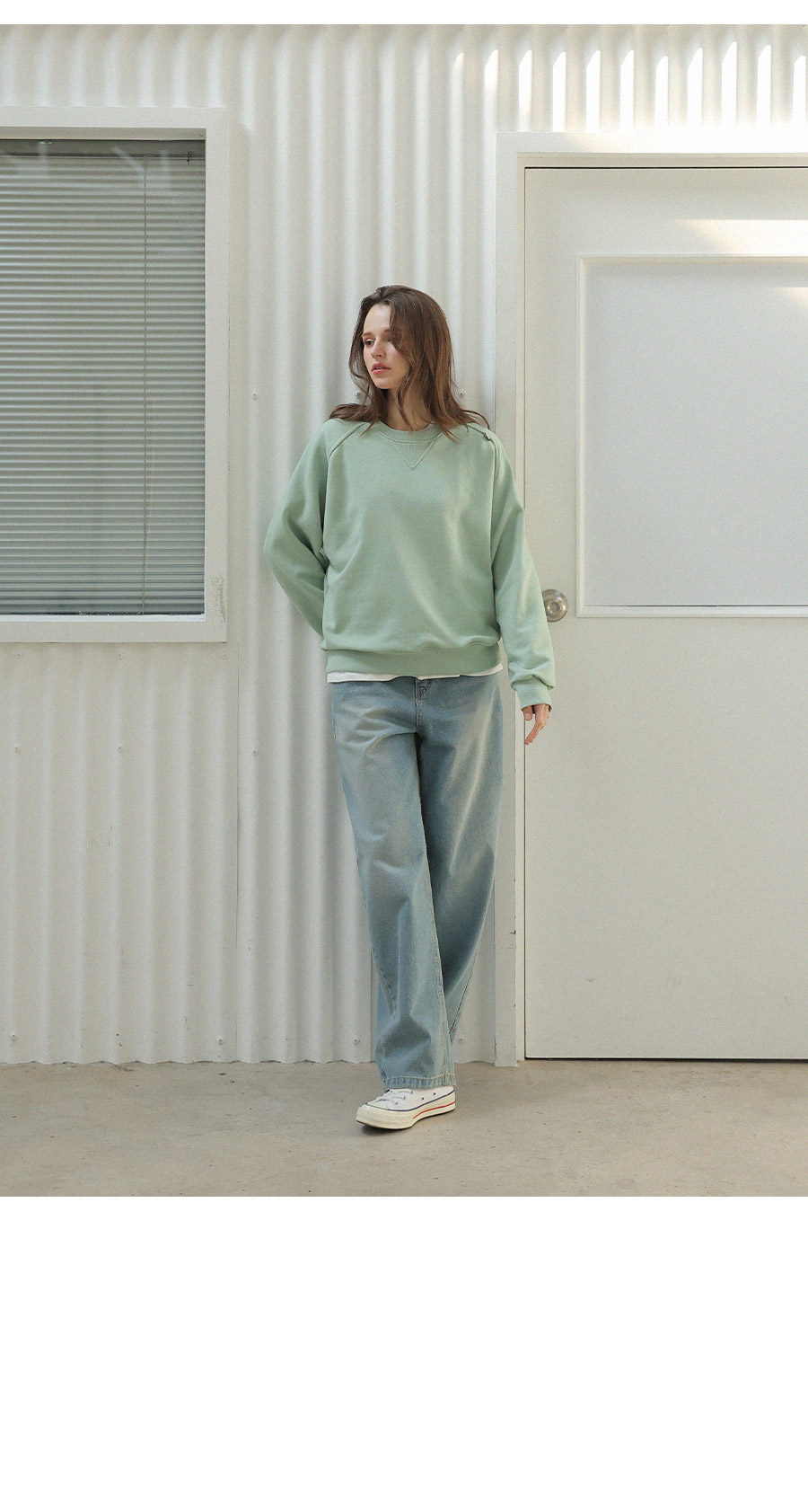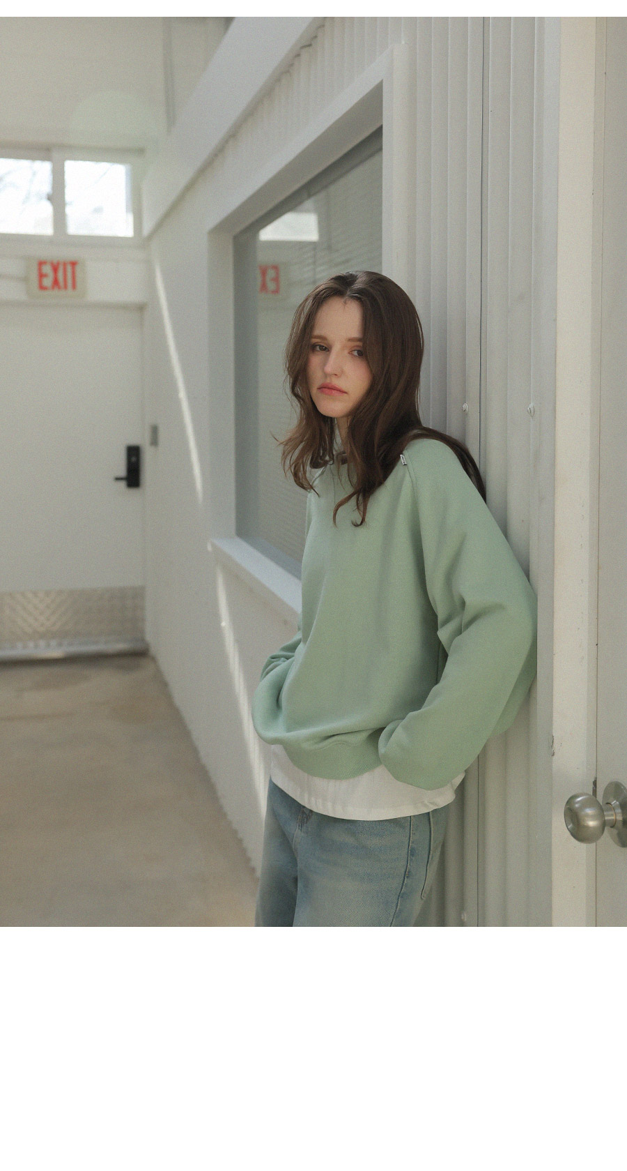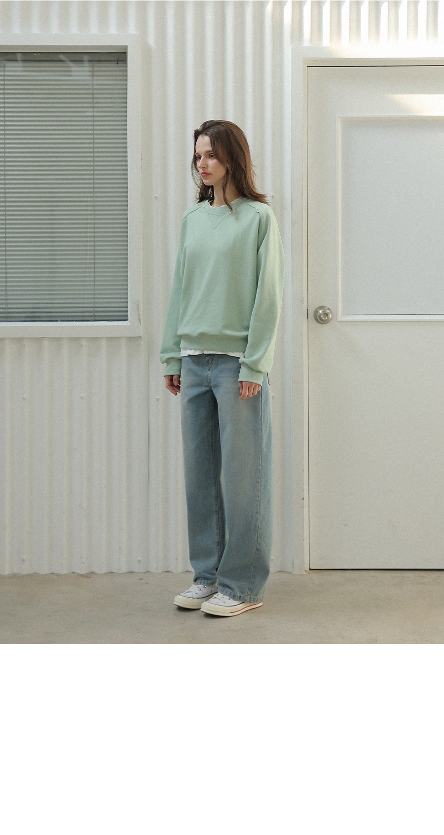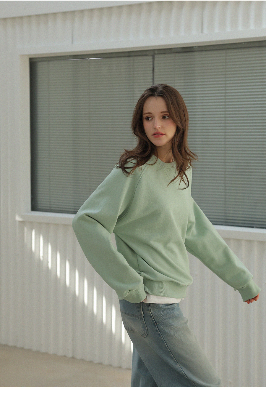 "어깨라인의 유니크한 절개 패턴 디자인이 포인트가 되는 맨투맨"