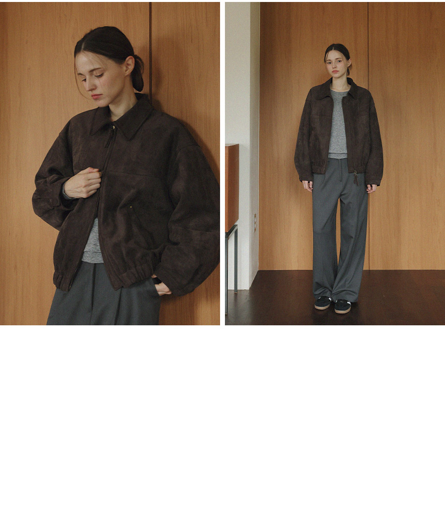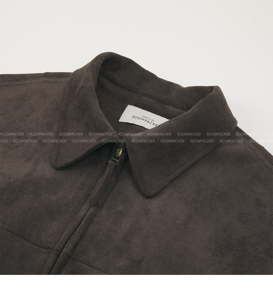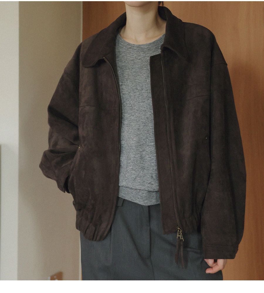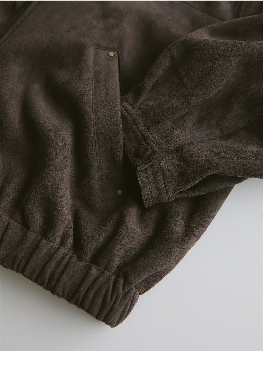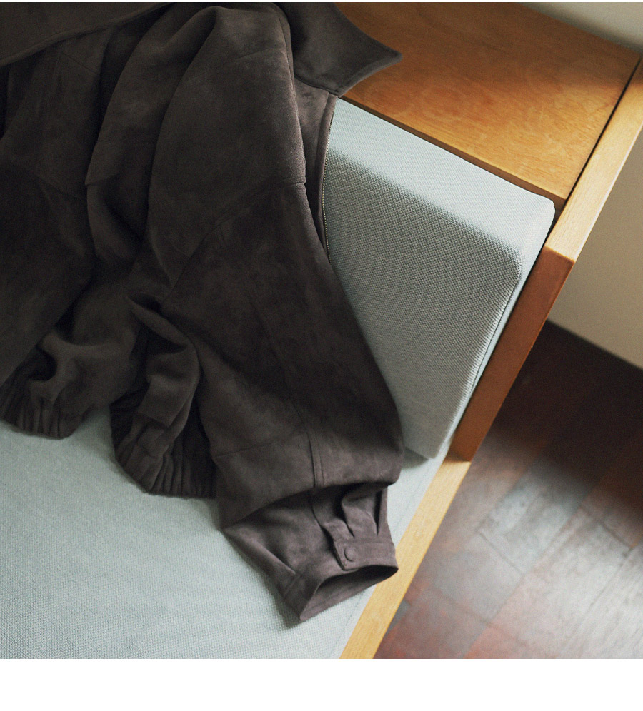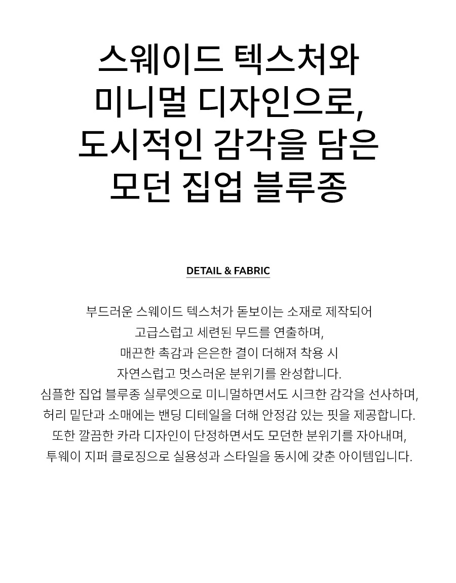 "스웨이드 텍스처와 미니멀 디자인으로, 도시적인 감각을 담은 모던 집업 블루종"