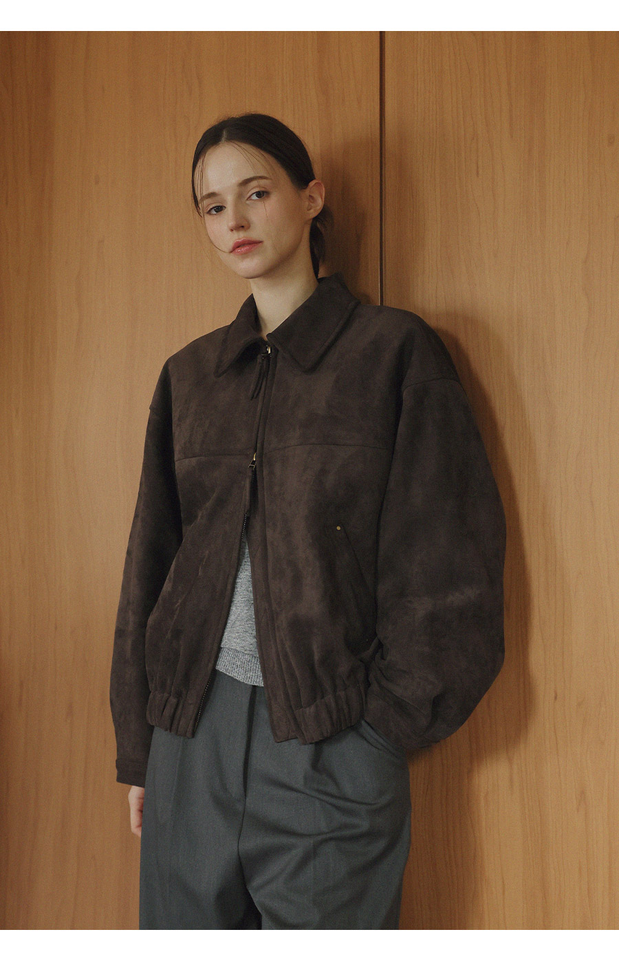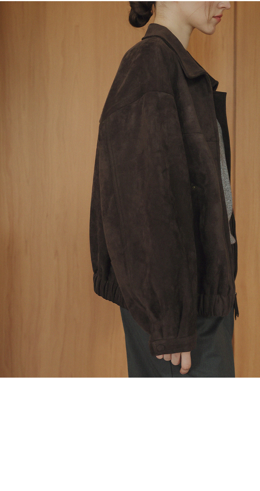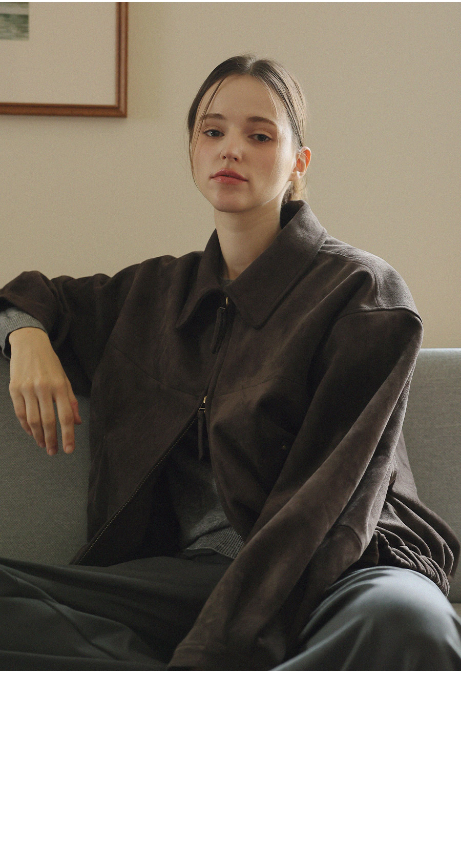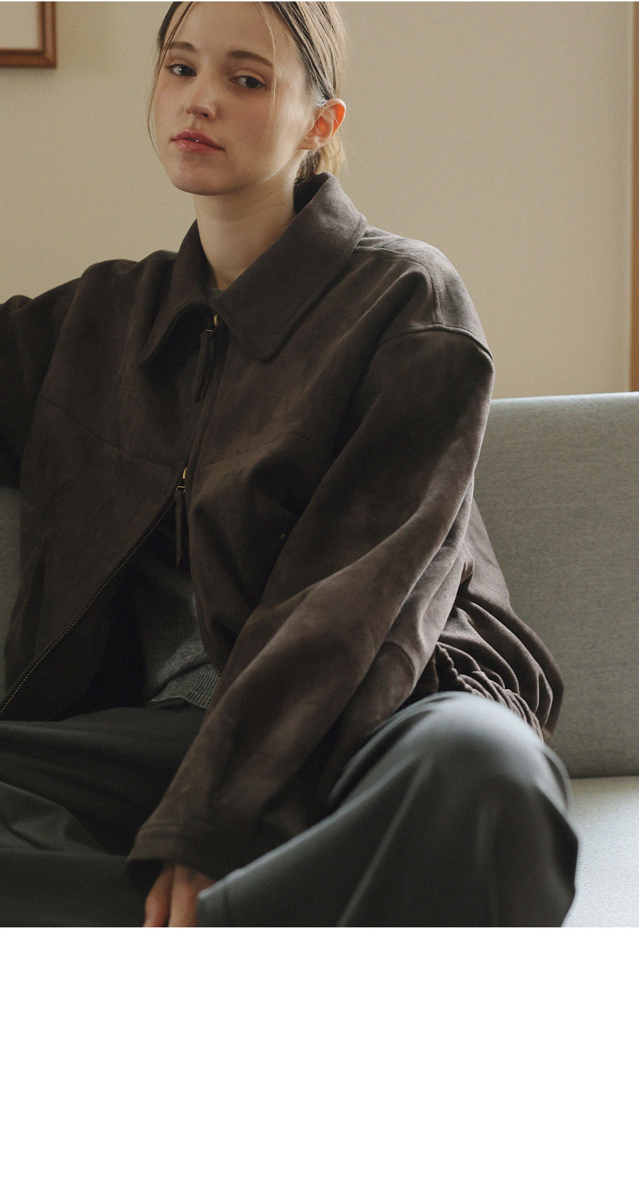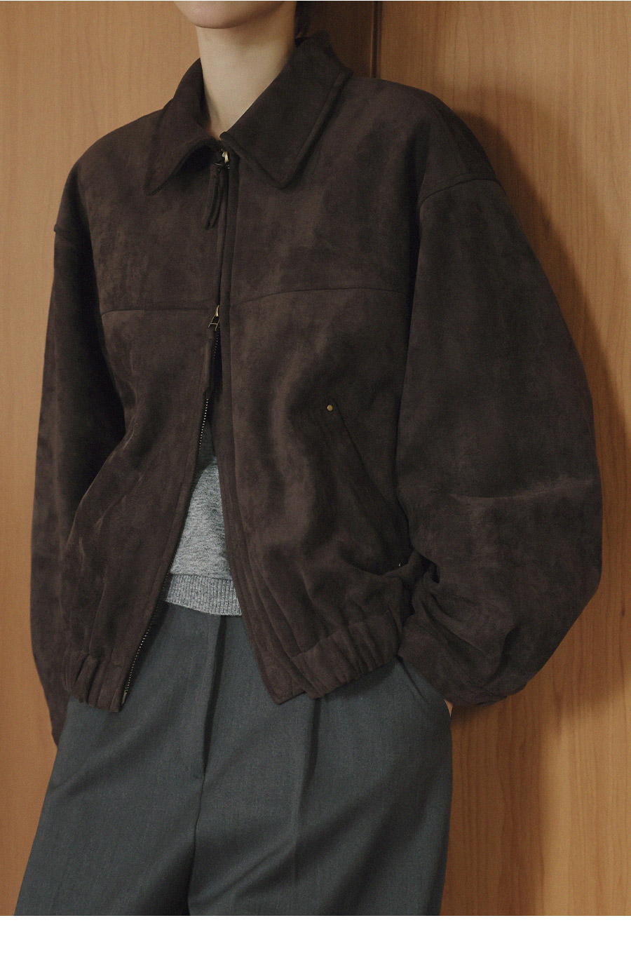 "스웨이드 텍스처와 미니멀 디자인으로, 도시적인 감각을 담은 모던 집업 블루종"