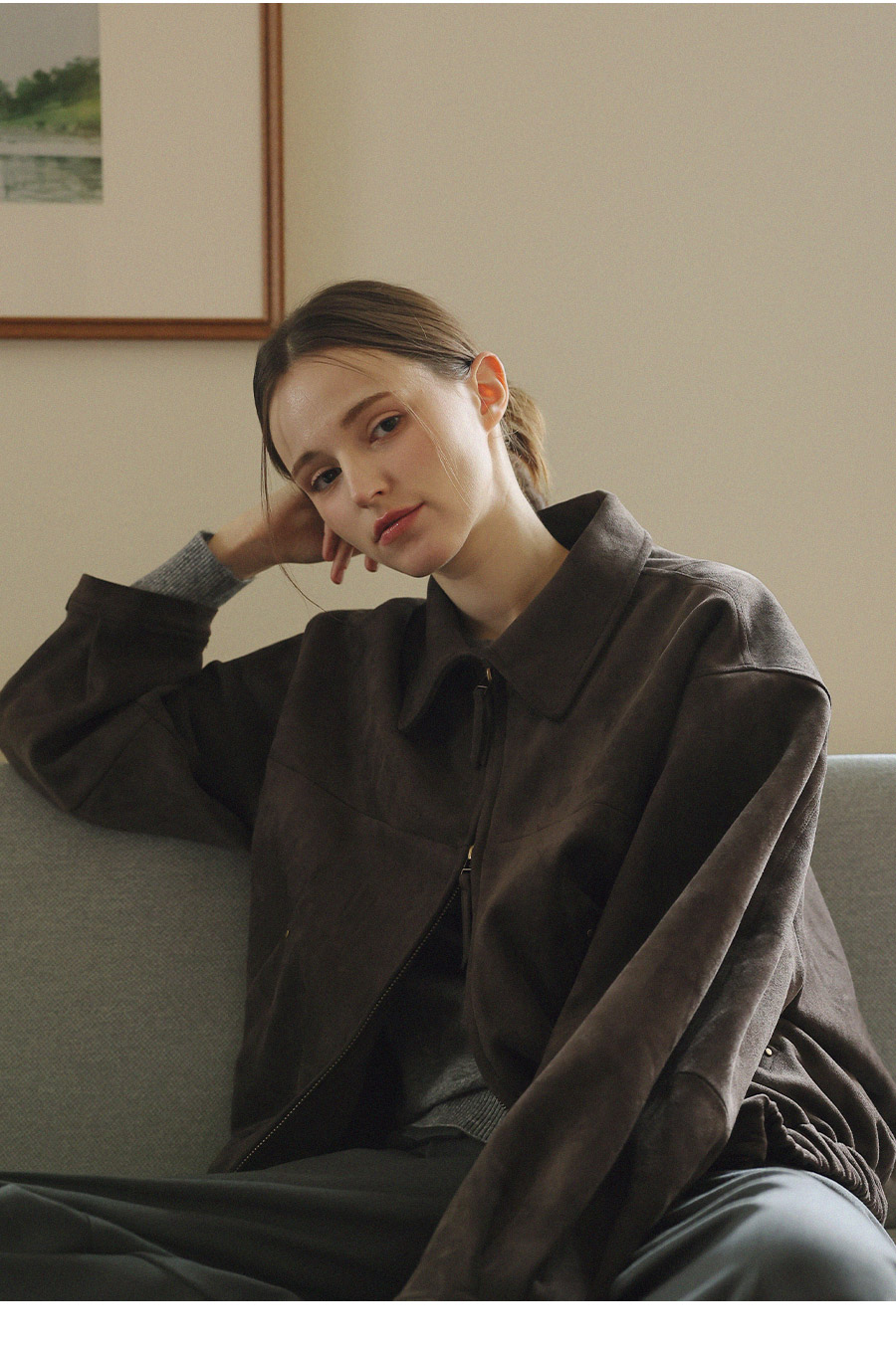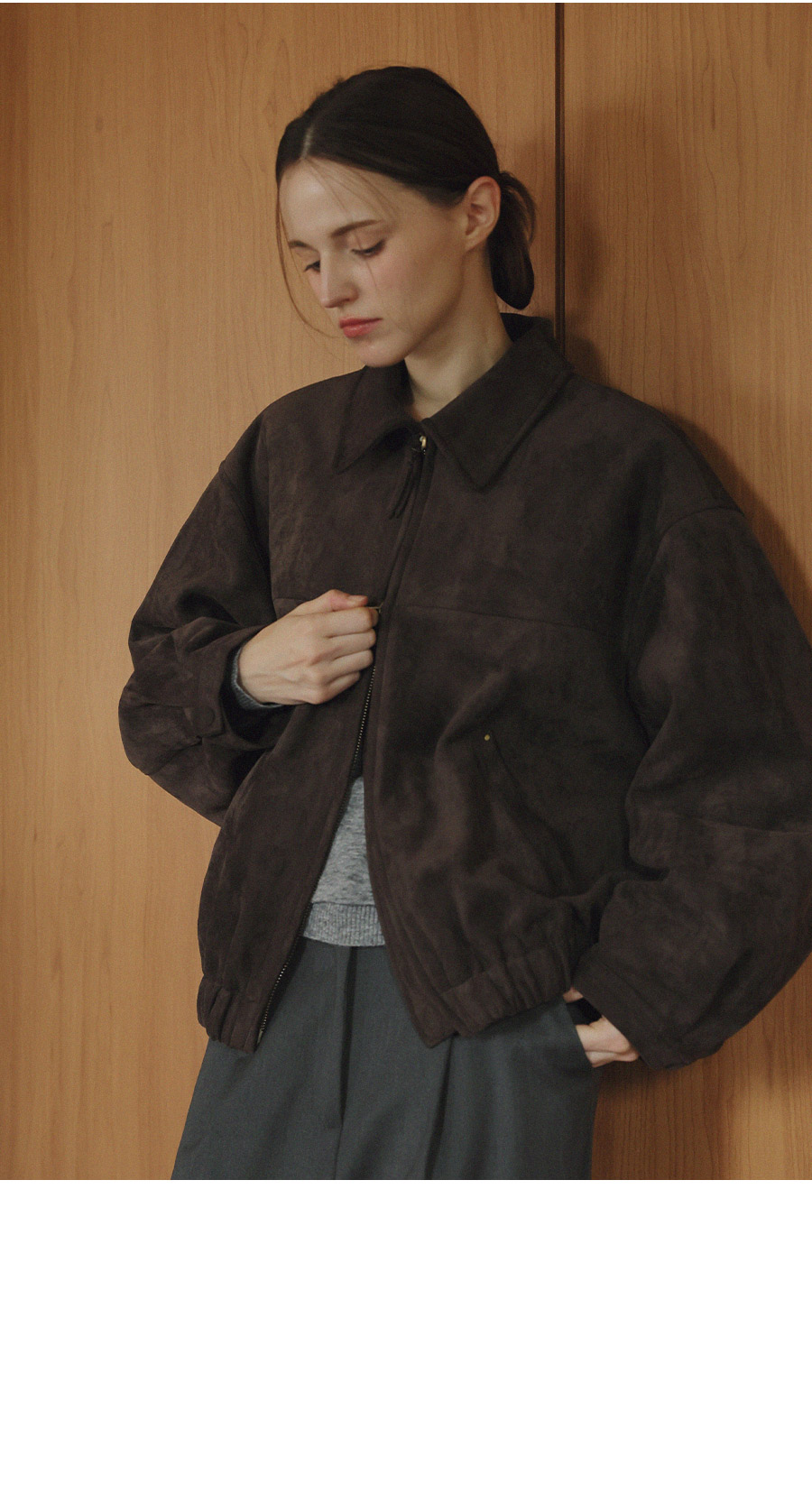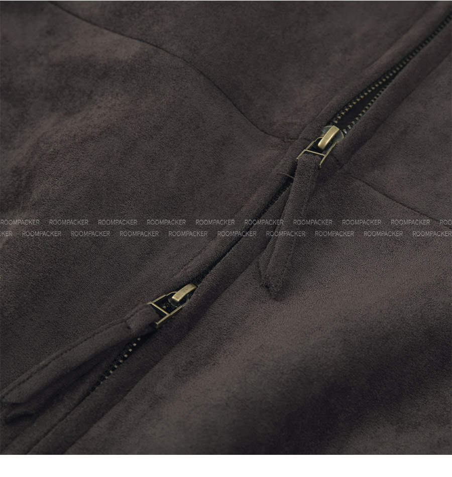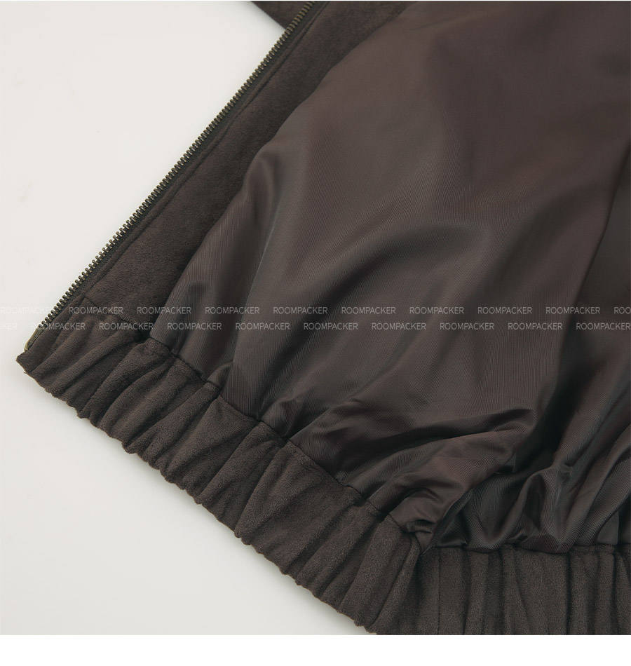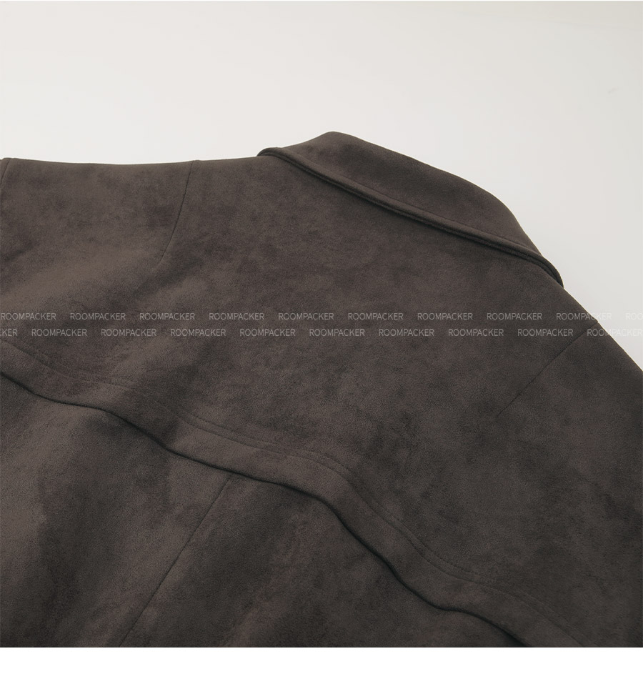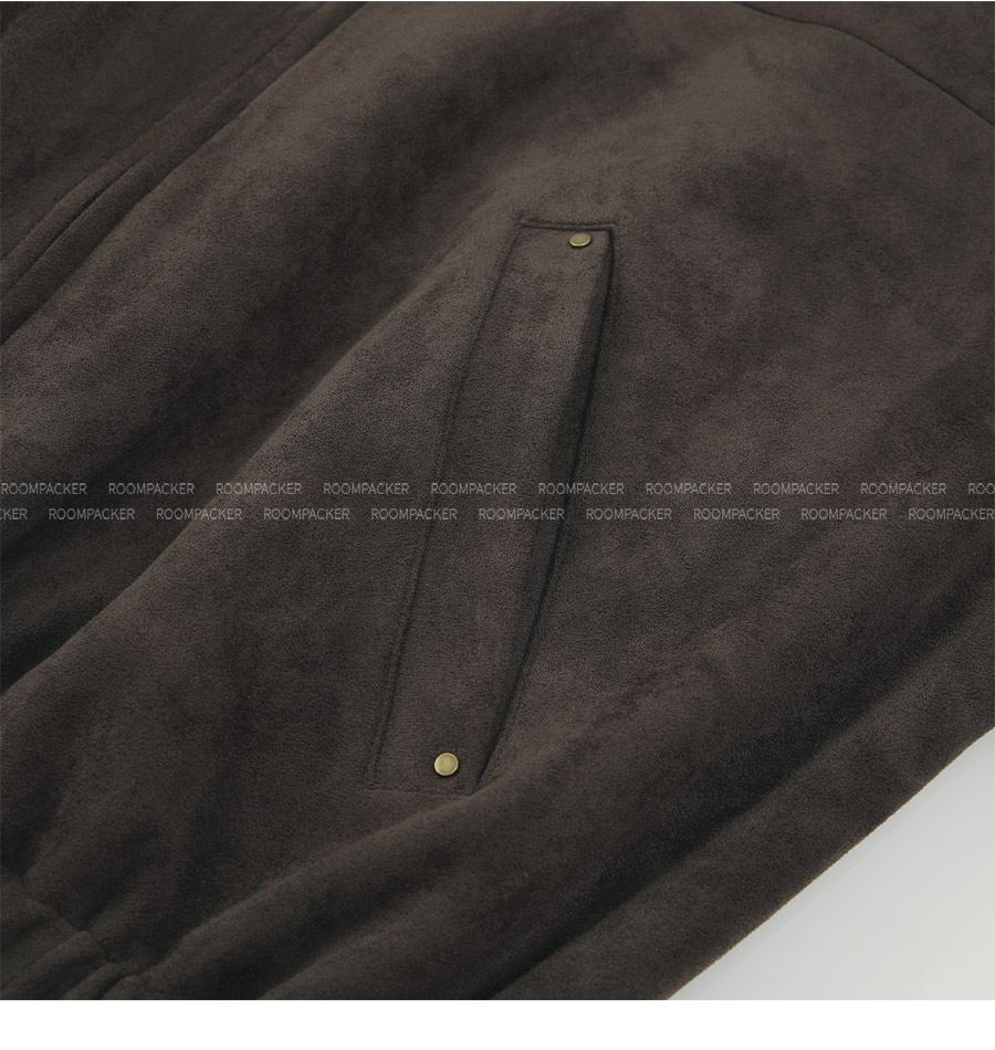 "스웨이드 텍스처와 미니멀 디자인으로, 도시적인 감각을 담은 모던 집업 블루종"