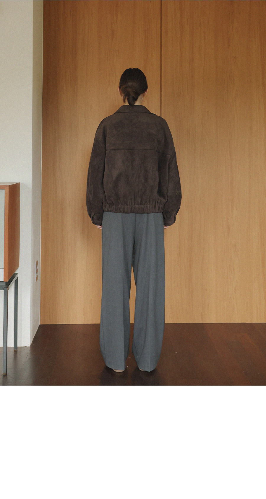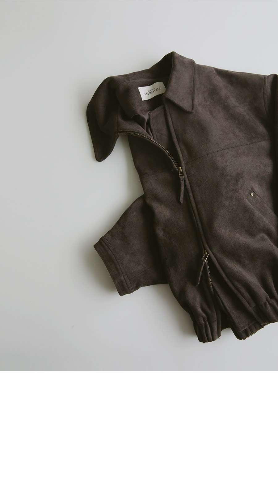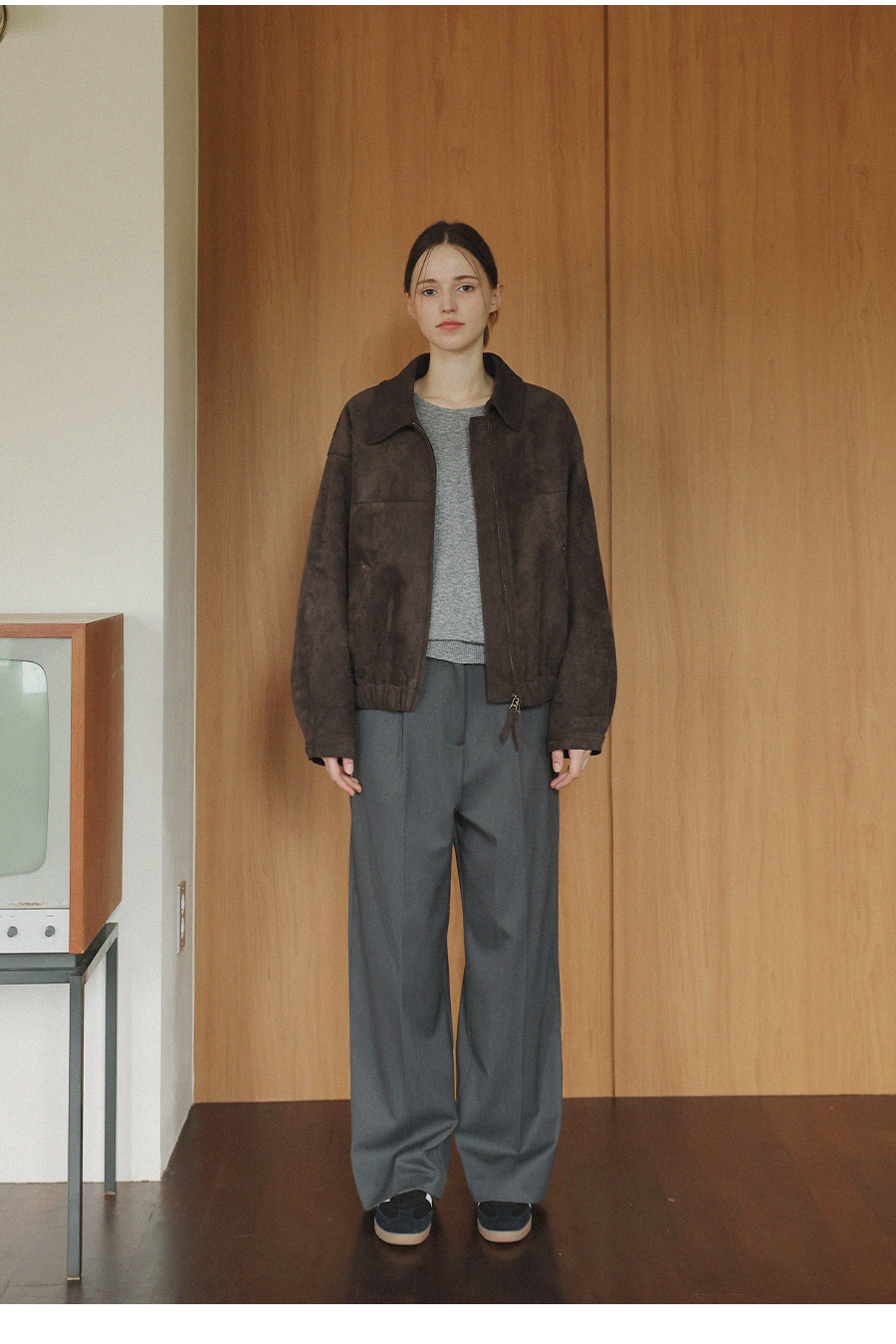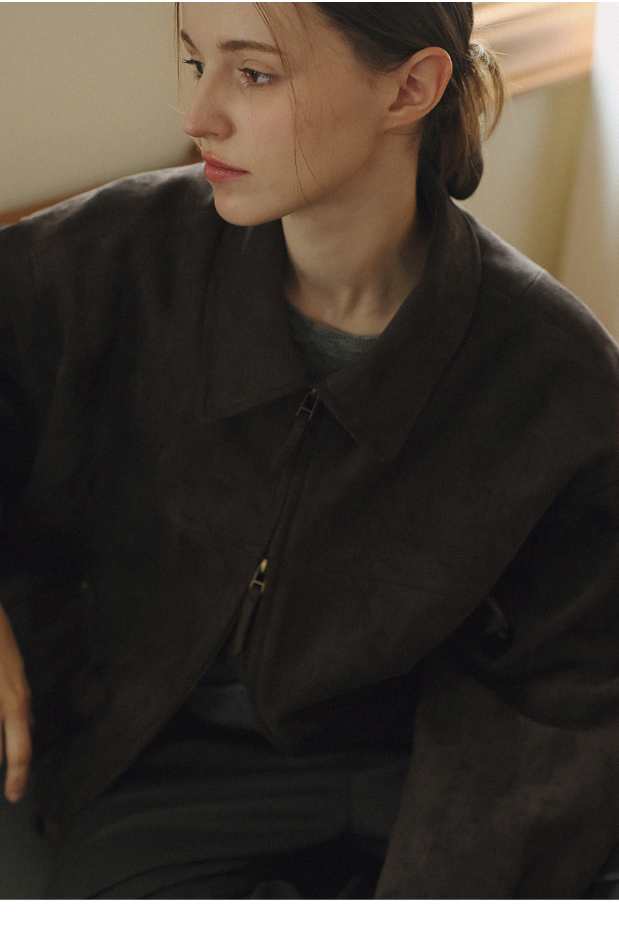 "스웨이드 텍스처와 미니멀 디자인으로, 도시적인 감각을 담은 모던 집업 블루종"