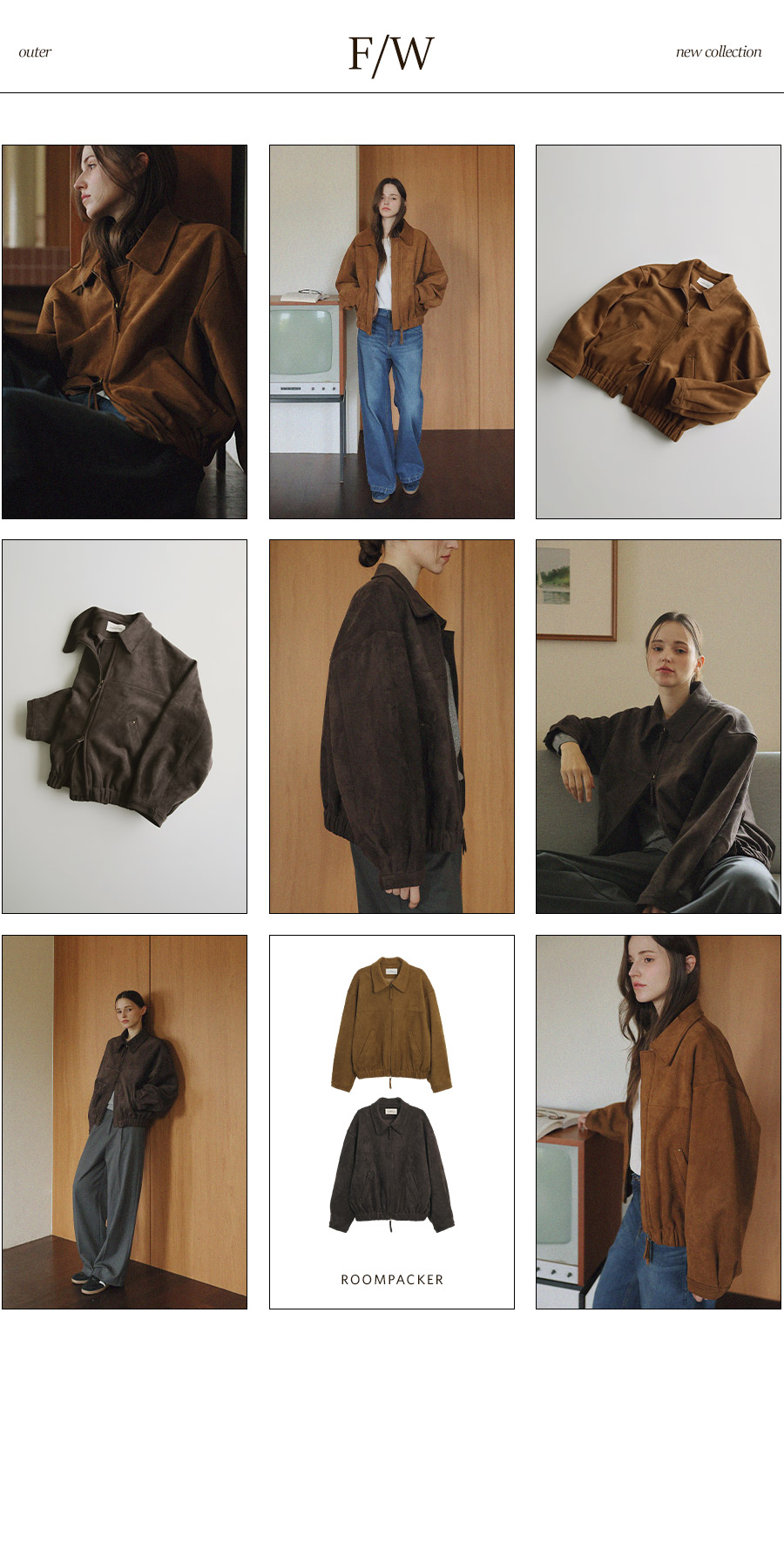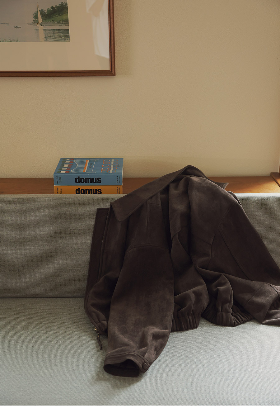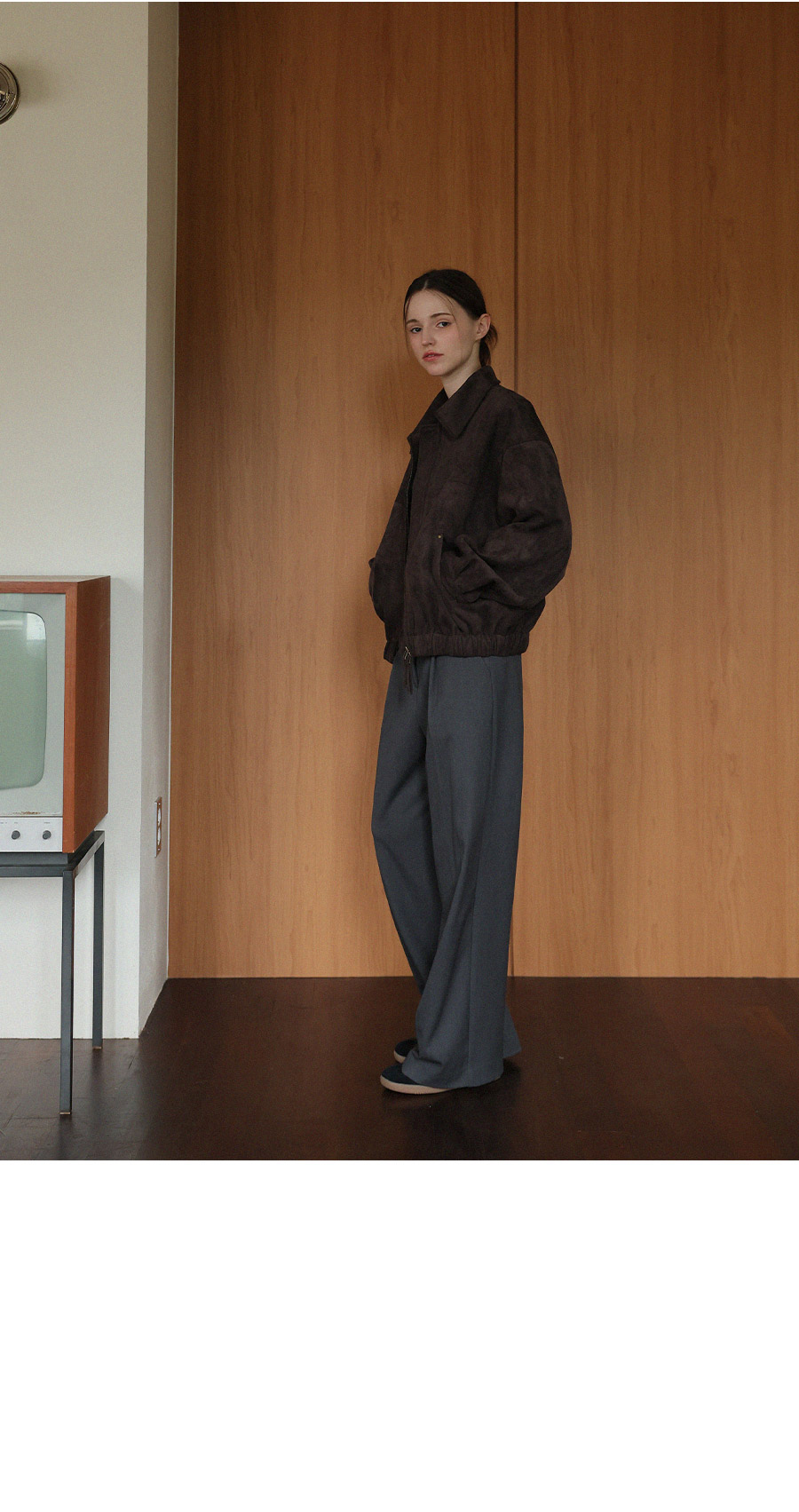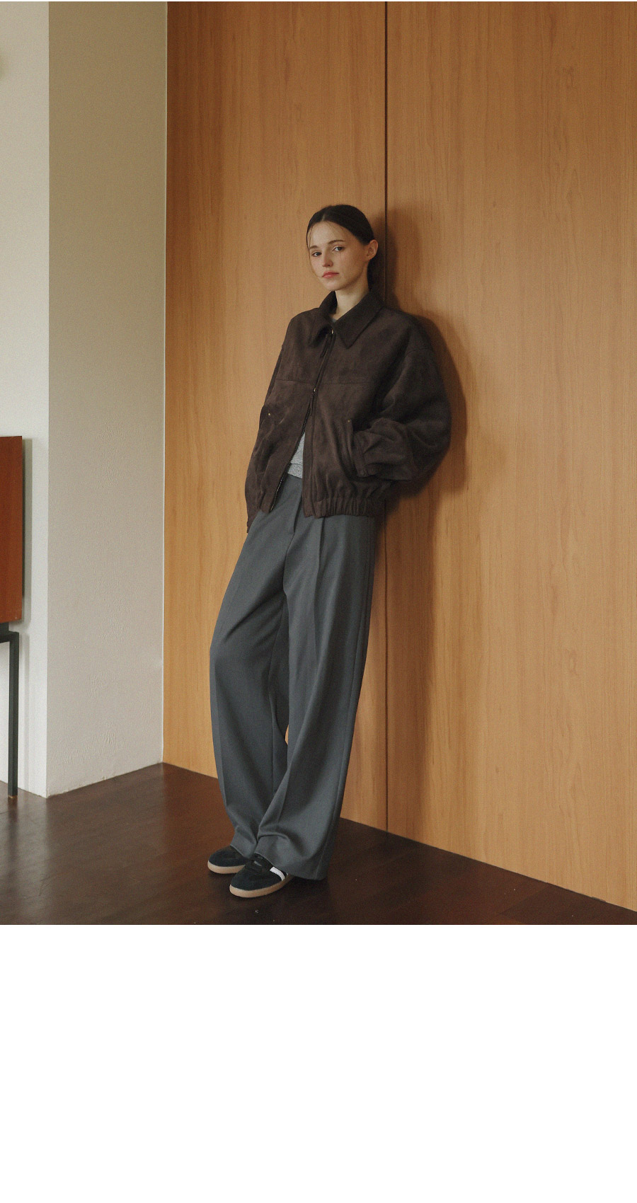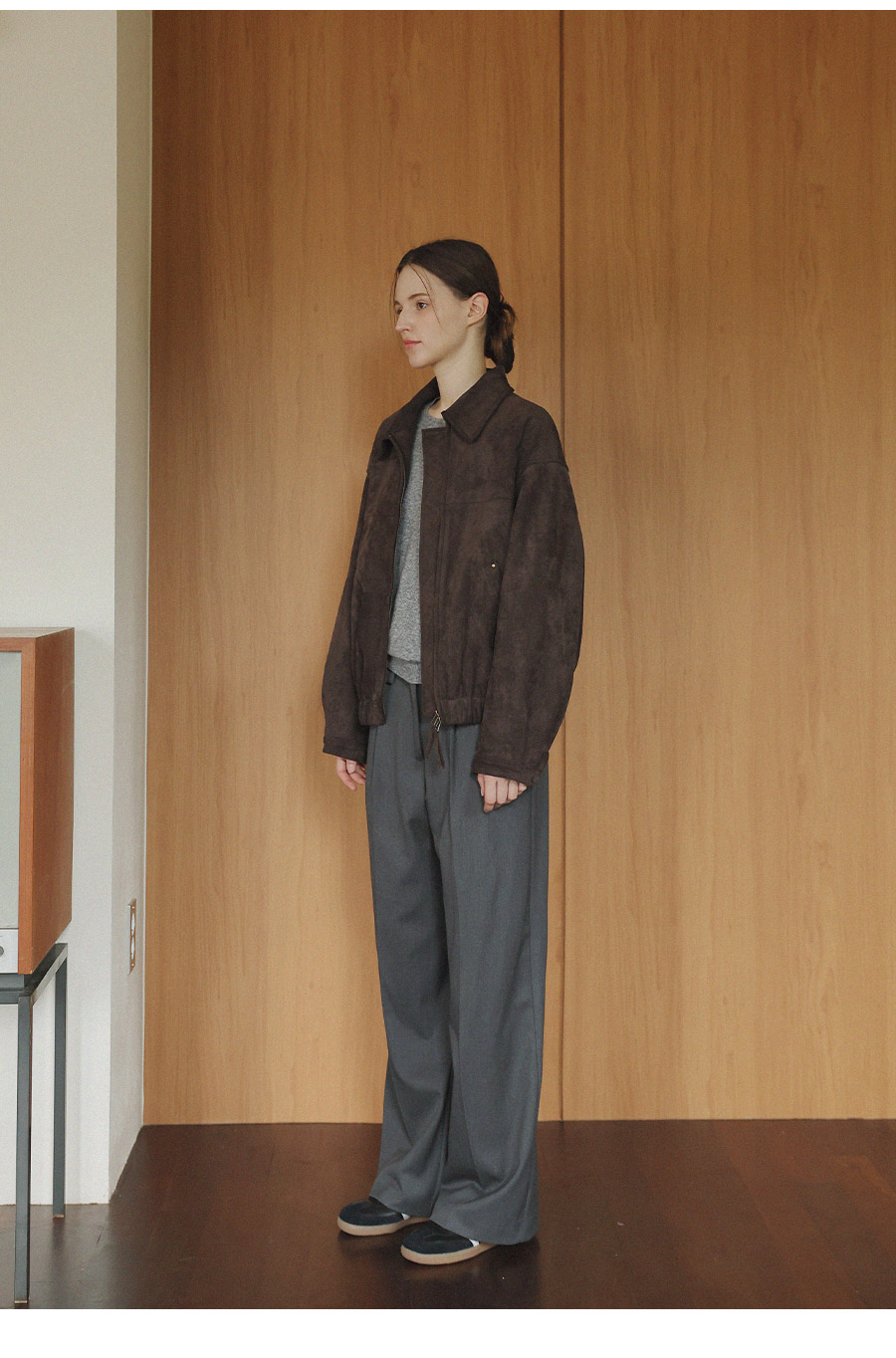 "스웨이드 텍스처와 미니멀 디자인으로, 도시적인 감각을 담은 모던 집업 블루종"