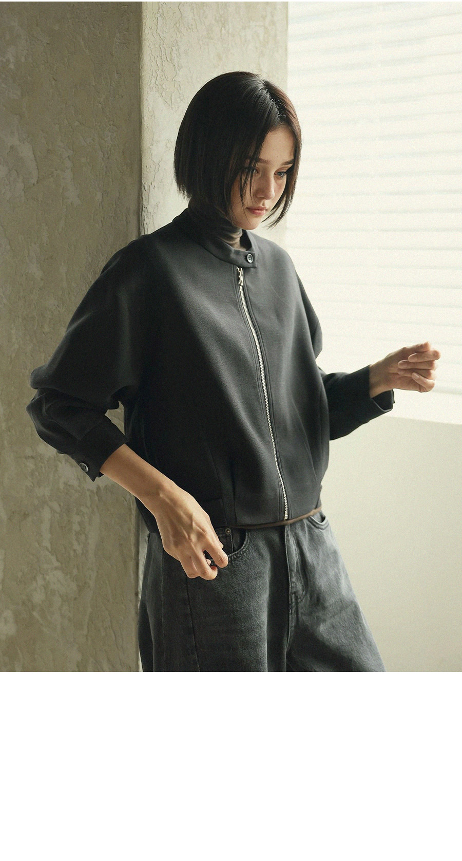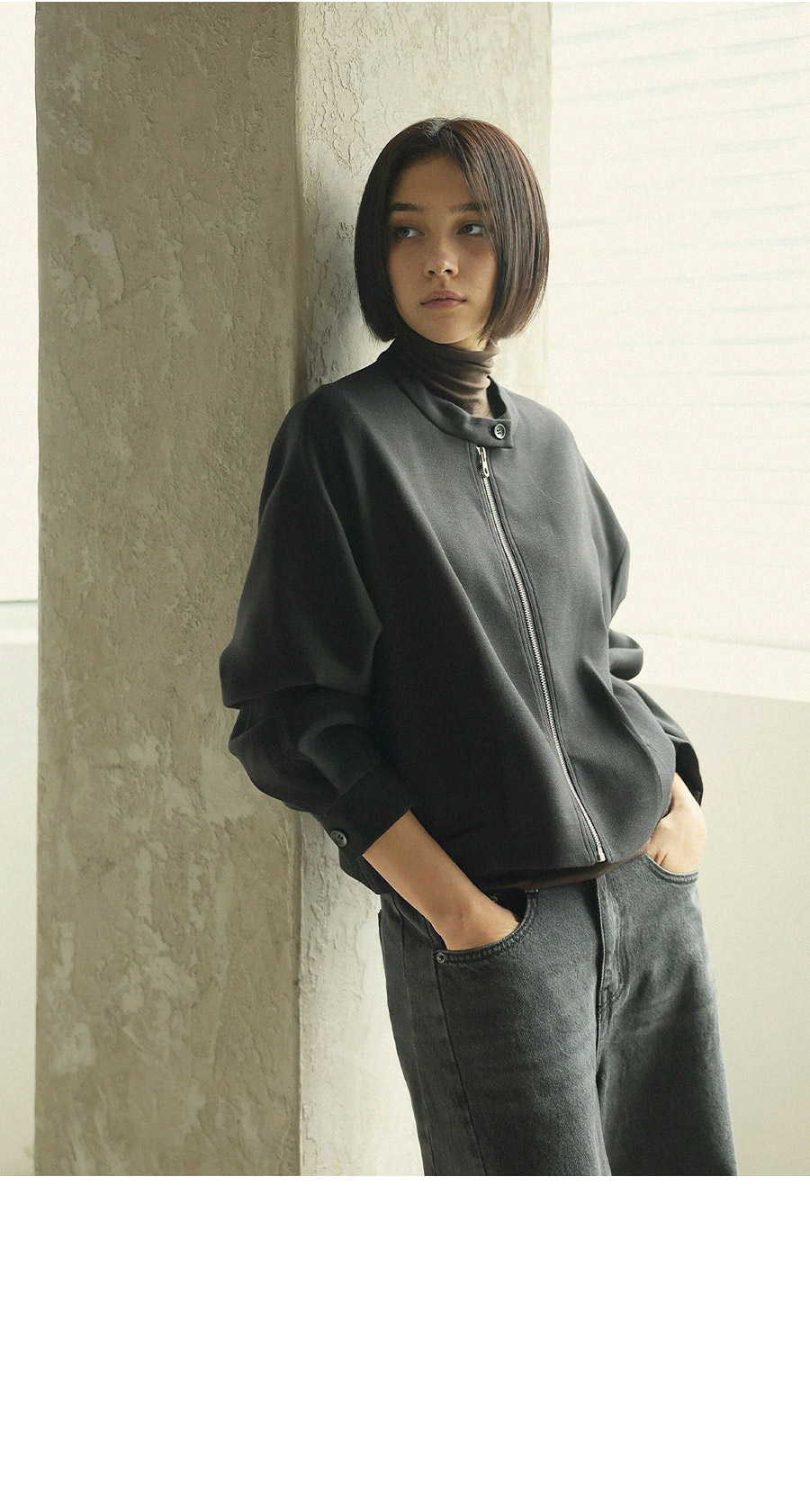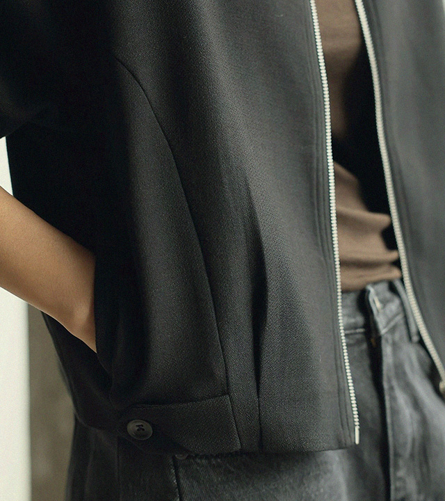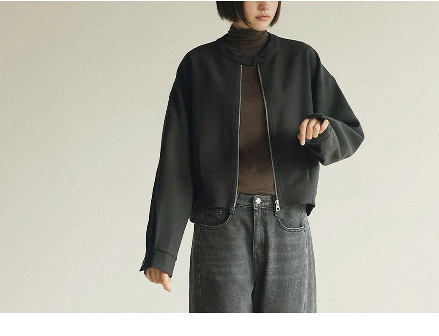 - 스탠드형넥라인과 지퍼 클로징 디테일로 포멀한 무드