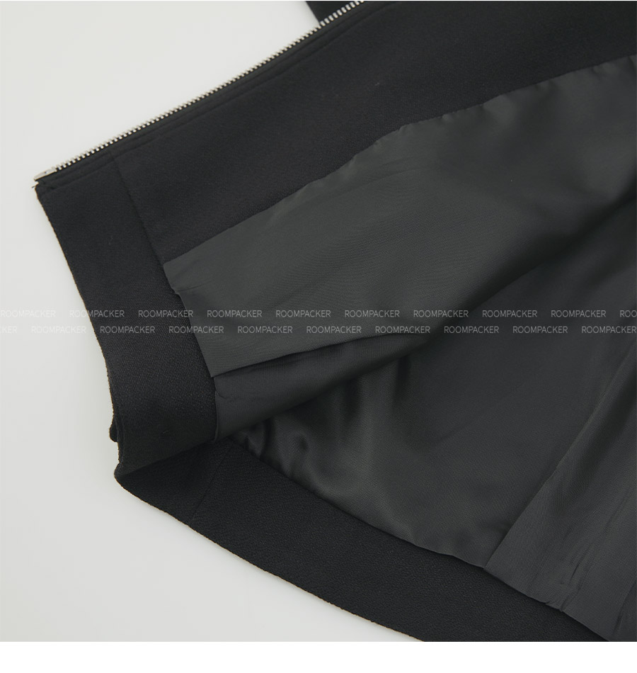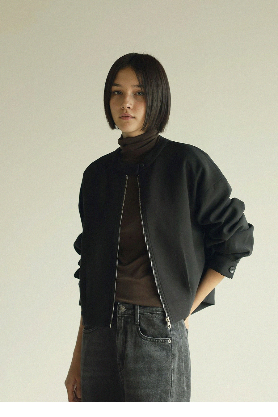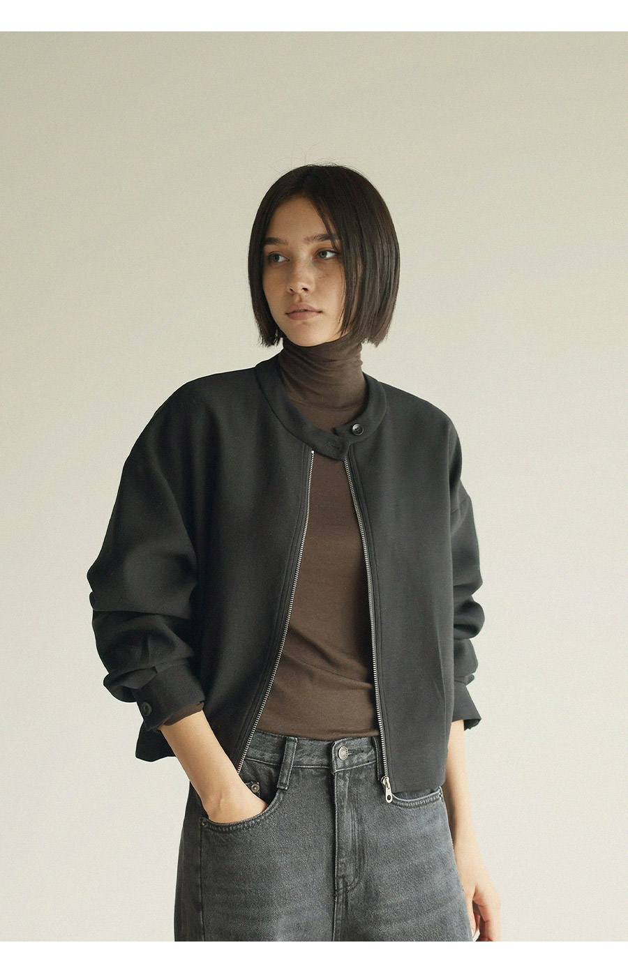 - 스탠드형넥라인과 지퍼 클로징 디테일로 포멀한 무드