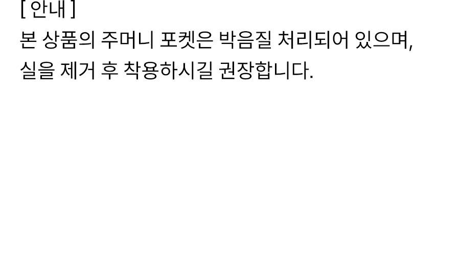 *본 상품의 주머니 포켓은 박음질 처리되어 있으며, 실을 제거 후 착용하시길 권장합니다.*