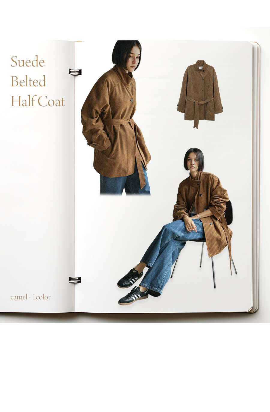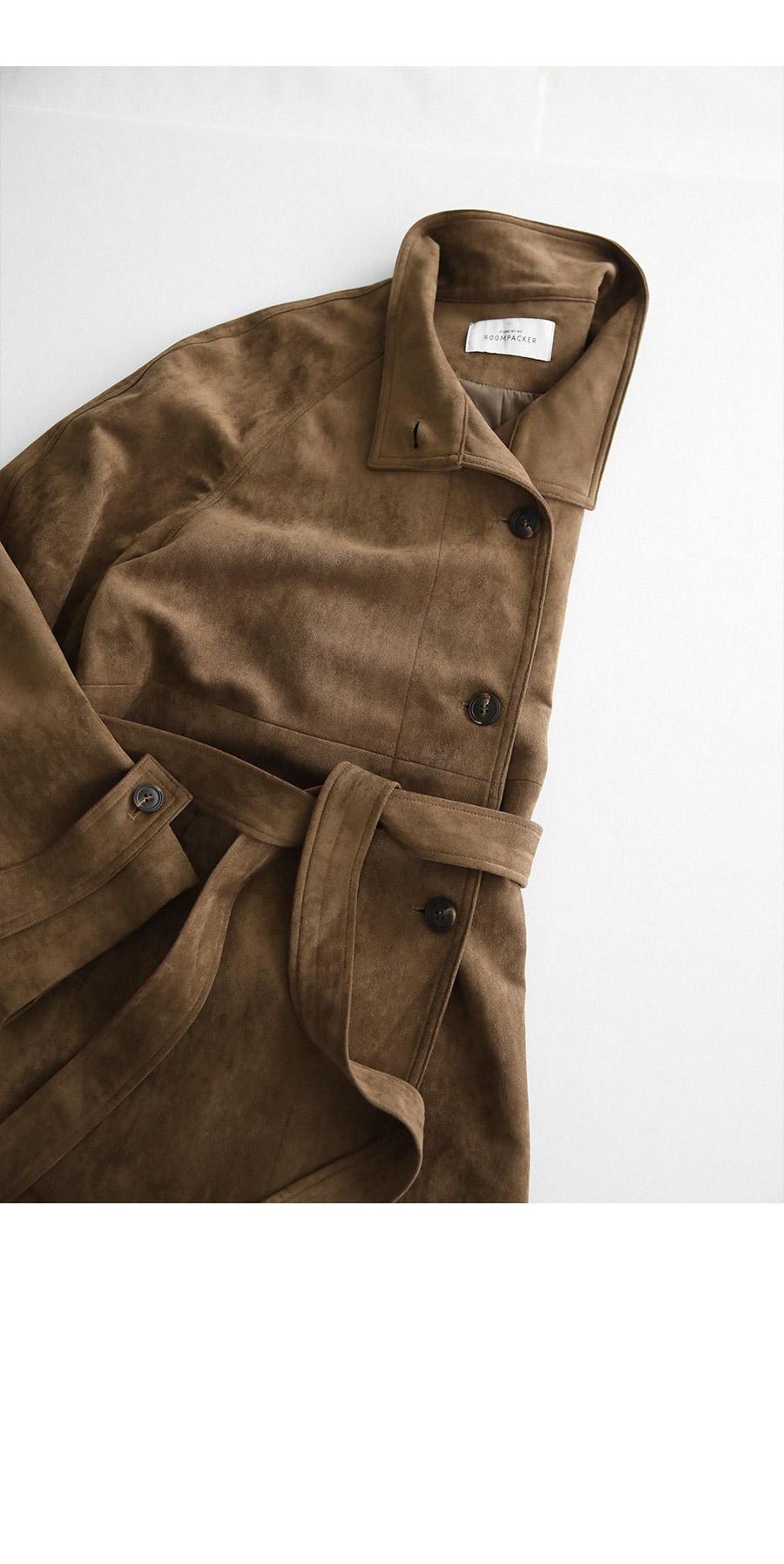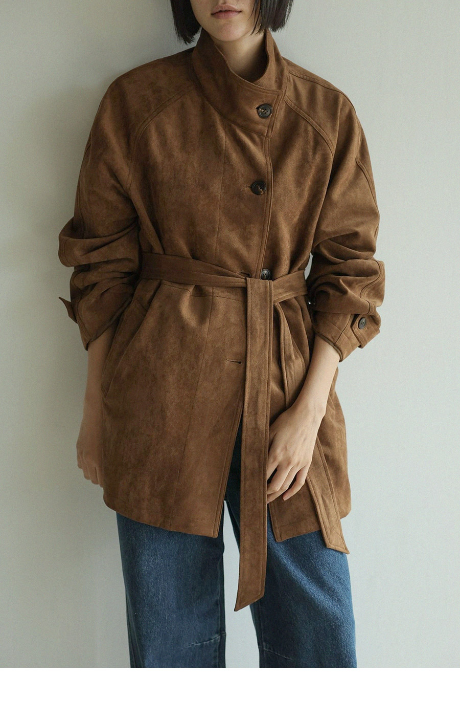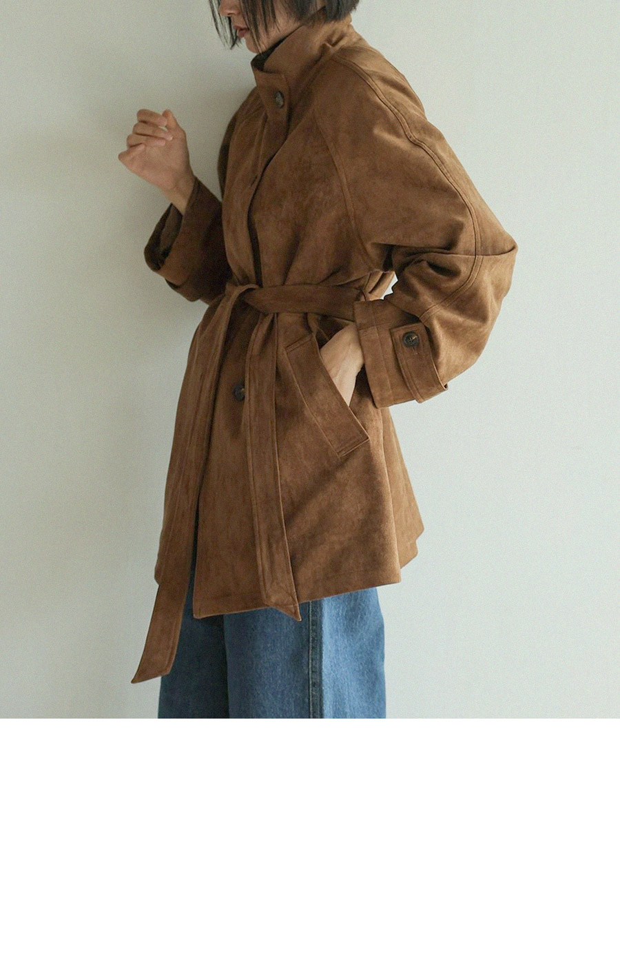 - 부드럽고 고급스러운 터치감의 스웨이드 텍스처로 완성된 하프 코트