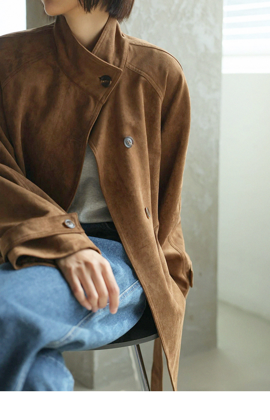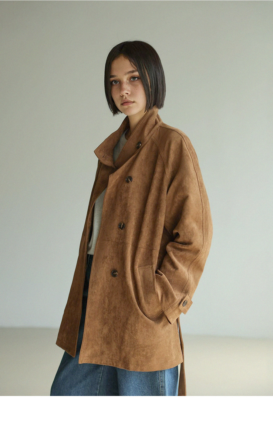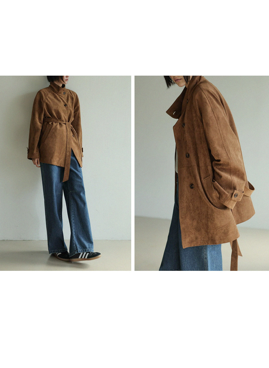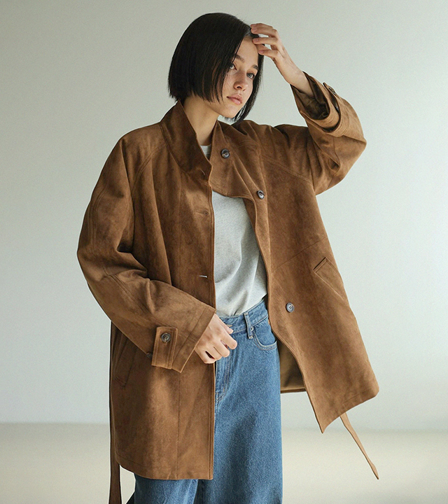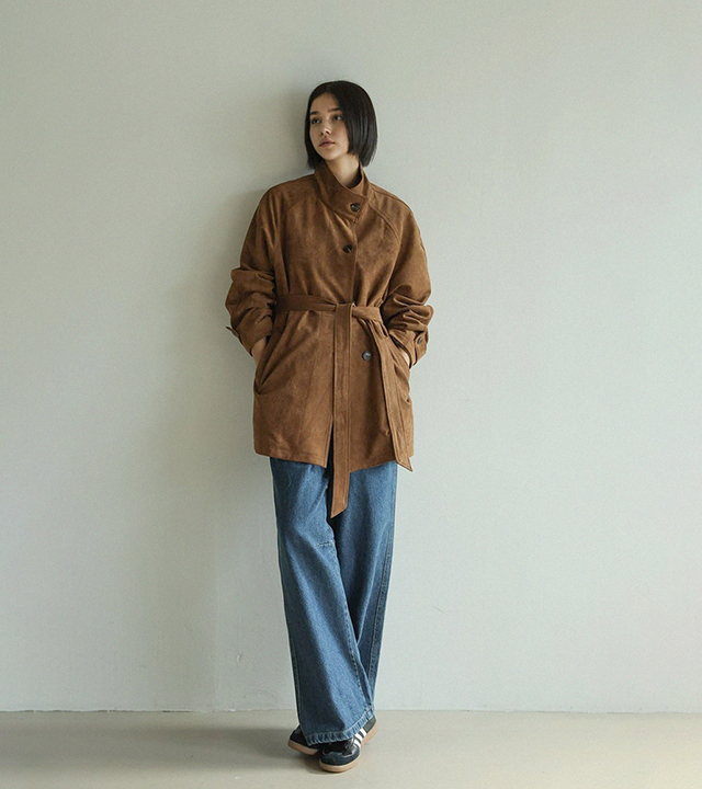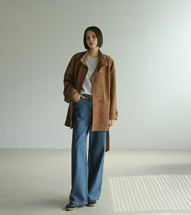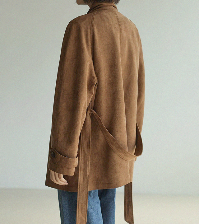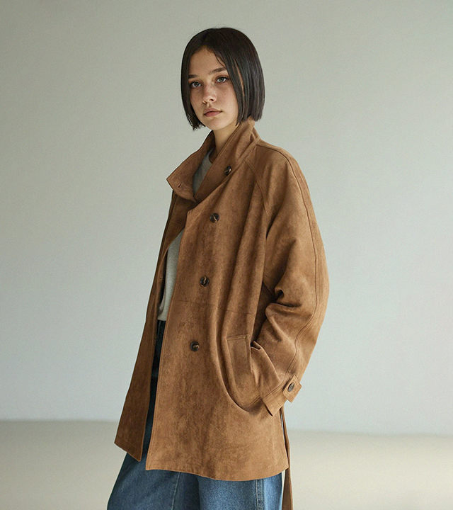 "스웨이드 텍스처와 루즈핏 실루엣으로 세련된 무드를 담은 하프 코트"