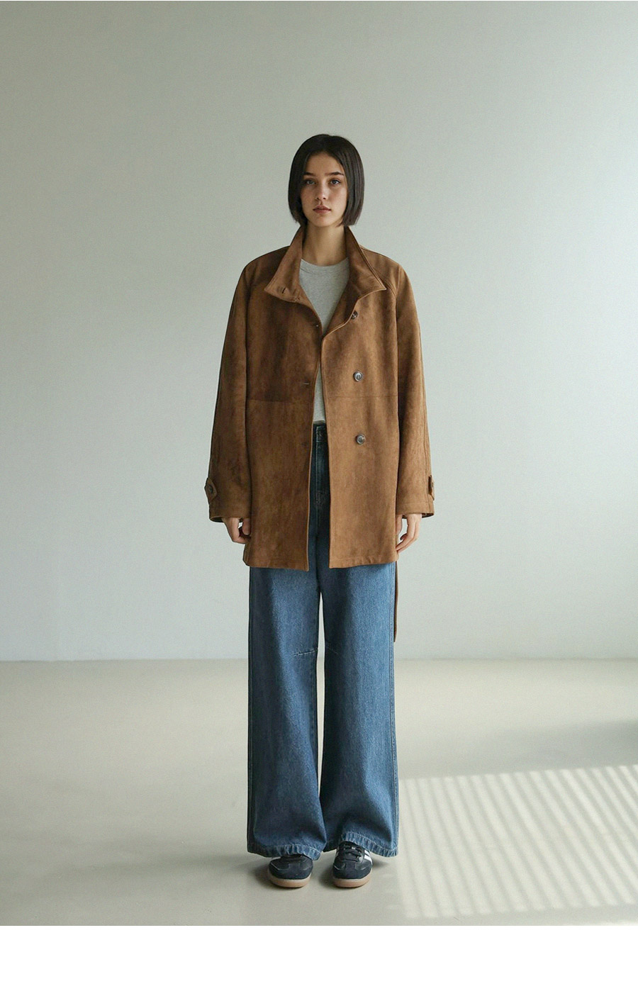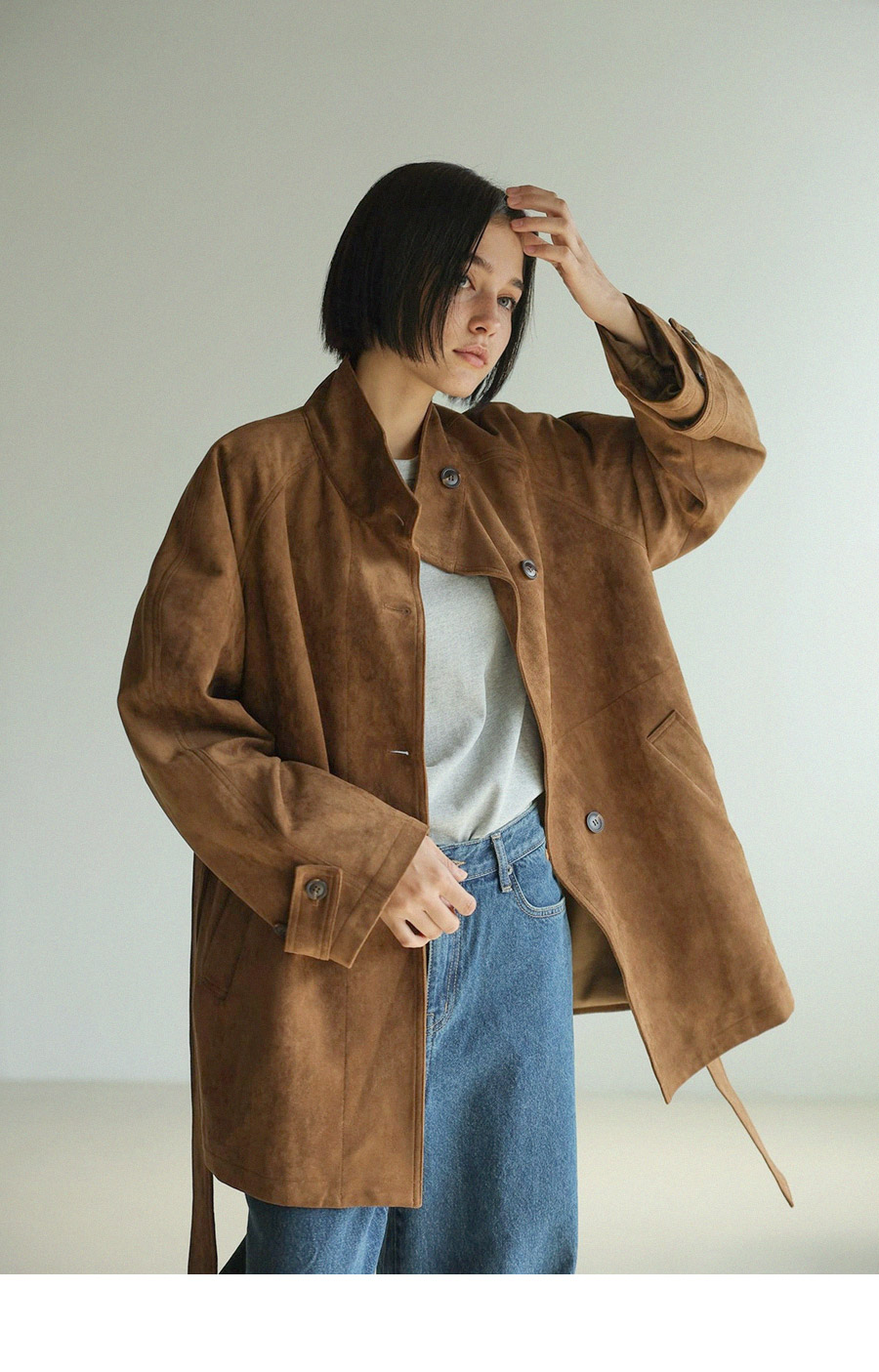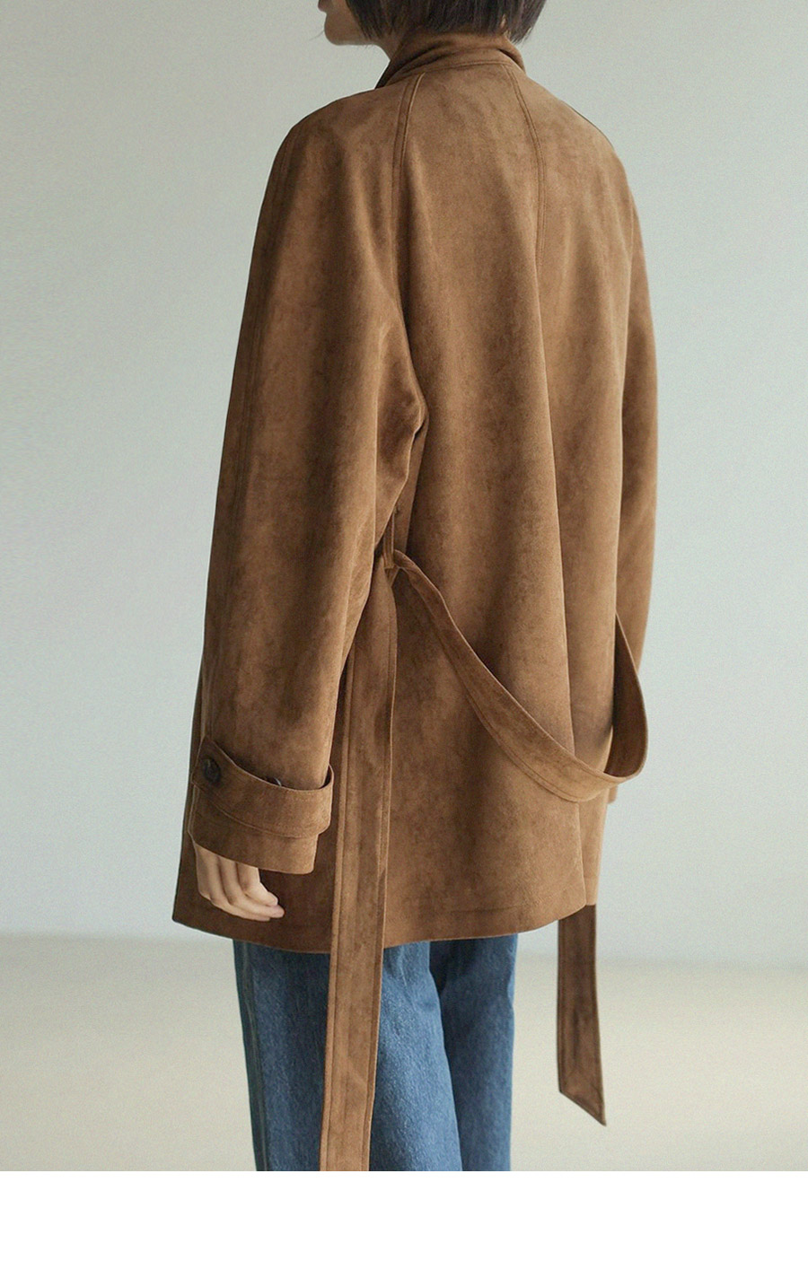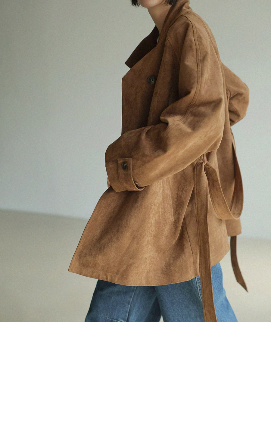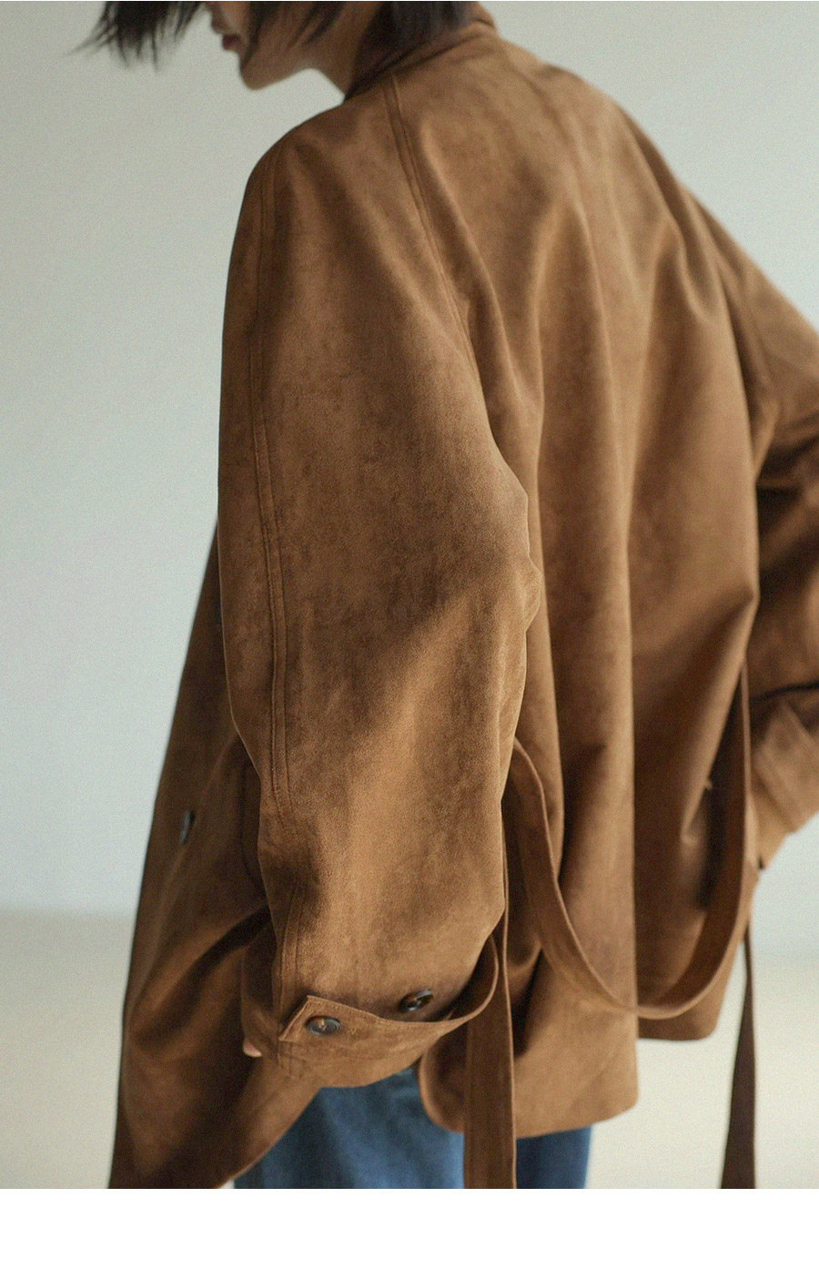 "스웨이드 텍스처와 루즈핏 실루엣으로 세련된 무드를 담은 하프 코트"
