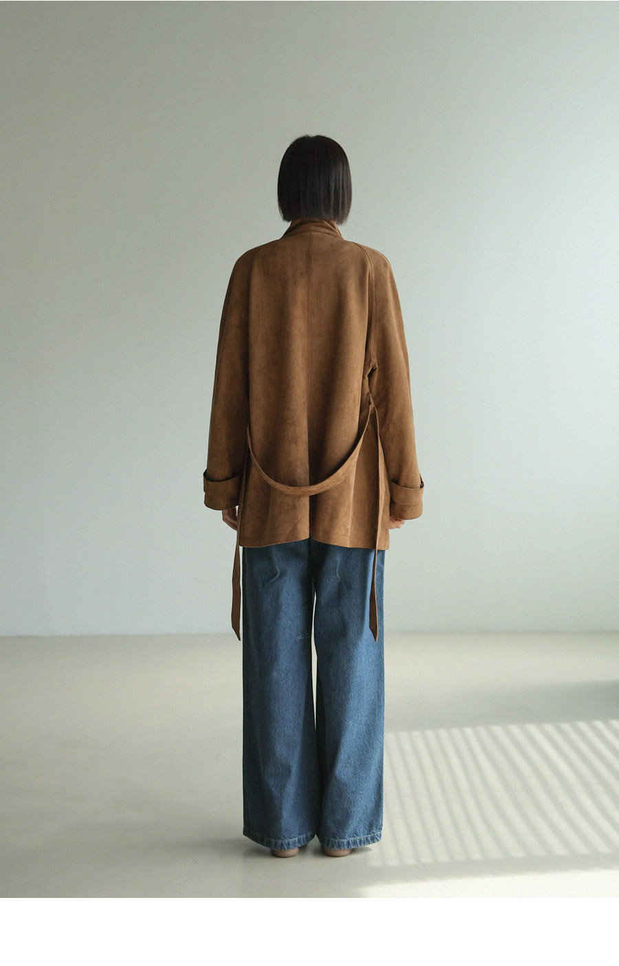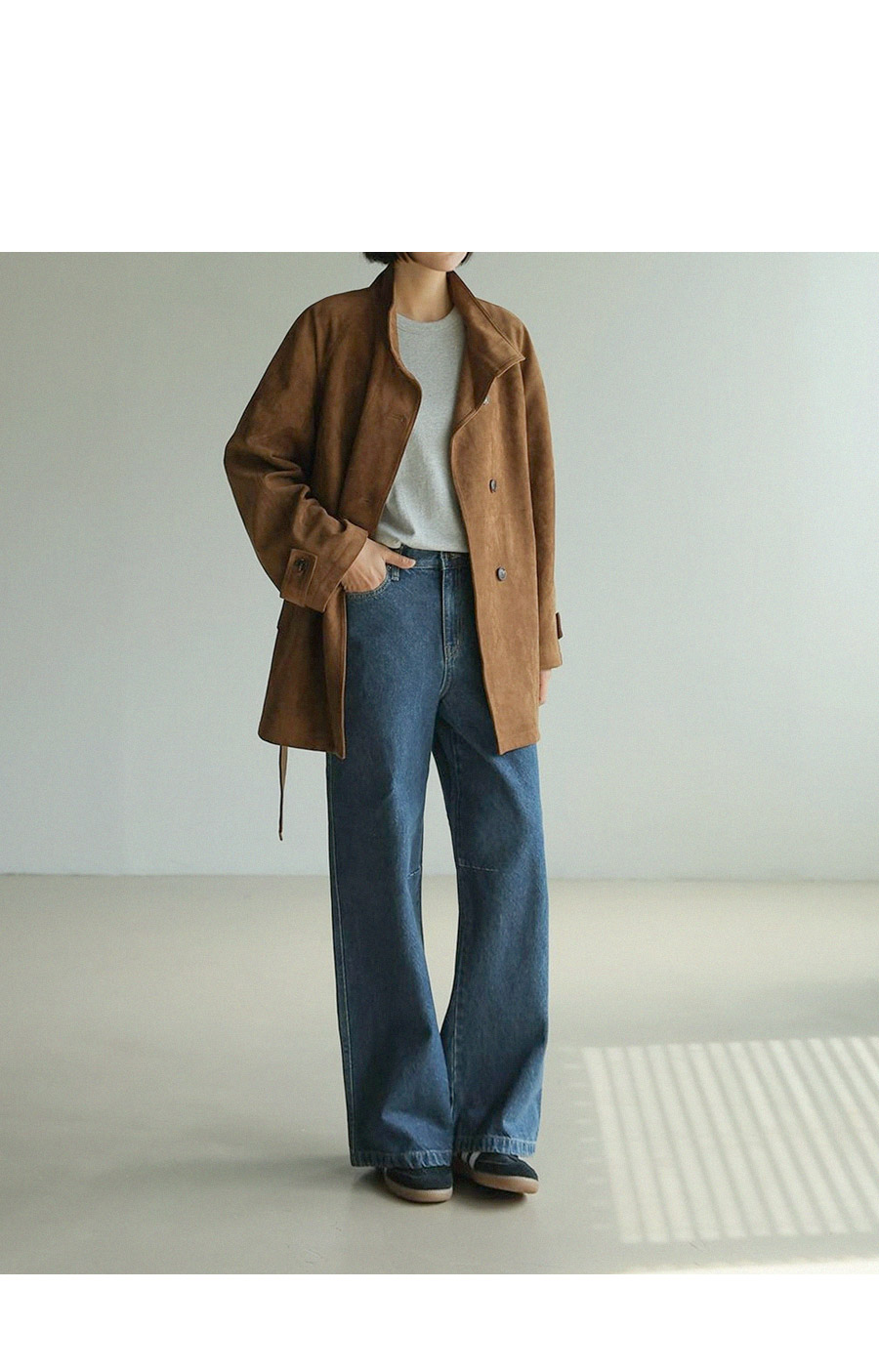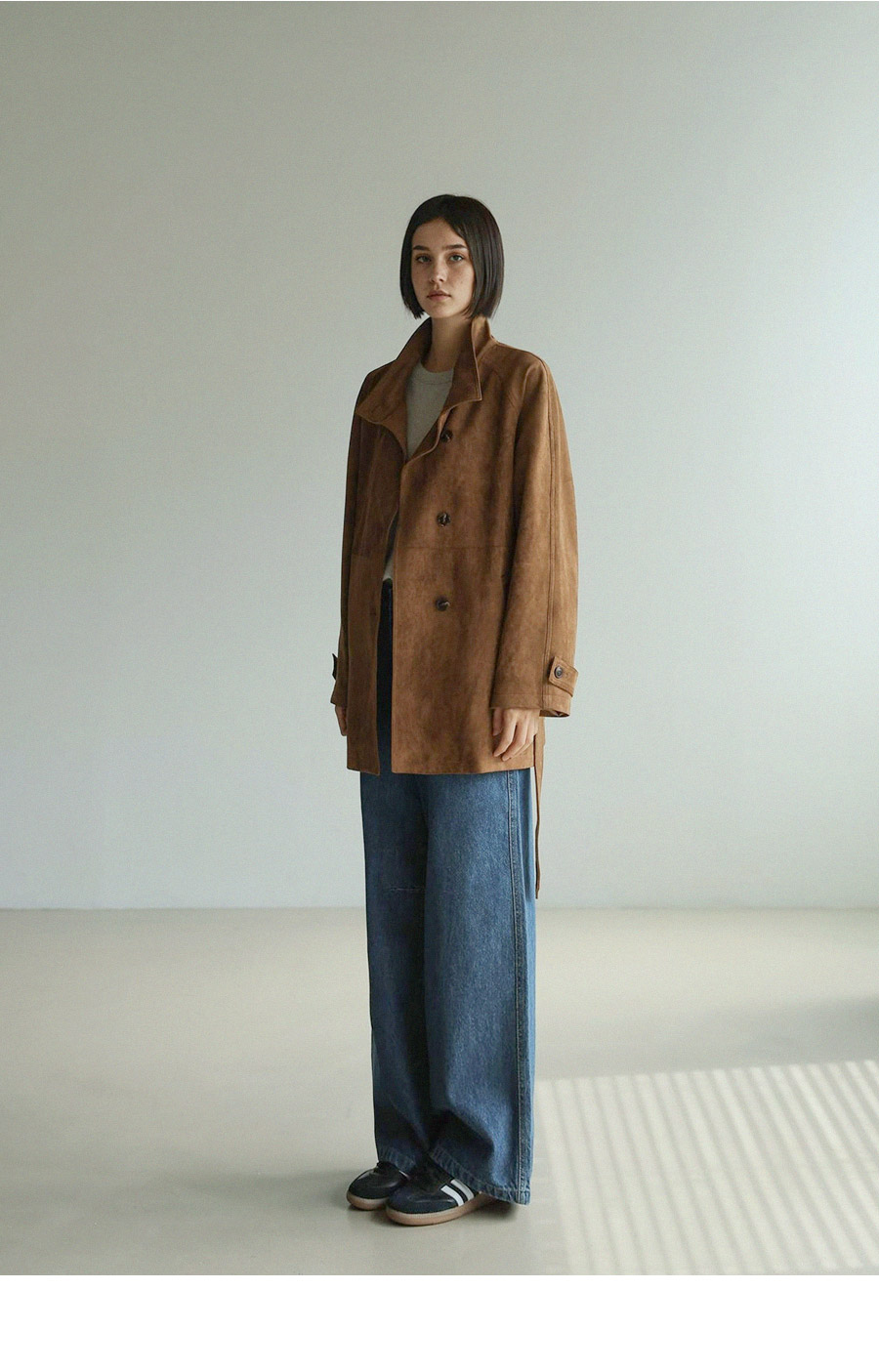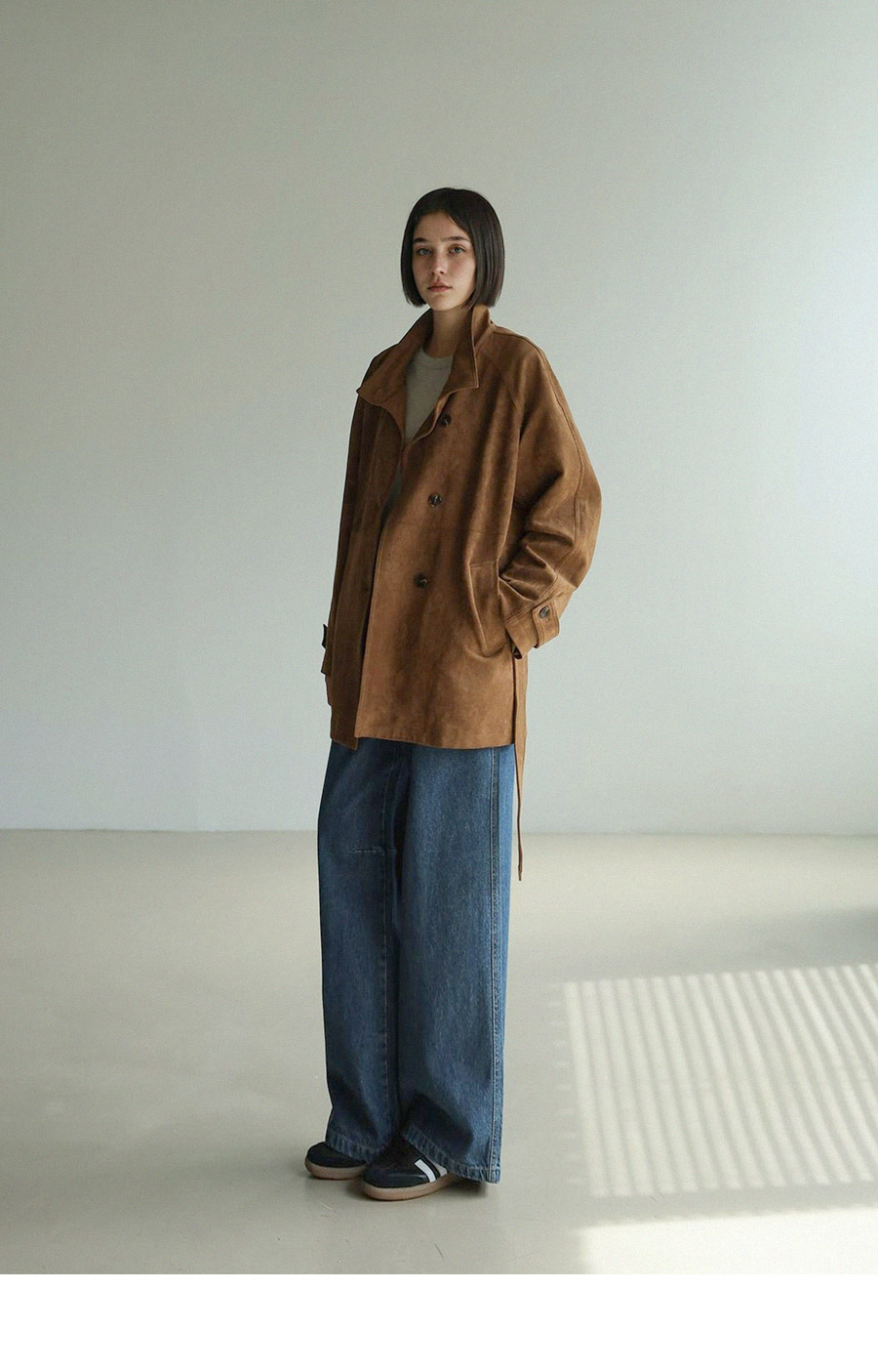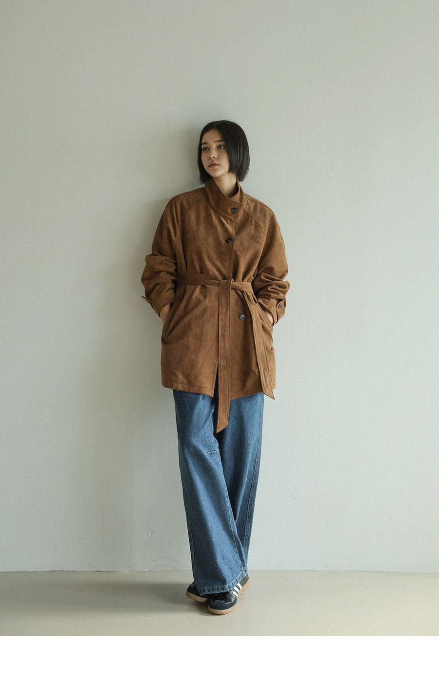 "스웨이드 텍스처와 루즈핏 실루엣으로 세련된 무드를 담은 하프 코트"