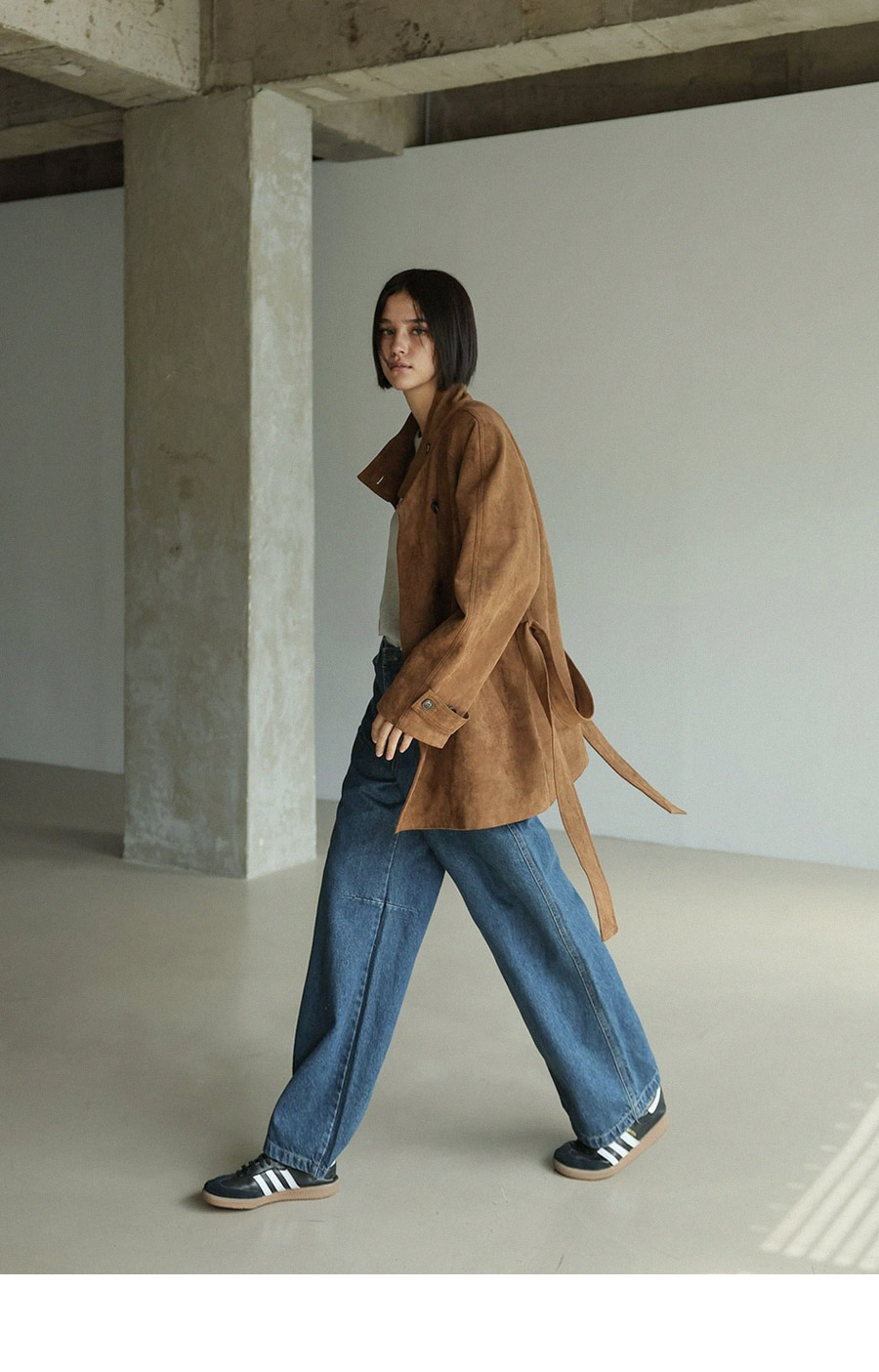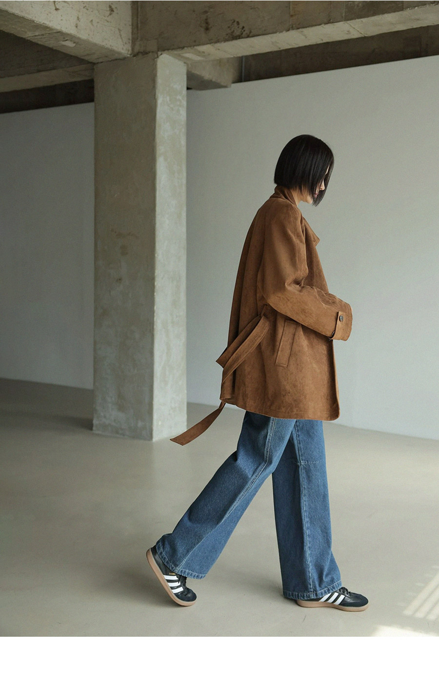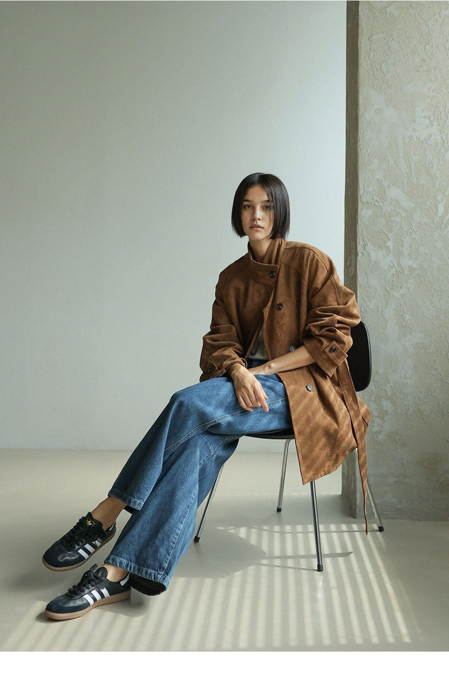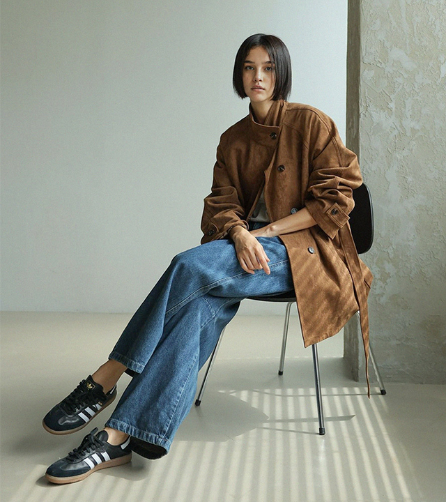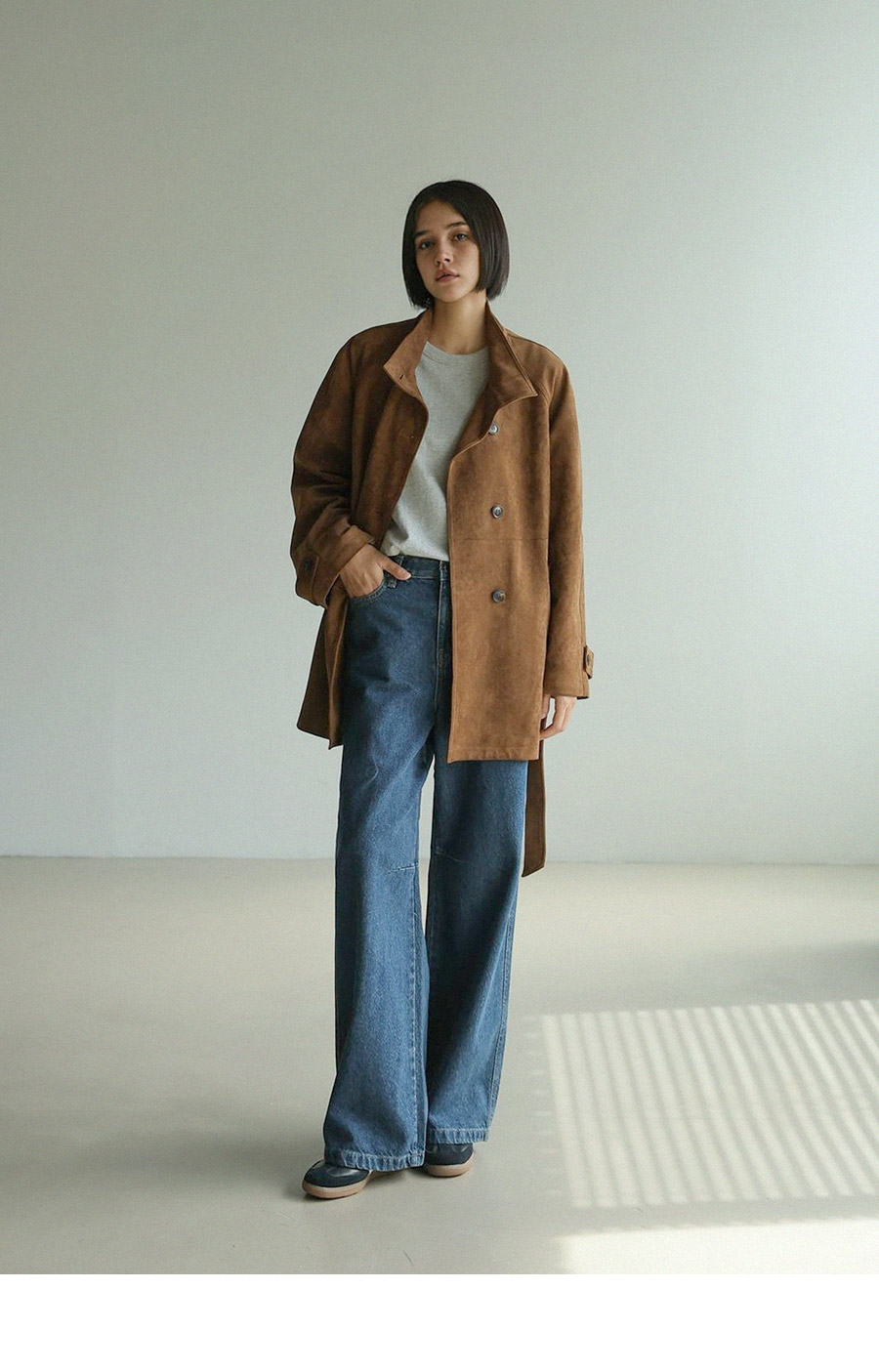 "스웨이드 텍스처와 루즈핏 실루엣으로 세련된 무드를 담은 하프 코트"