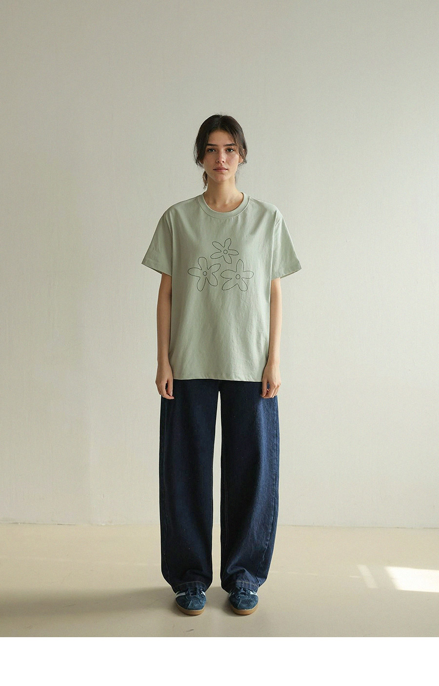 - 베이직한 실루엣으로 팬츠, 스커트 등 다양한 하의와 매치하기 좋은 티셔츠