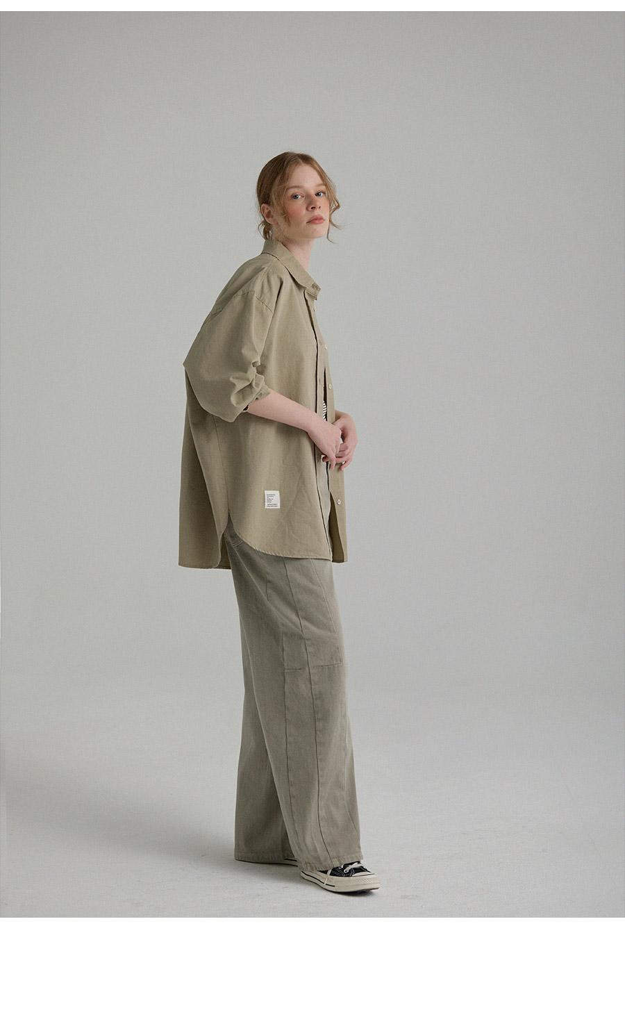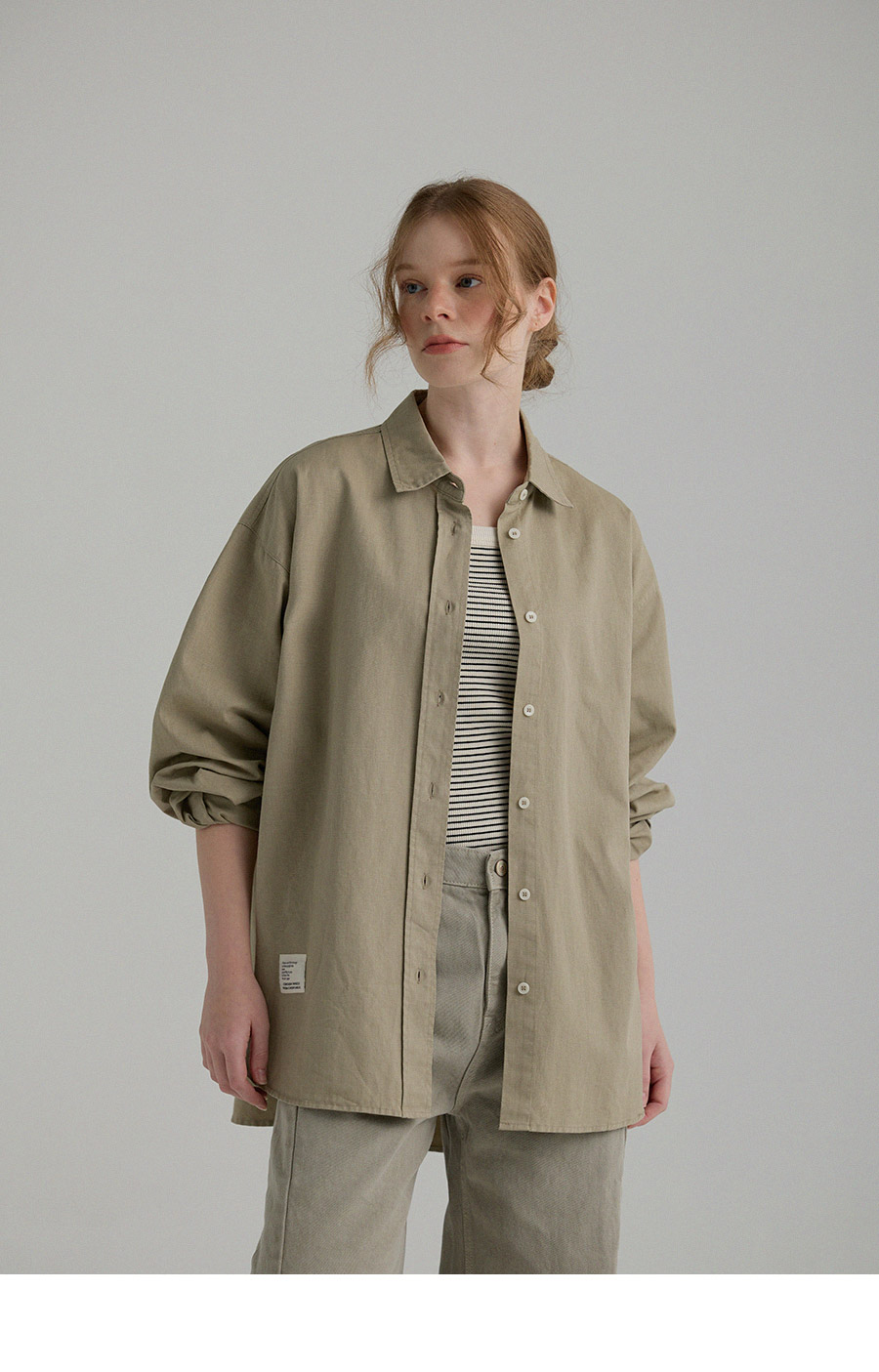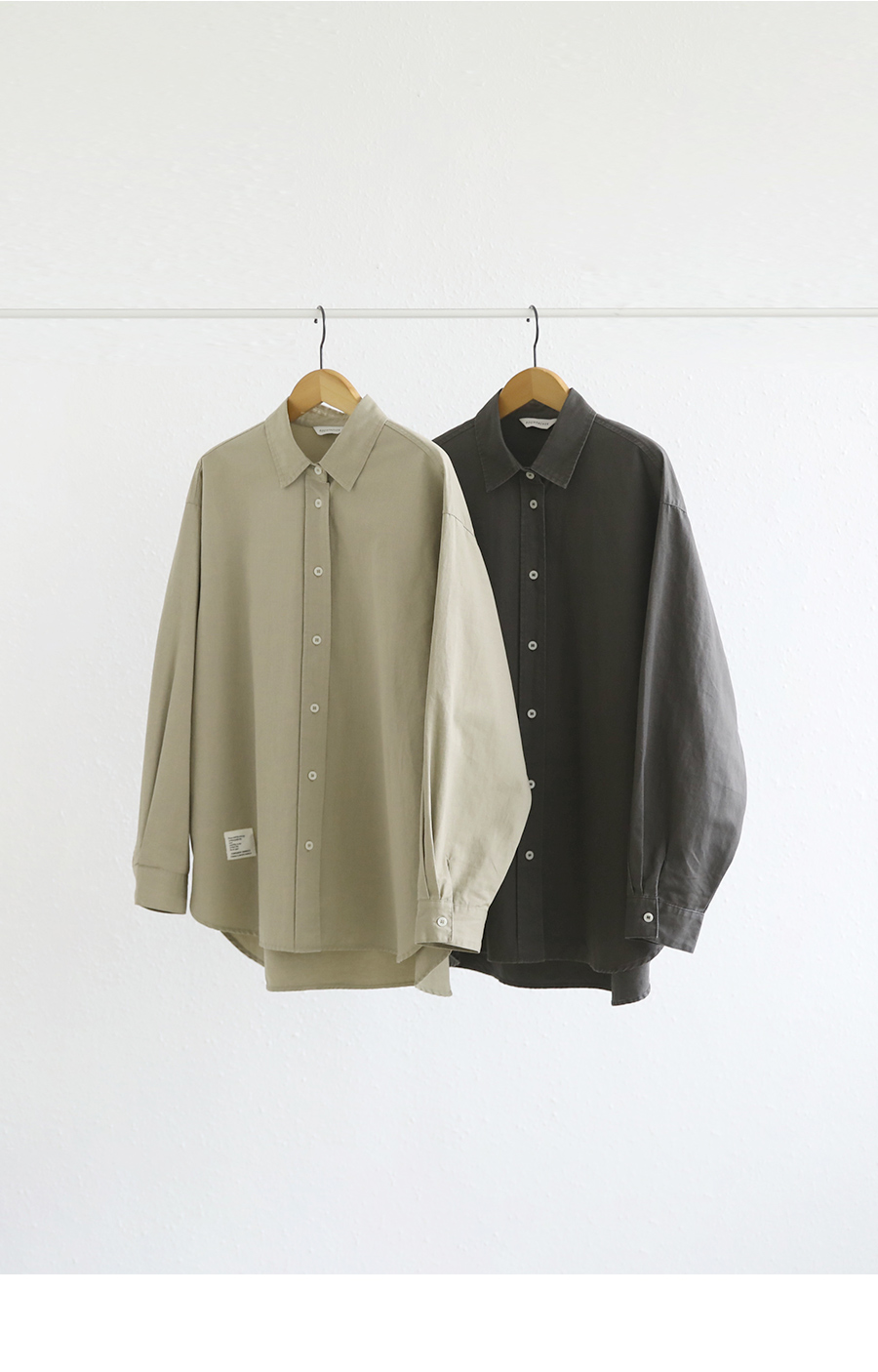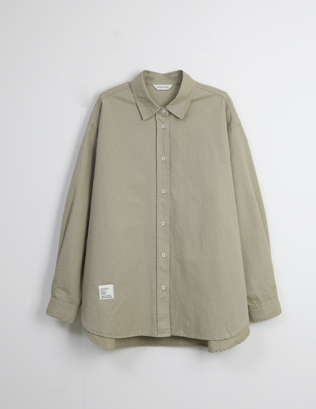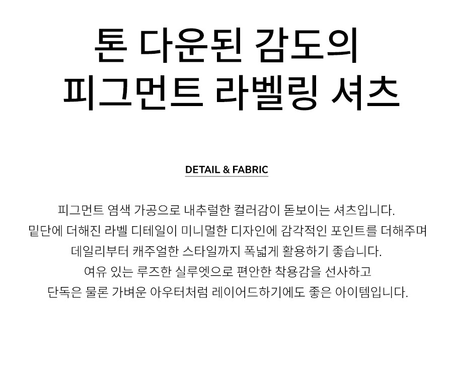"톤 다운된 감도의 피그먼트 라벨링 셔츠"