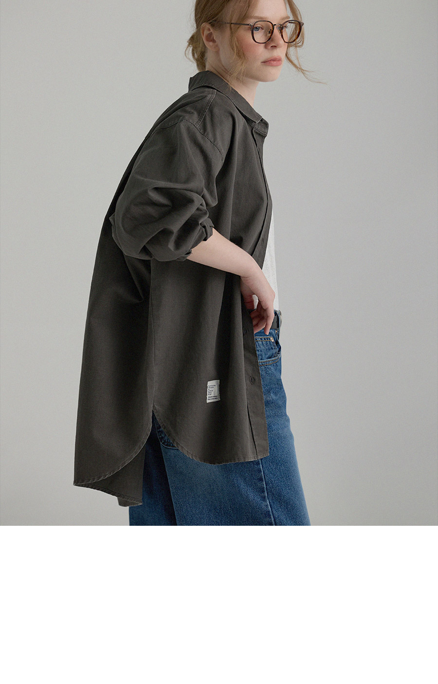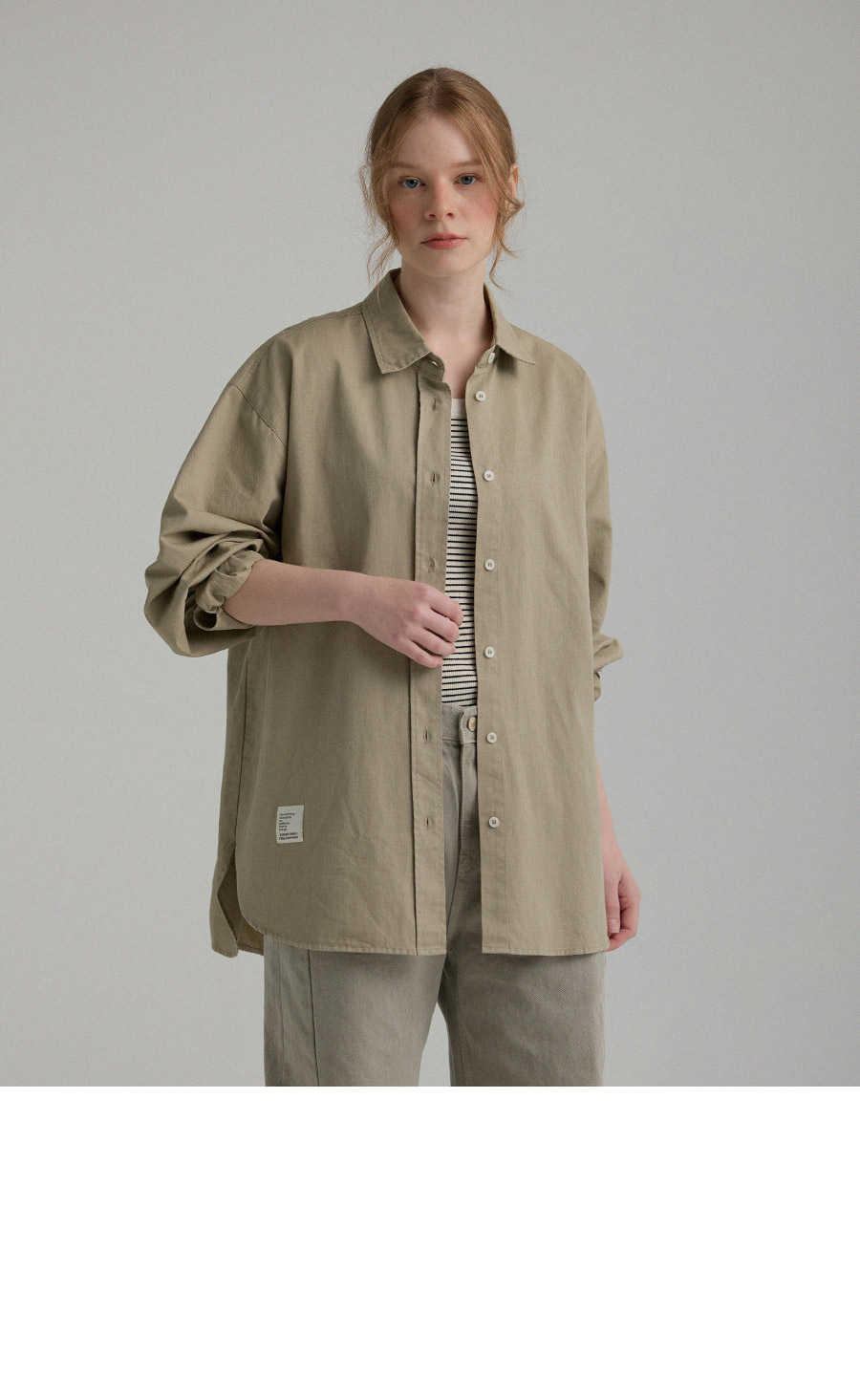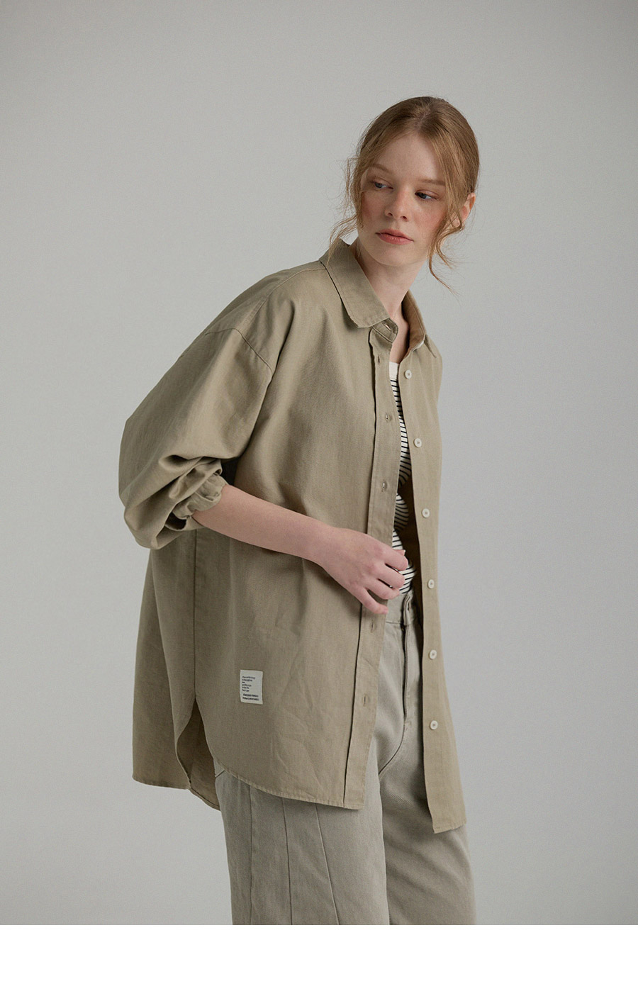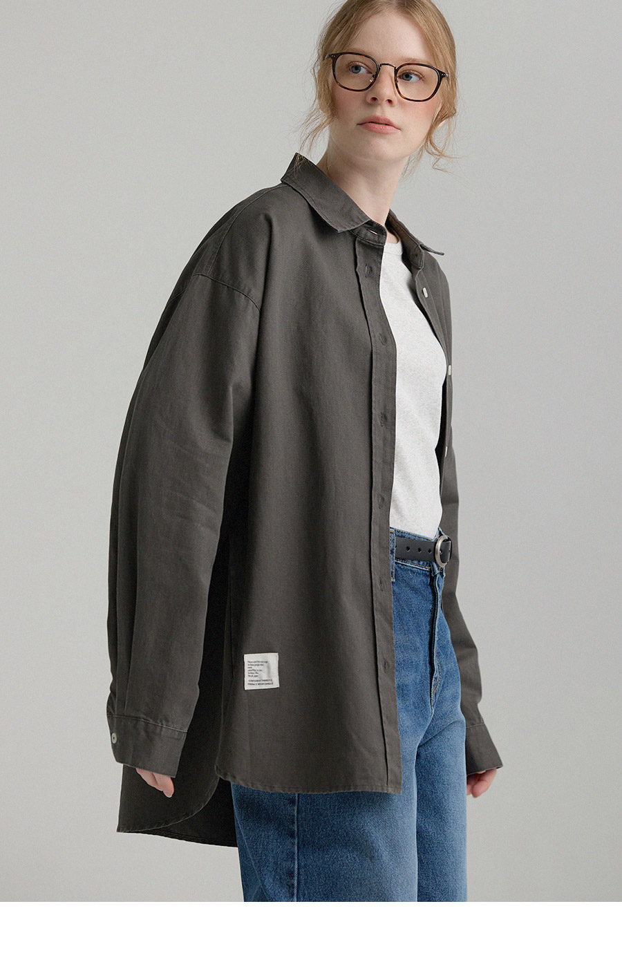 "톤 다운된 감도의 피그먼트 라벨링 셔츠"