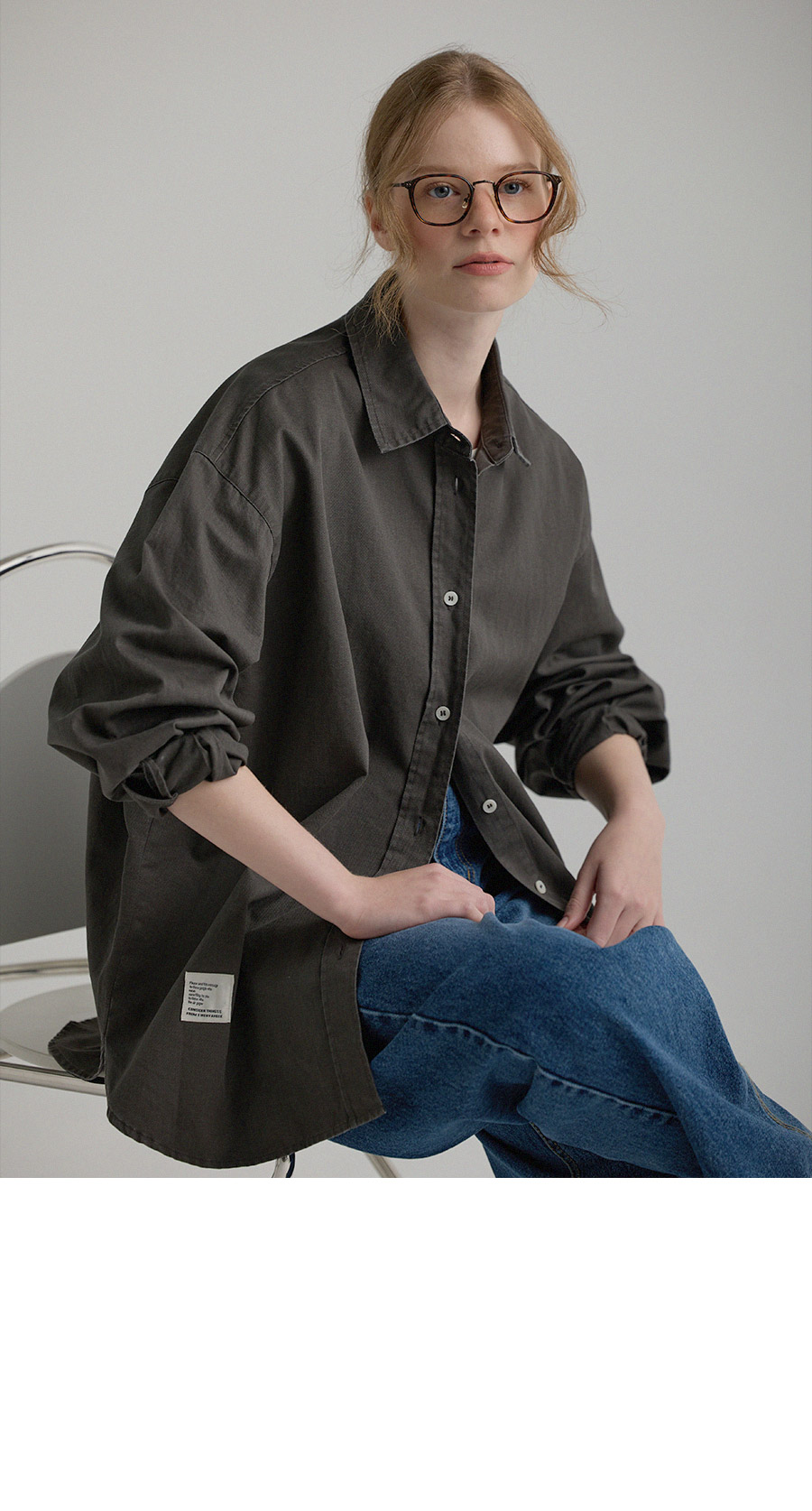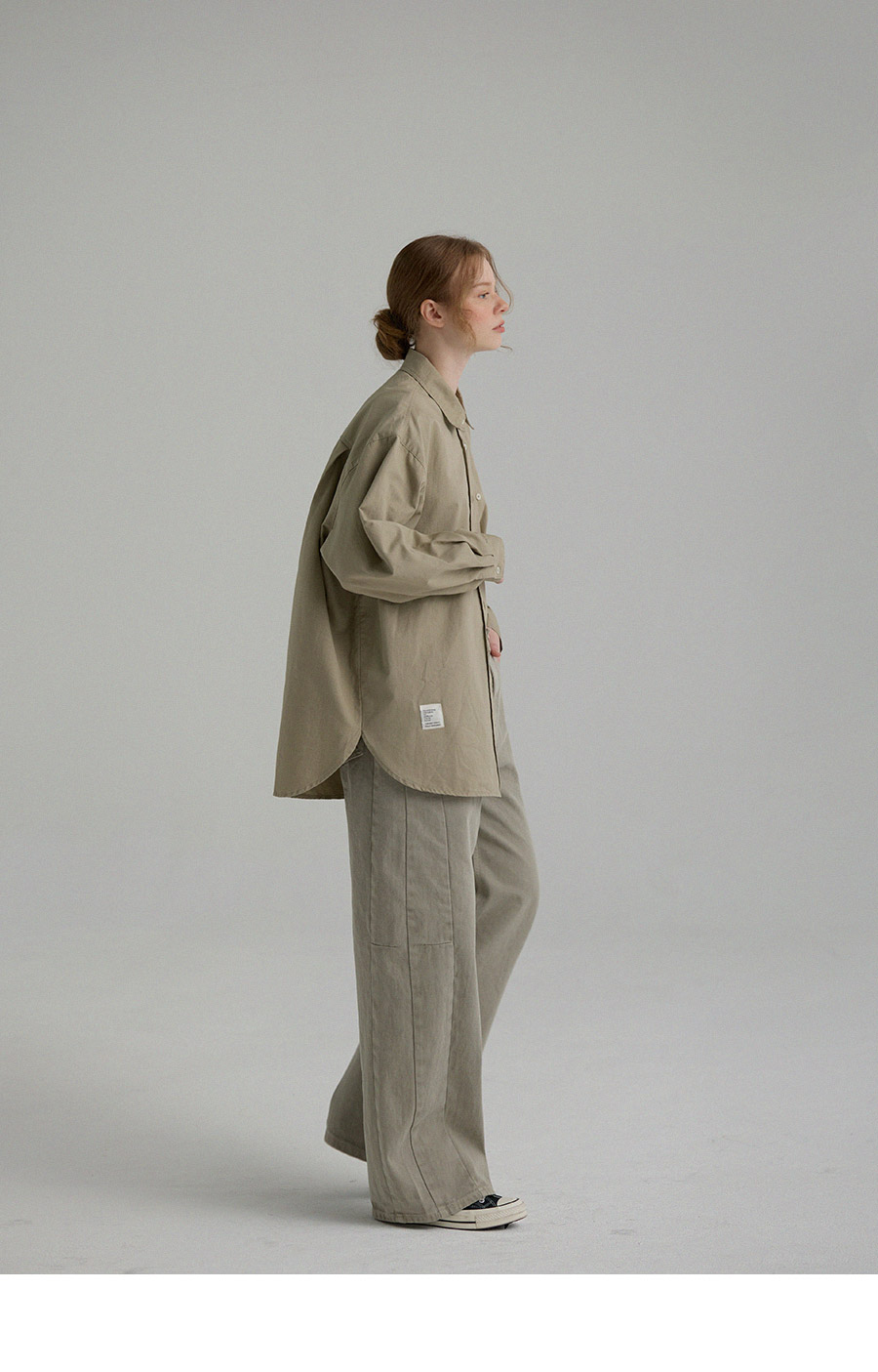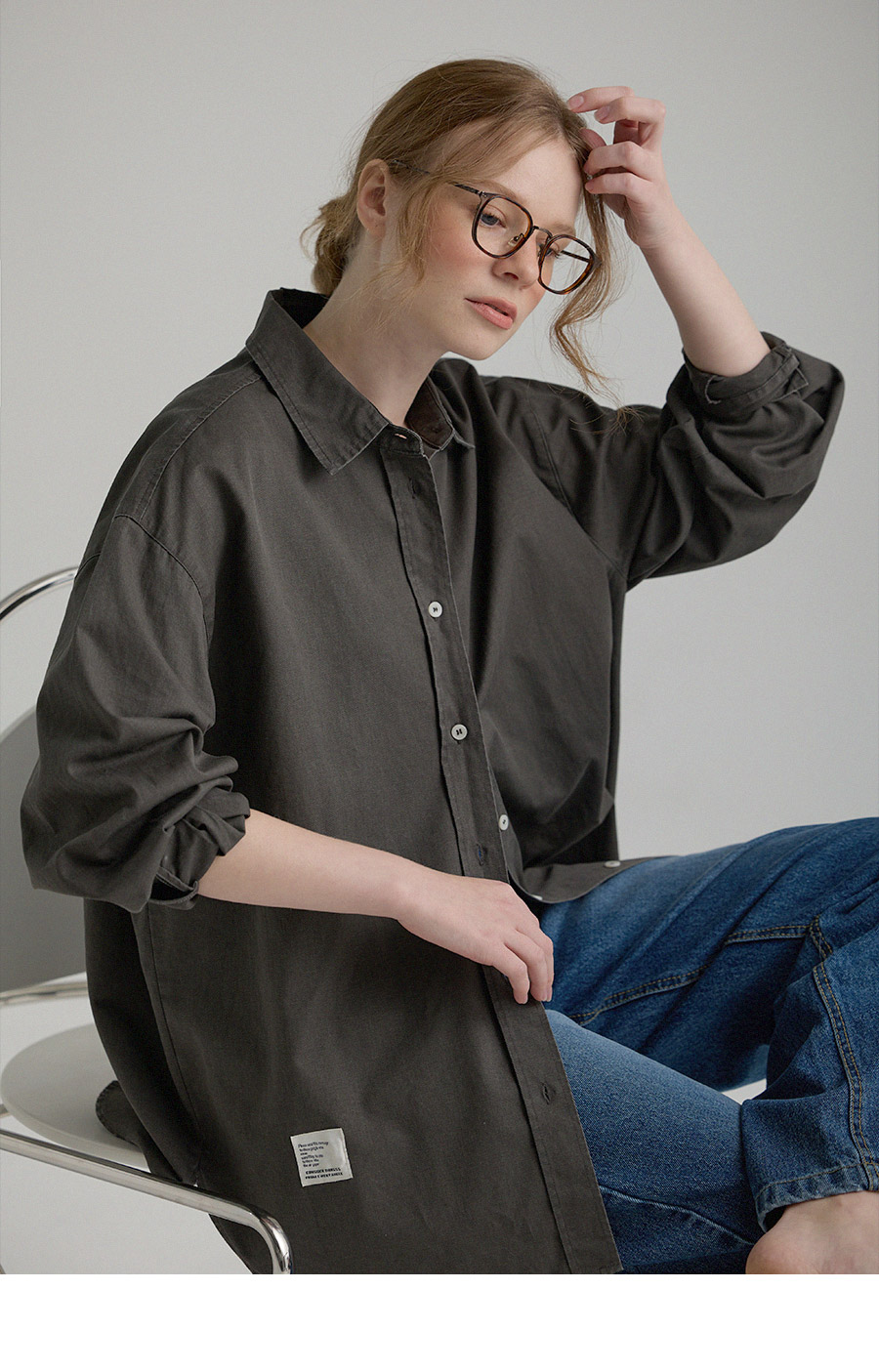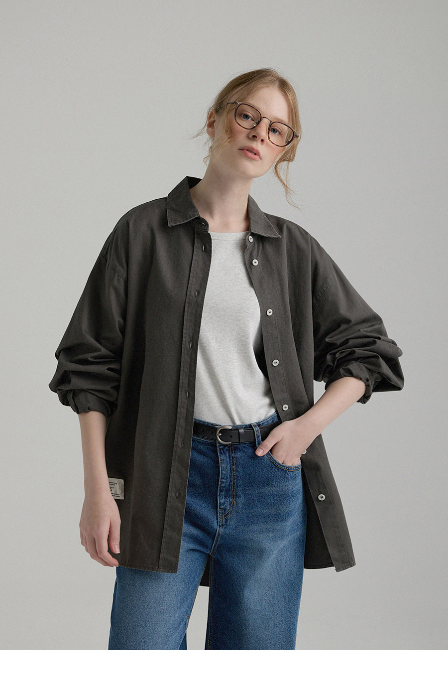 "톤 다운된 감도의 피그먼트 라벨링 셔츠"