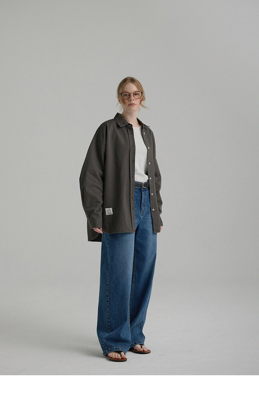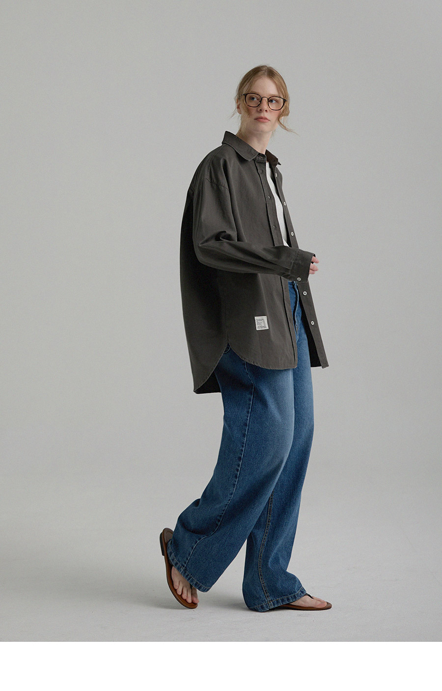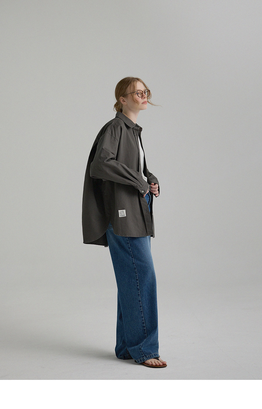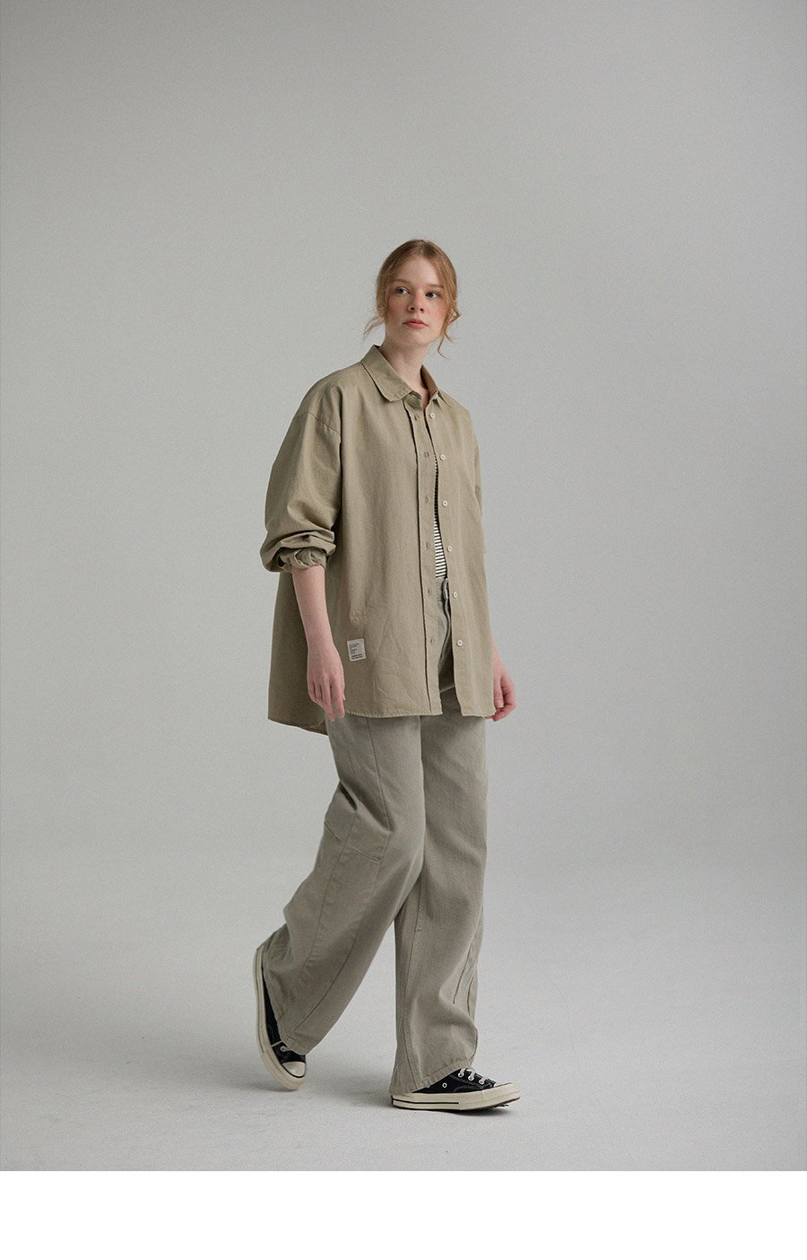 "톤 다운된 감도의 피그먼트 라벨링 셔츠"