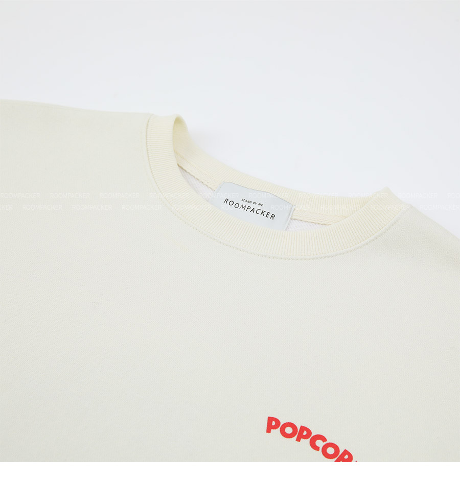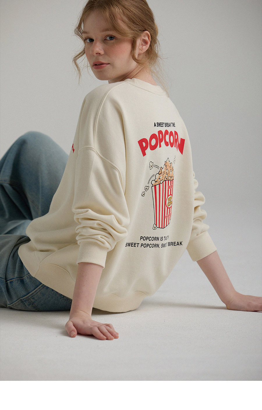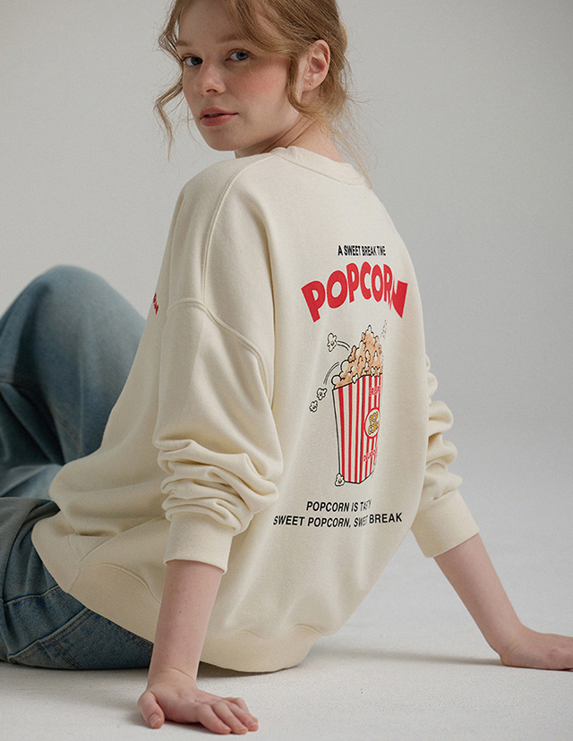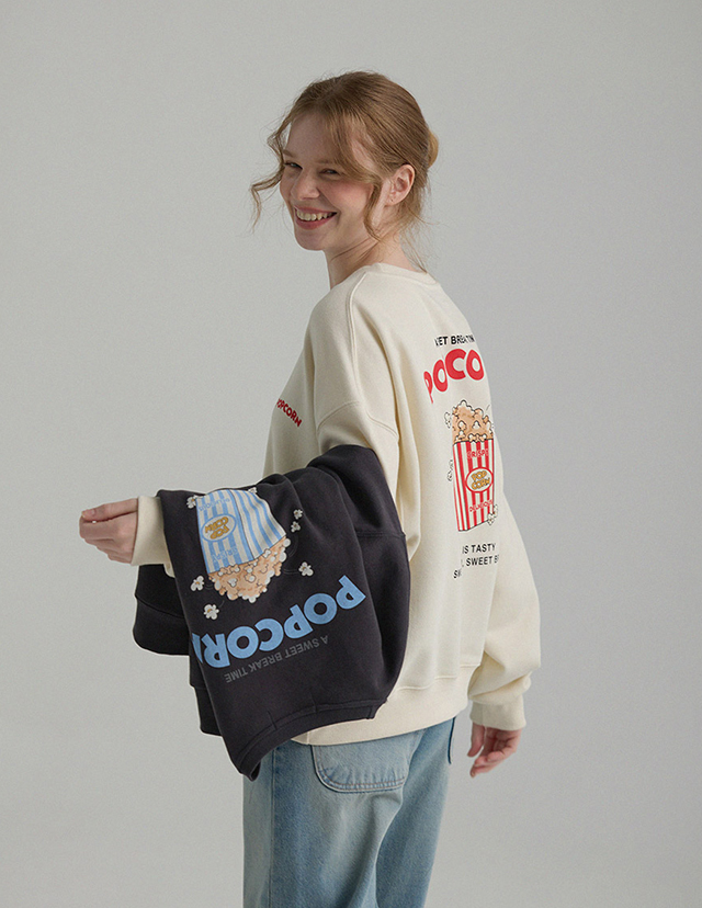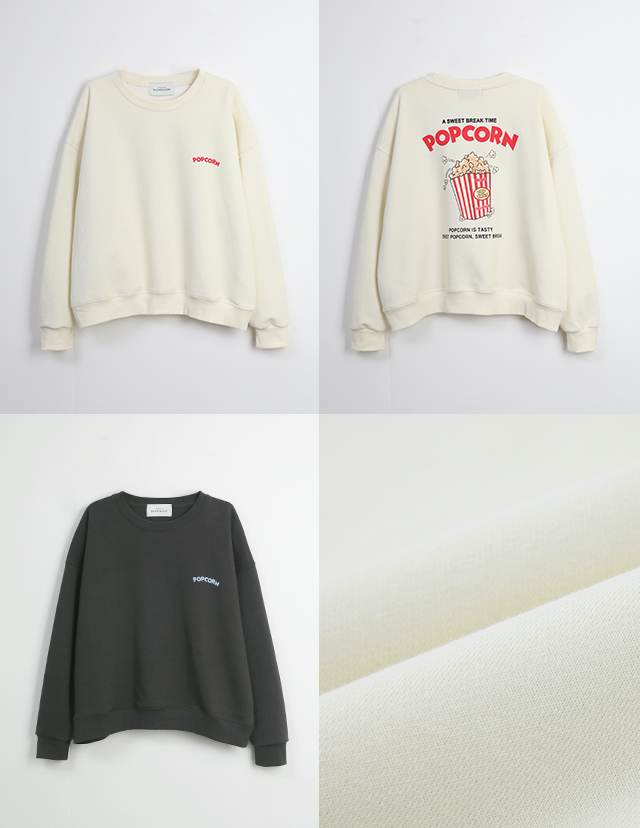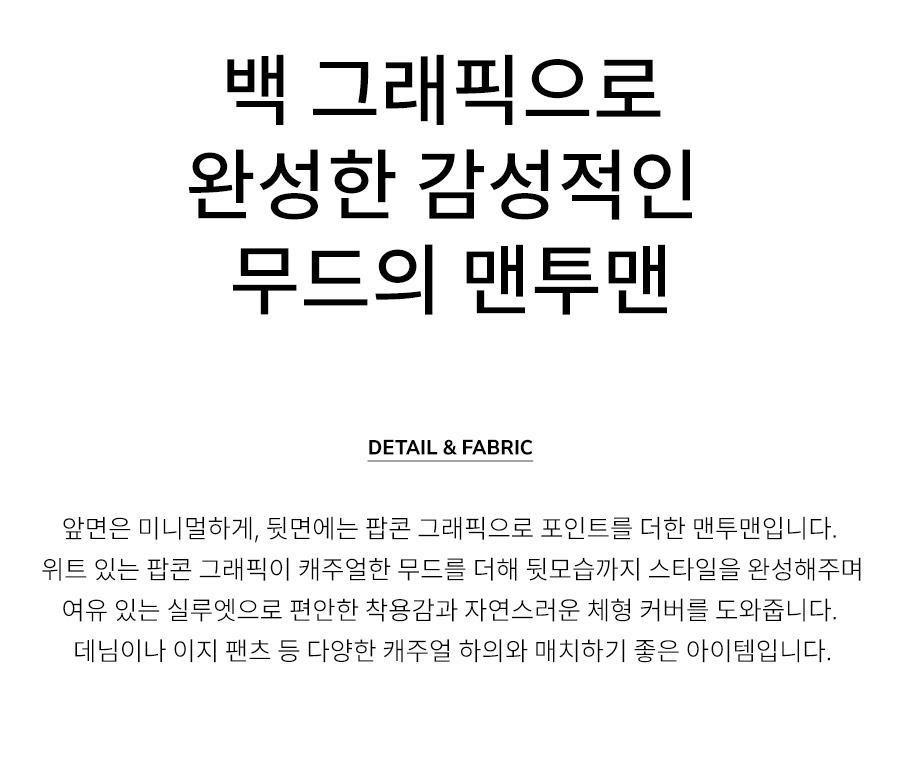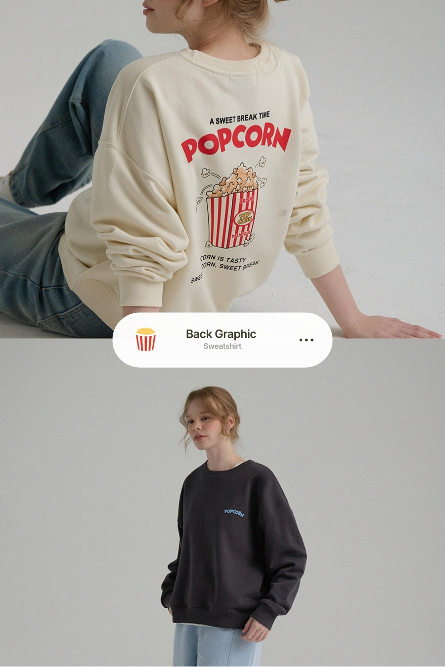 - 앞면은 미니멀하게 연출하고 뒷면에 팝콘그래픽으로 포인트를 준 맨투맨