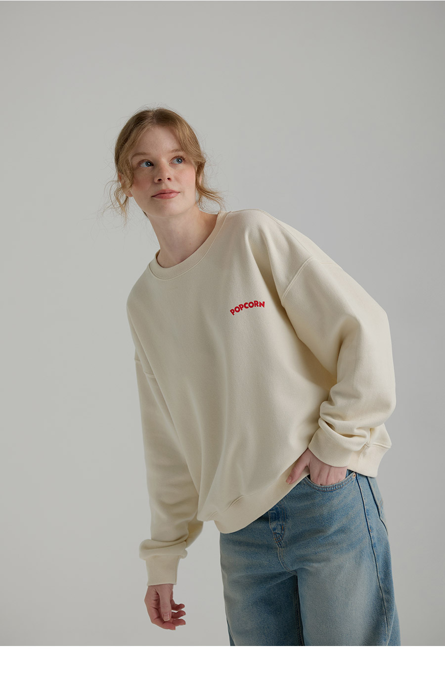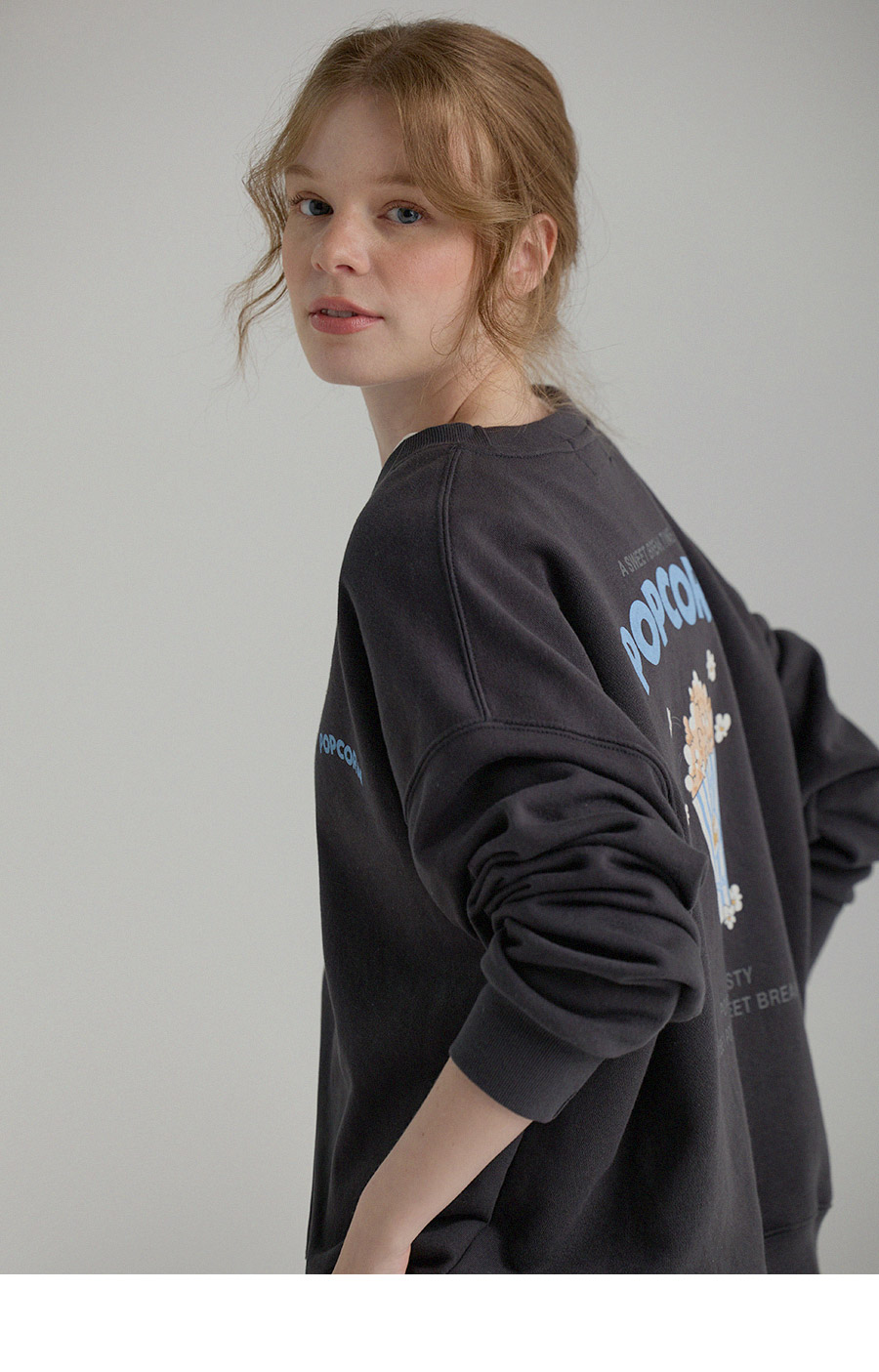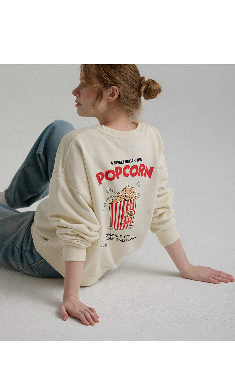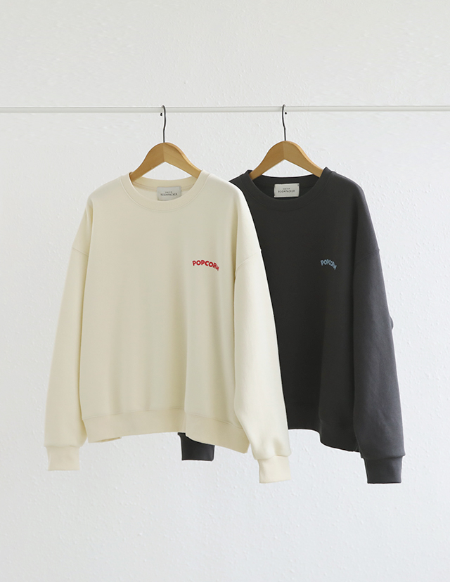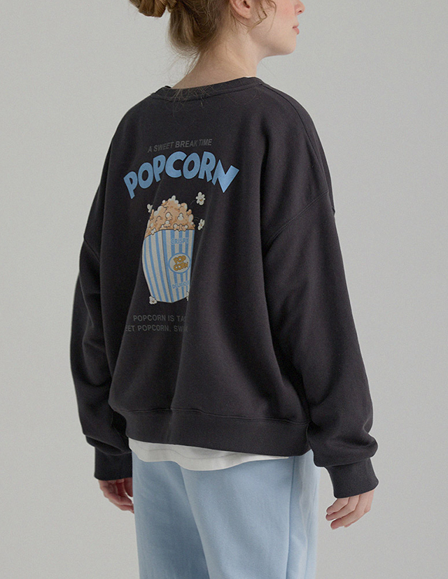 - 앞면은 미니멀하게 연출하고 뒷면에 팝콘그래픽으로 포인트를 준 맨투맨