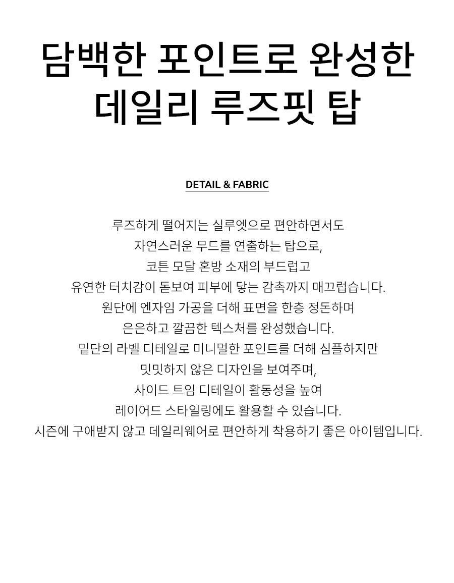 - 루즈하게 떨어지는 실루엣으로 편안하면서도 자연스러운 무드를 연출하는 탑