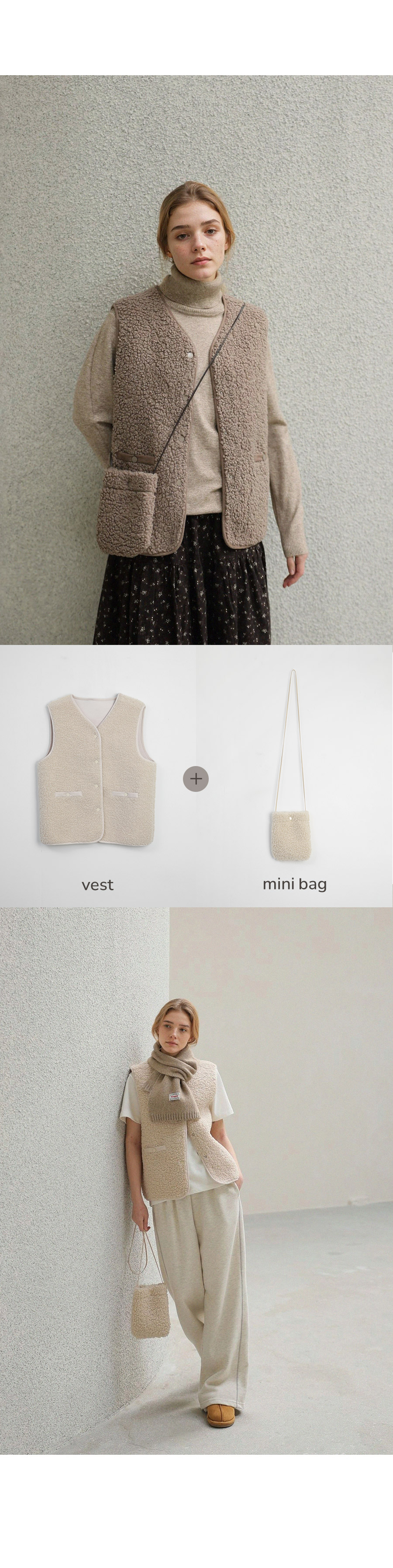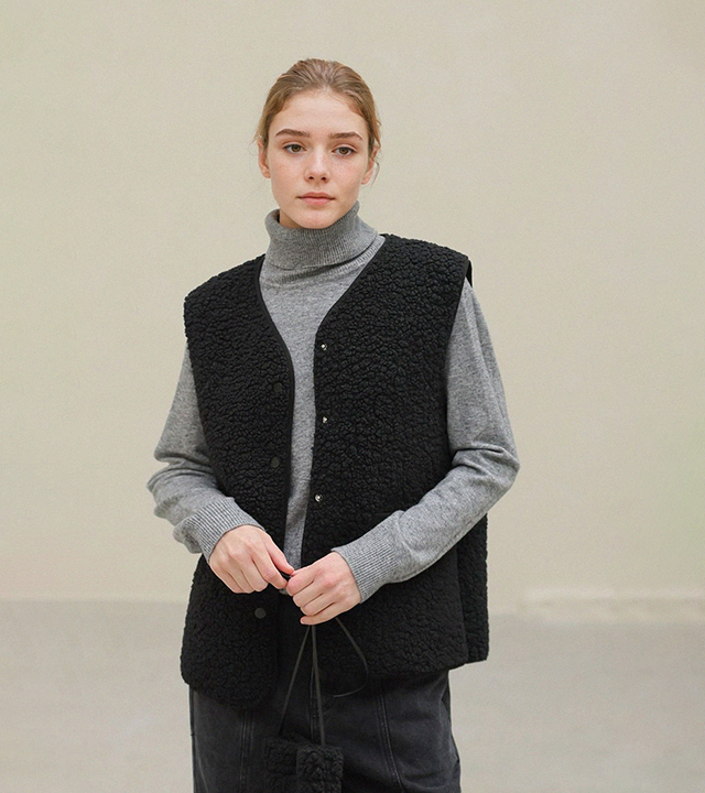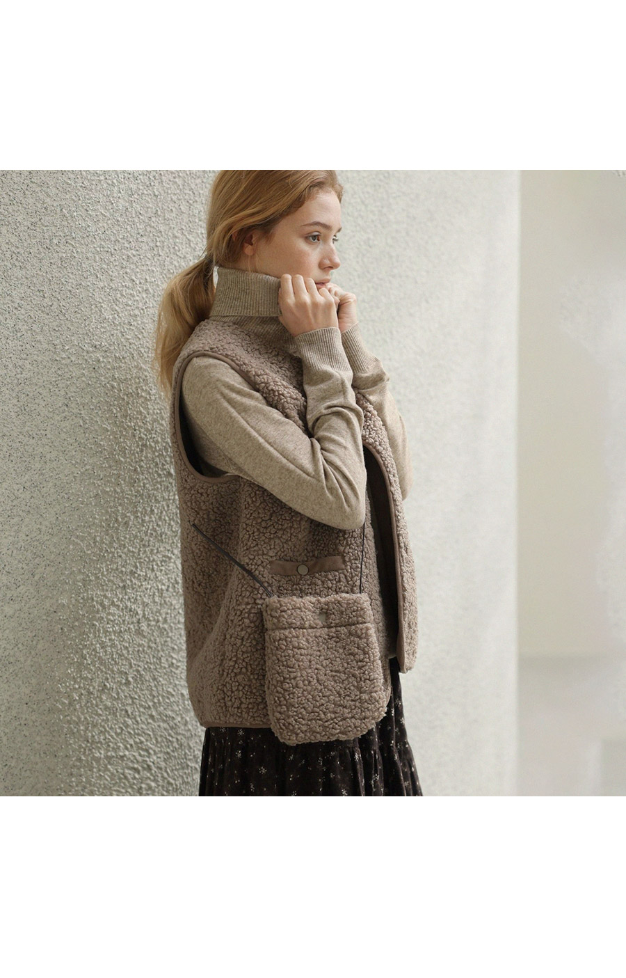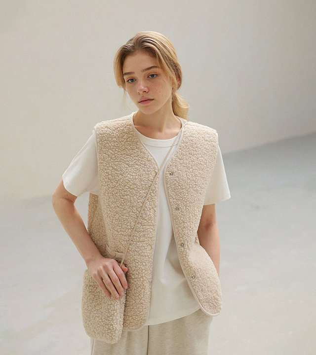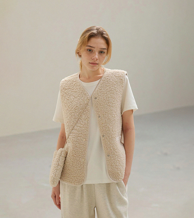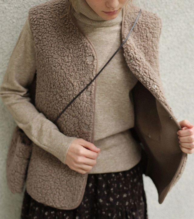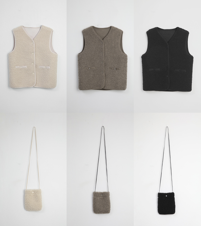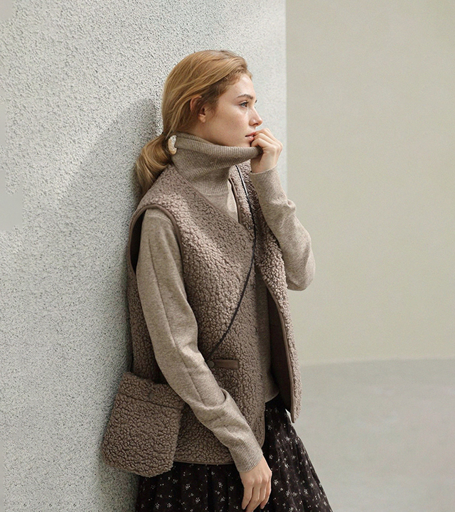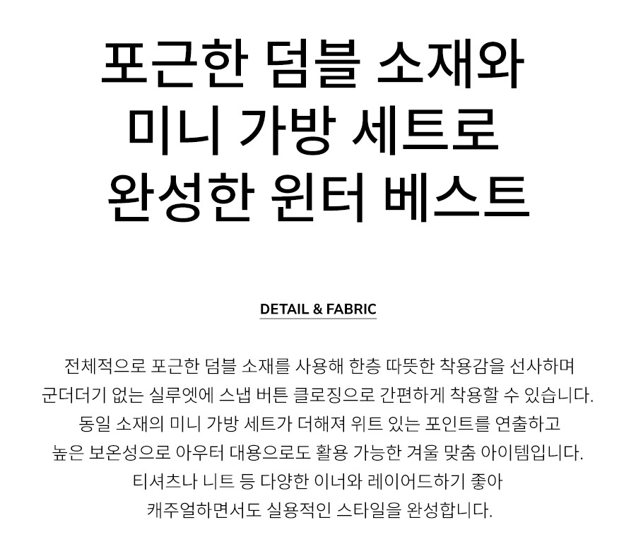 "포근한 덤블 소재와 미니 가방 세트로 완성한 윈터 베스트"
