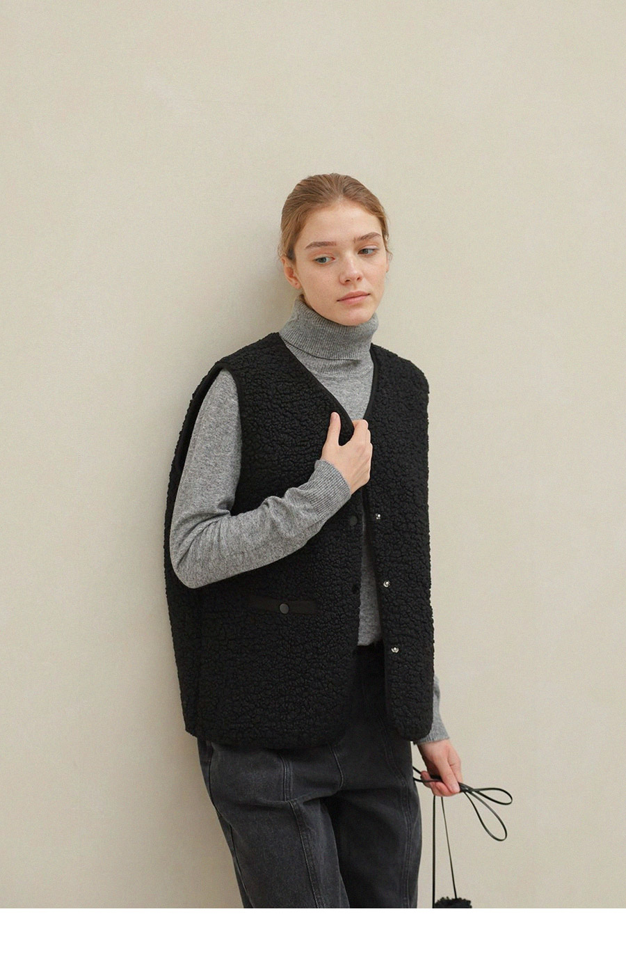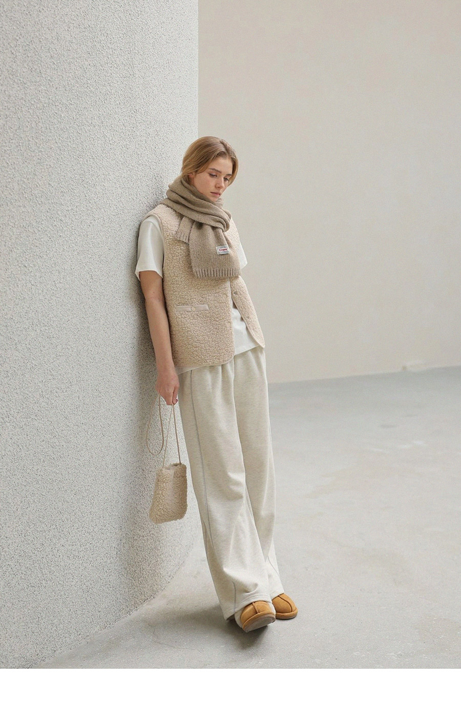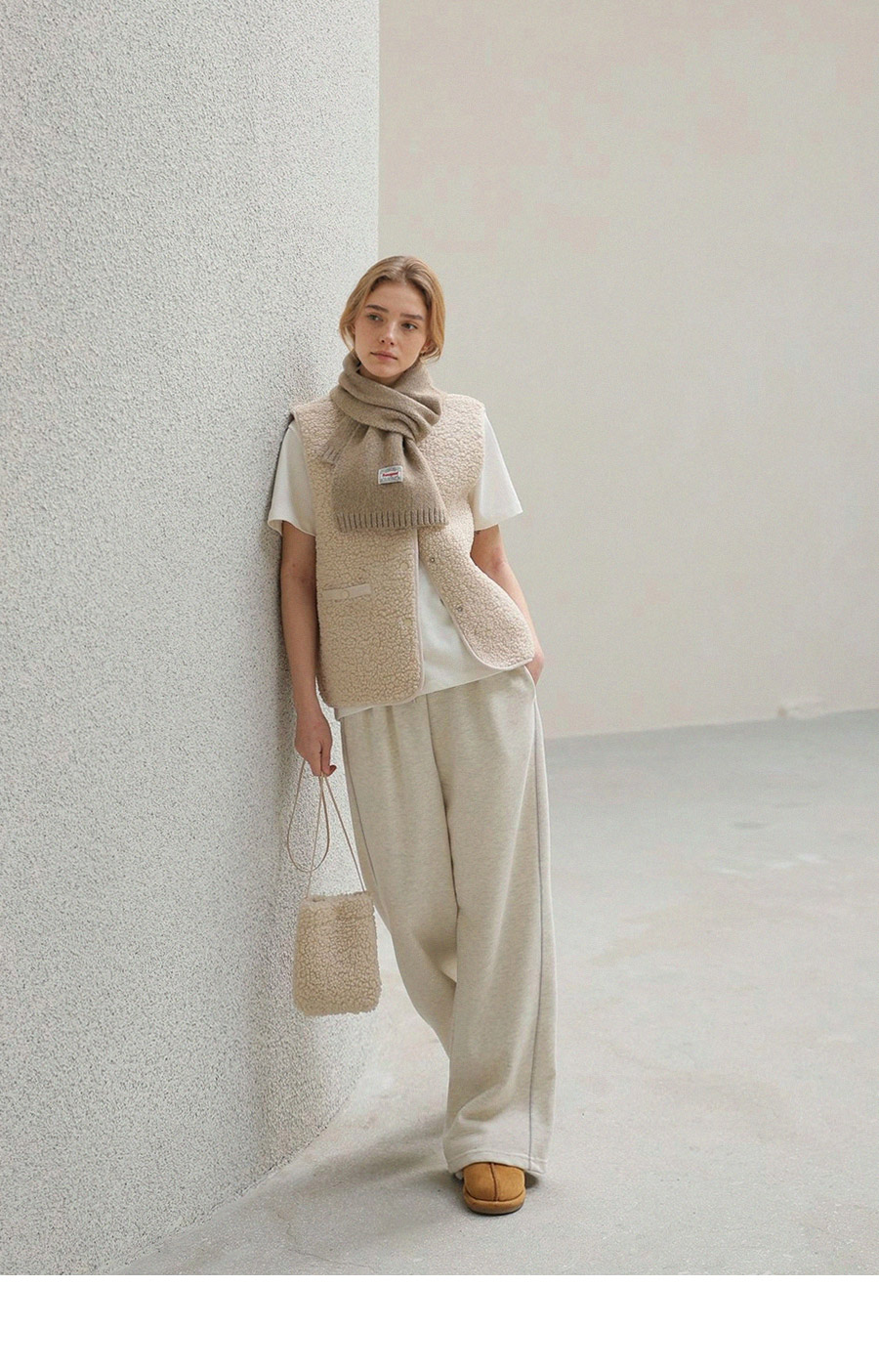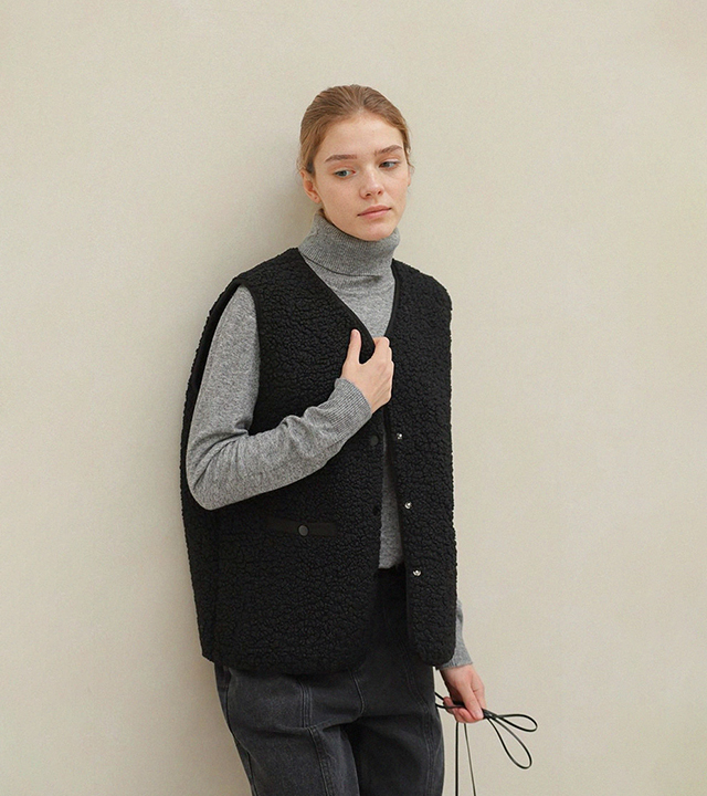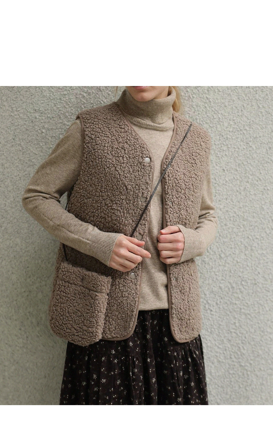 "포근한 덤블 소재와 미니 가방 세트로 완성한 윈터 베스트"