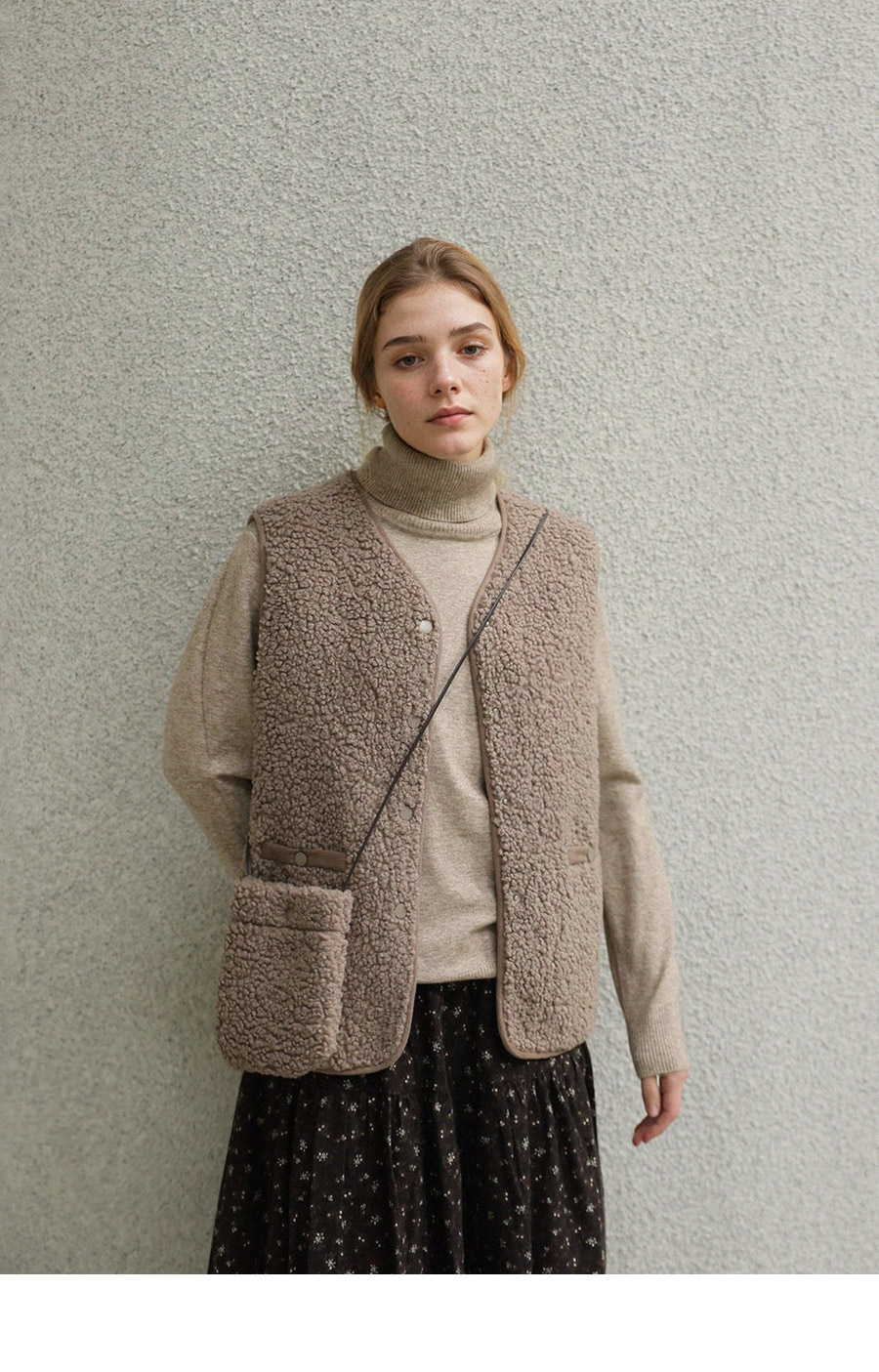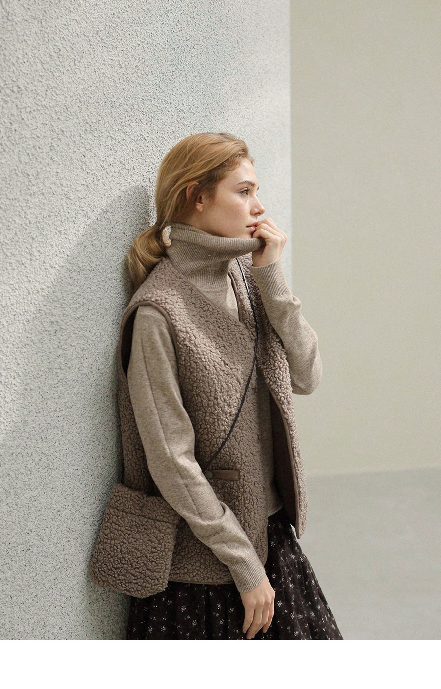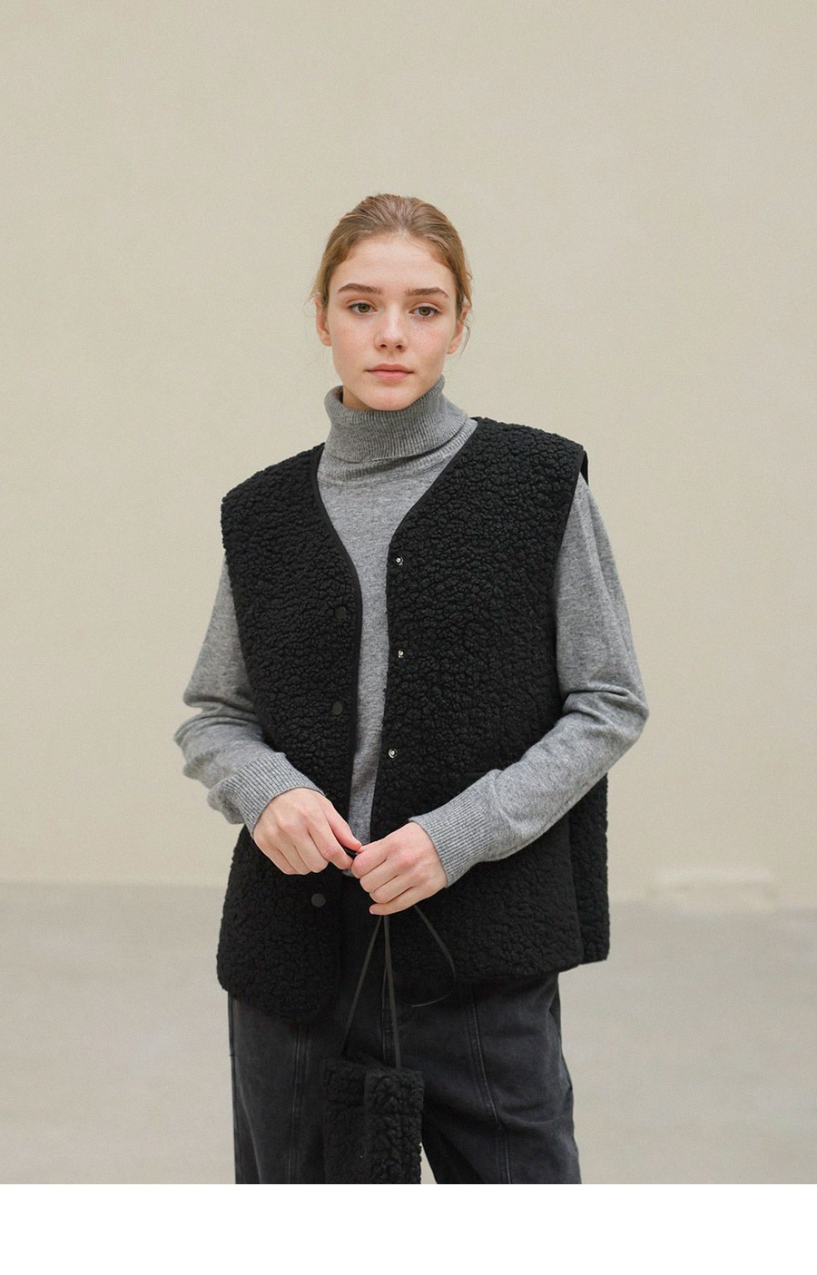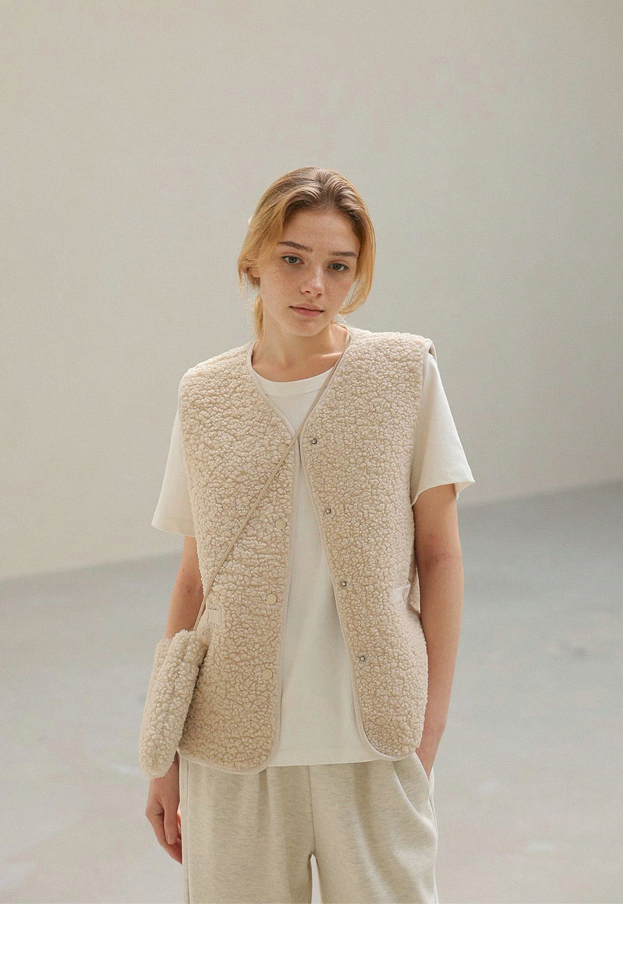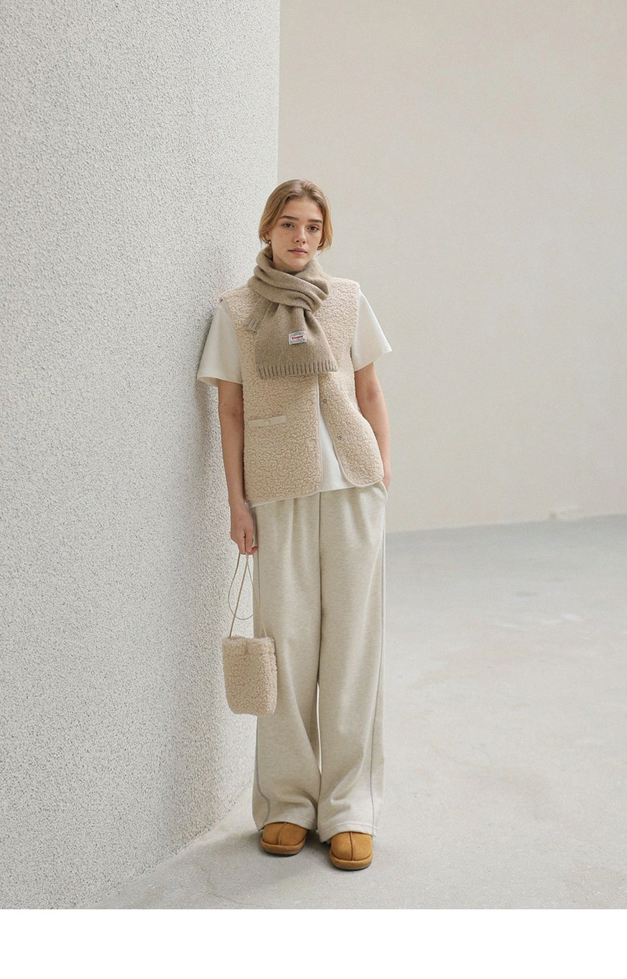"포근한 덤블 소재와 미니 가방 세트로 완성한 윈터 베스트"