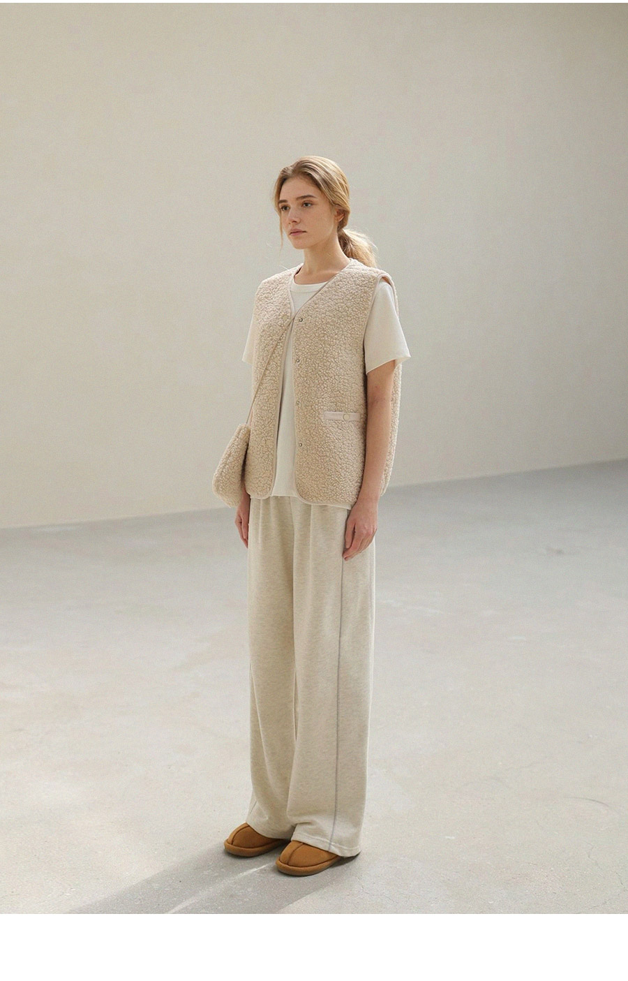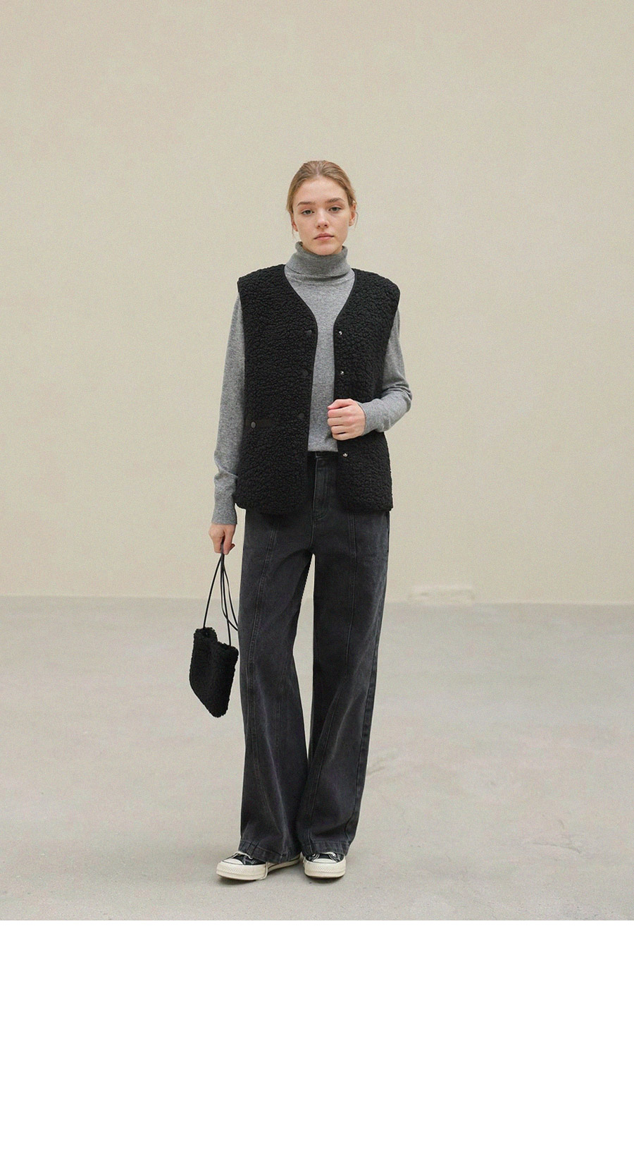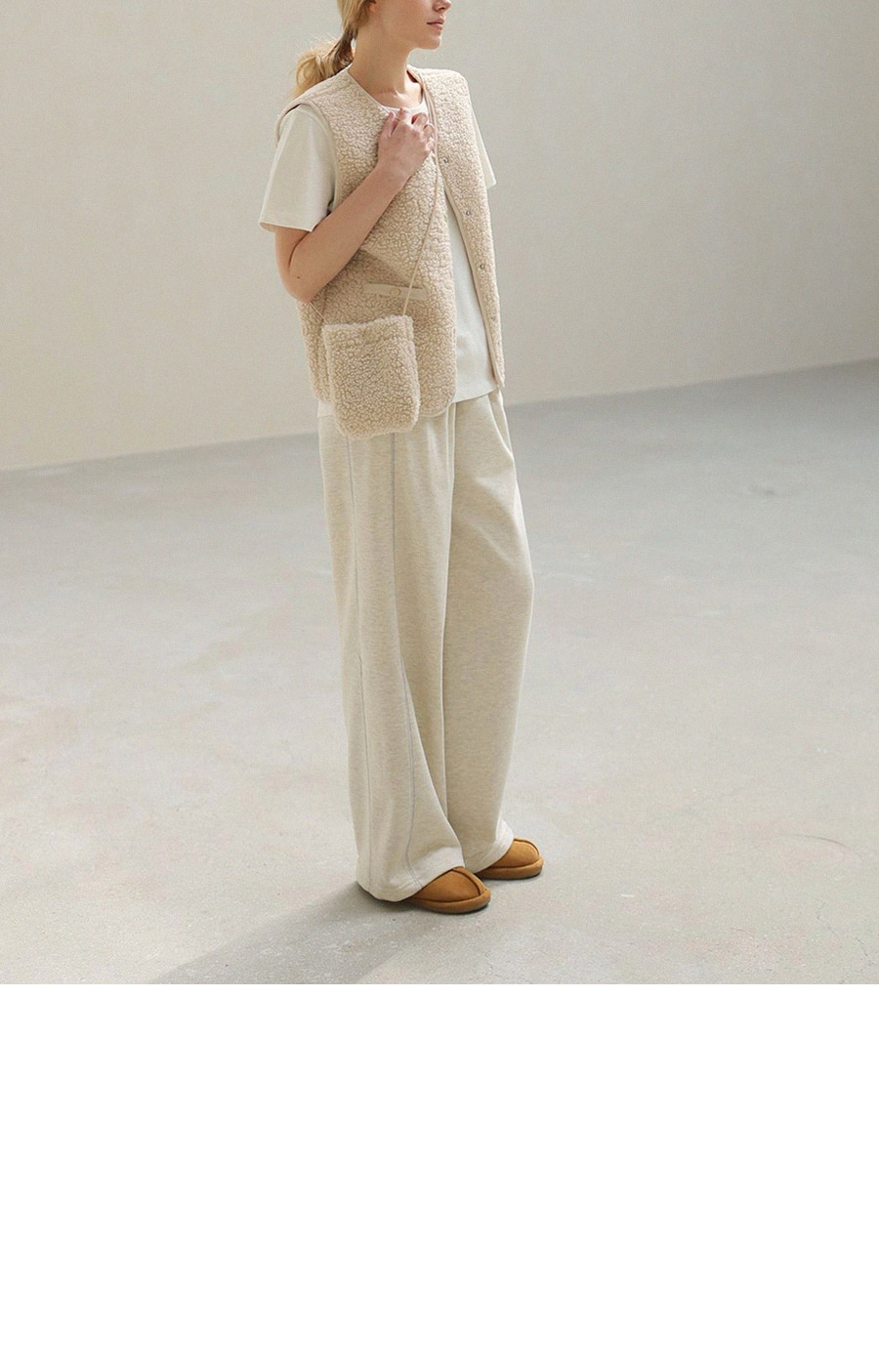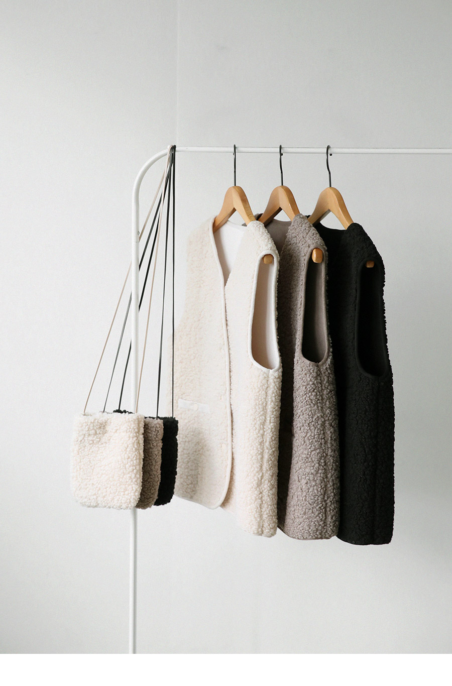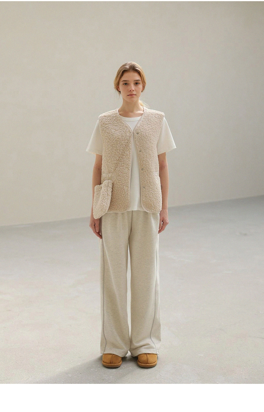 "포근한 덤블 소재와 미니 가방 세트로 완성한 윈터 베스트"