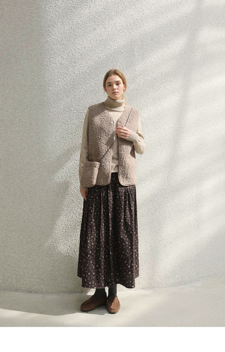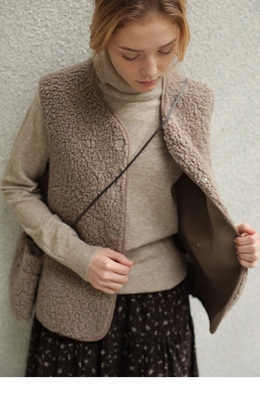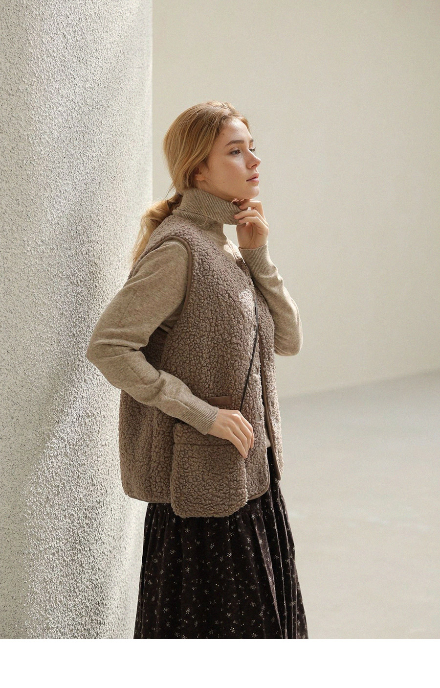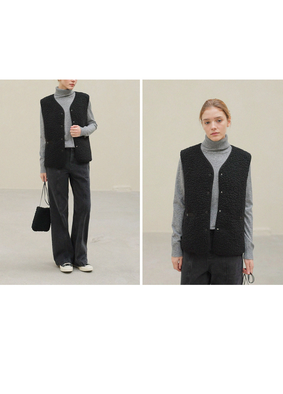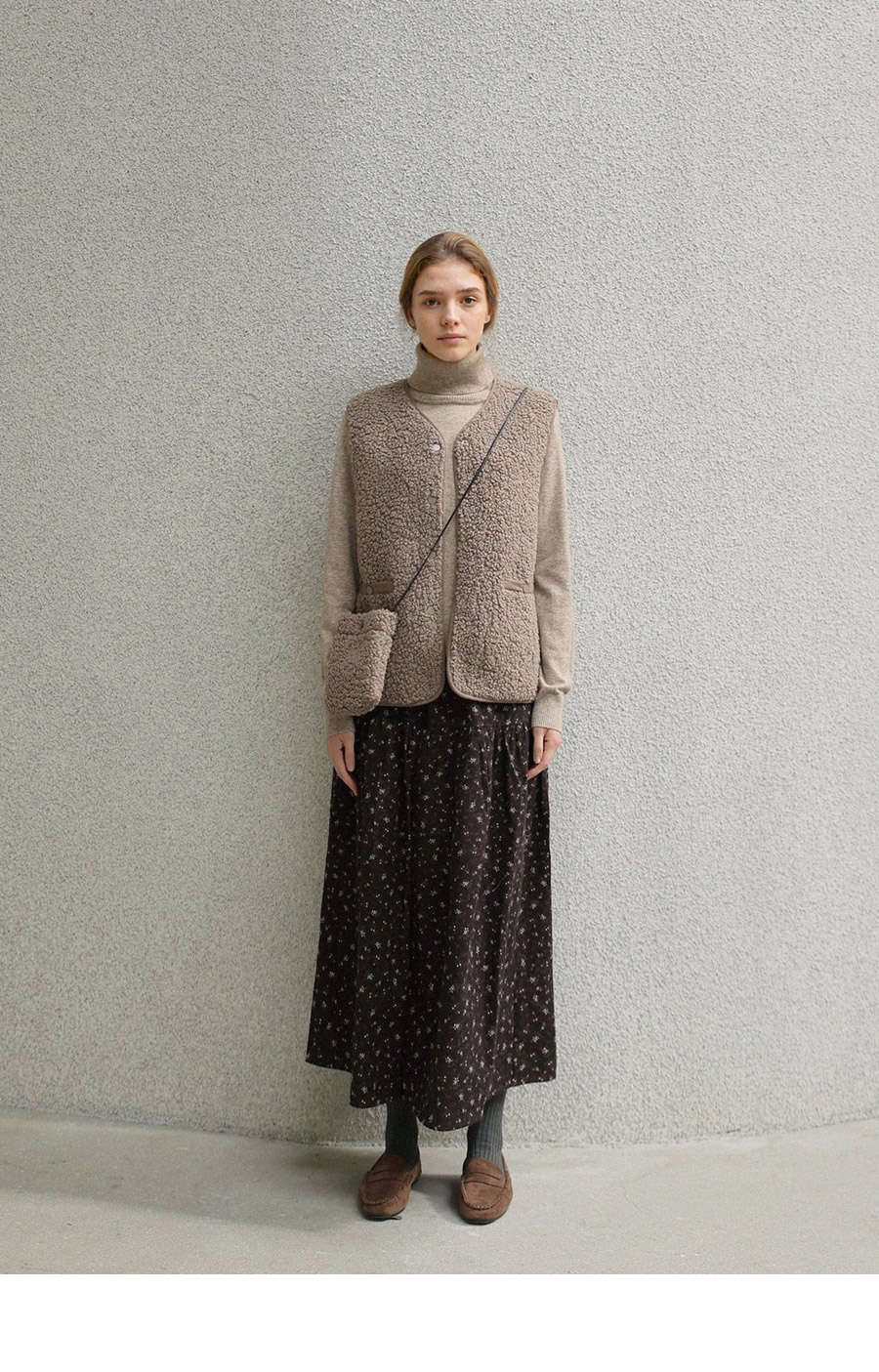 "포근한 덤블 소재와 미니 가방 세트로 완성한 윈터 베스트"