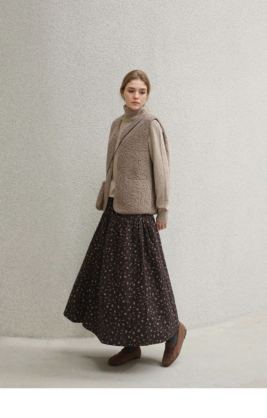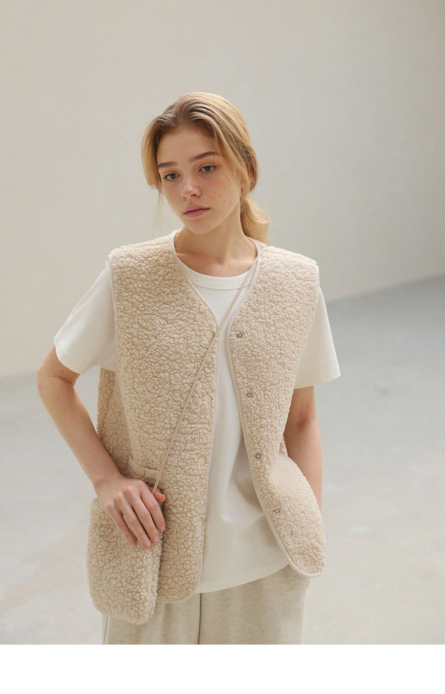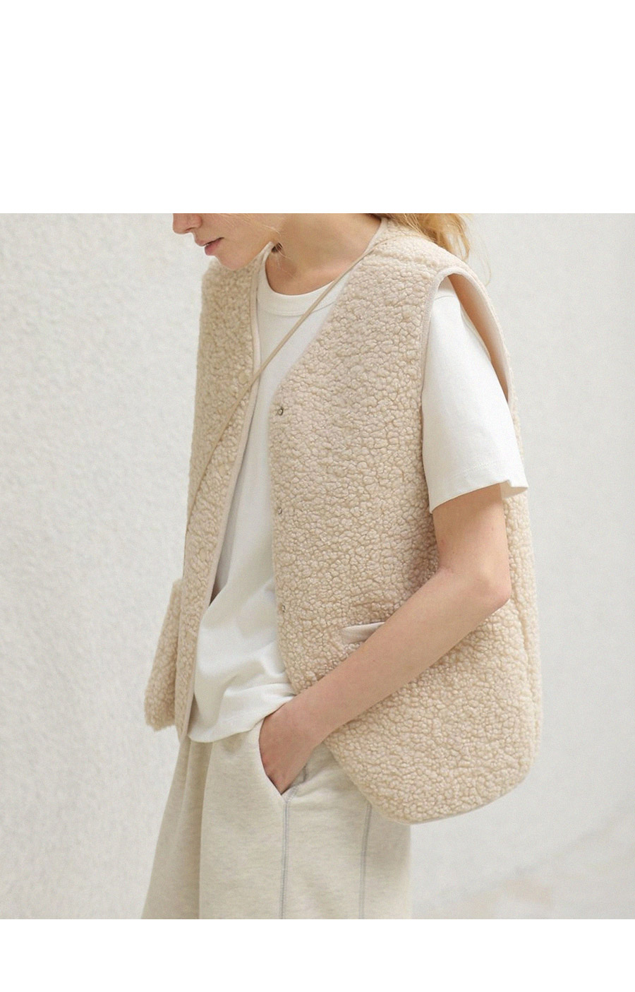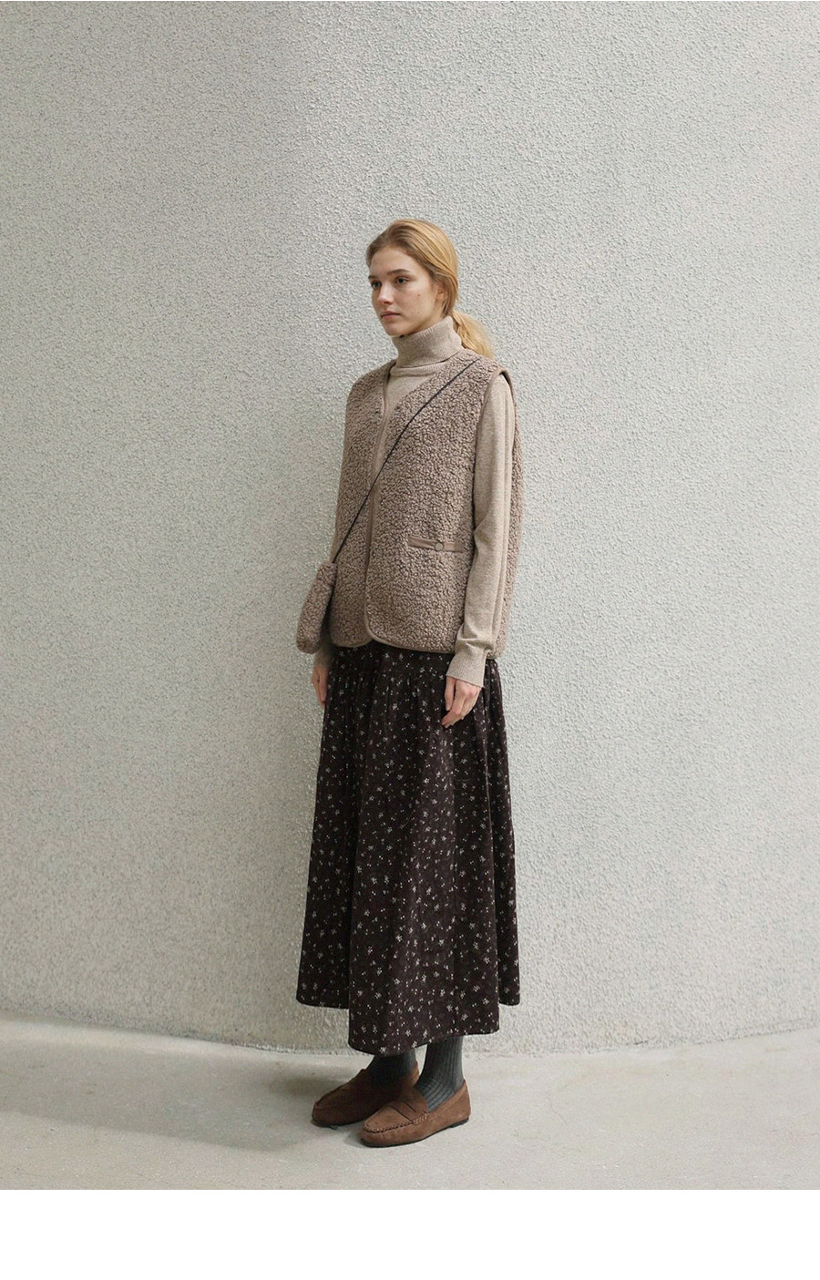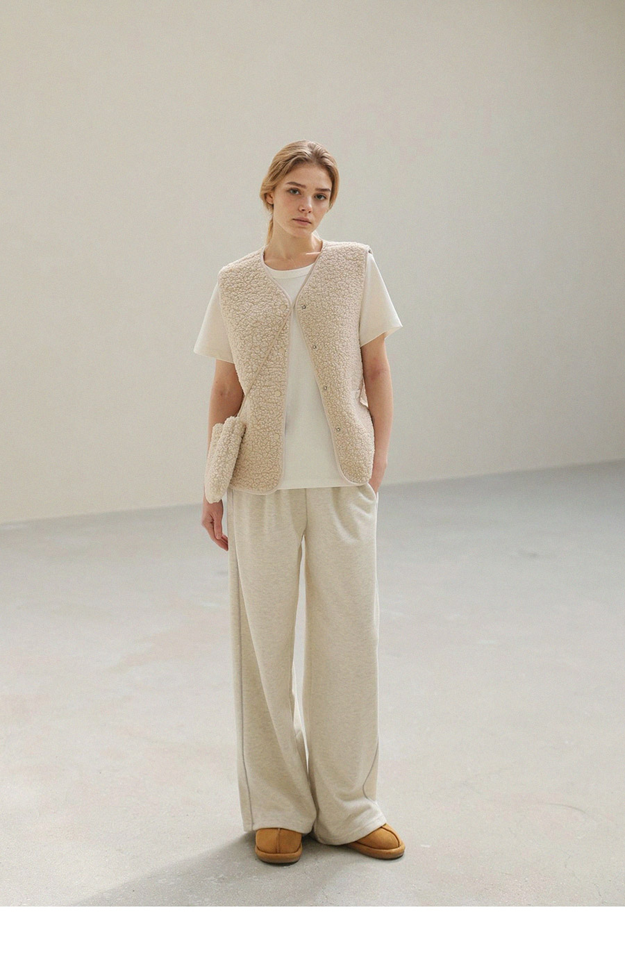 "포근한 덤블 소재와 미니 가방 세트로 완성한 윈터 베스트"