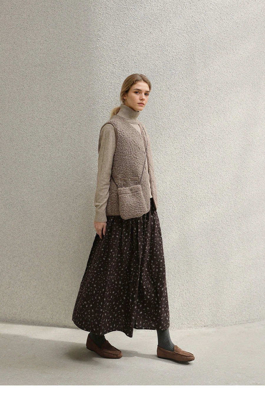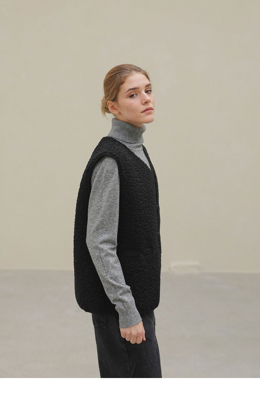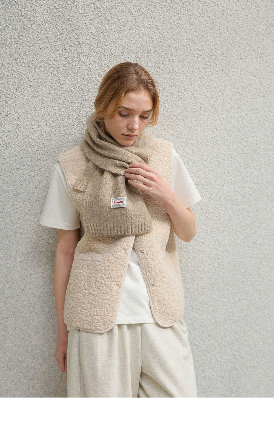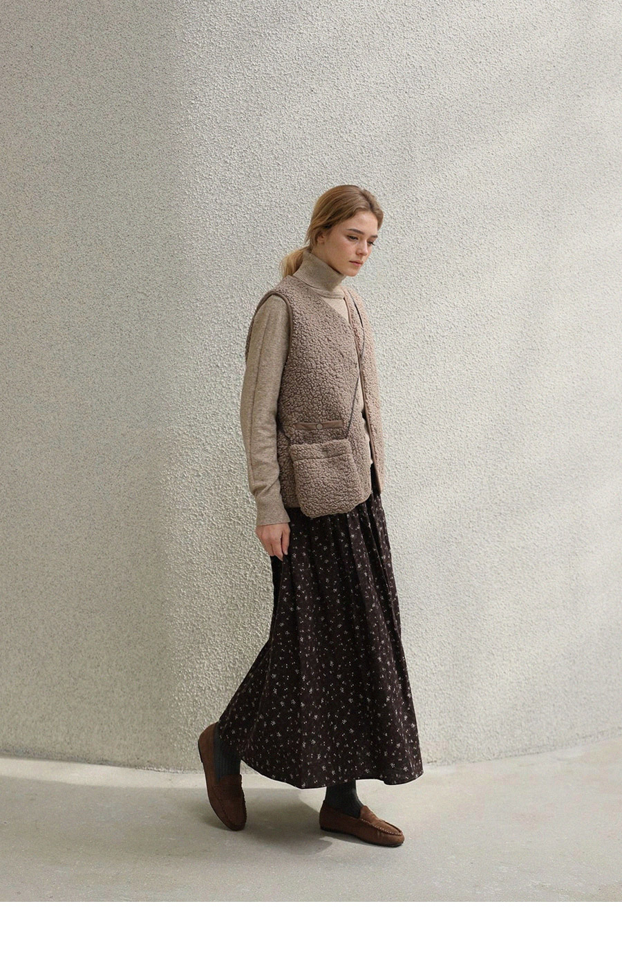 "포근한 덤블 소재와 미니 가방 세트로 완성한 윈터 베스트"