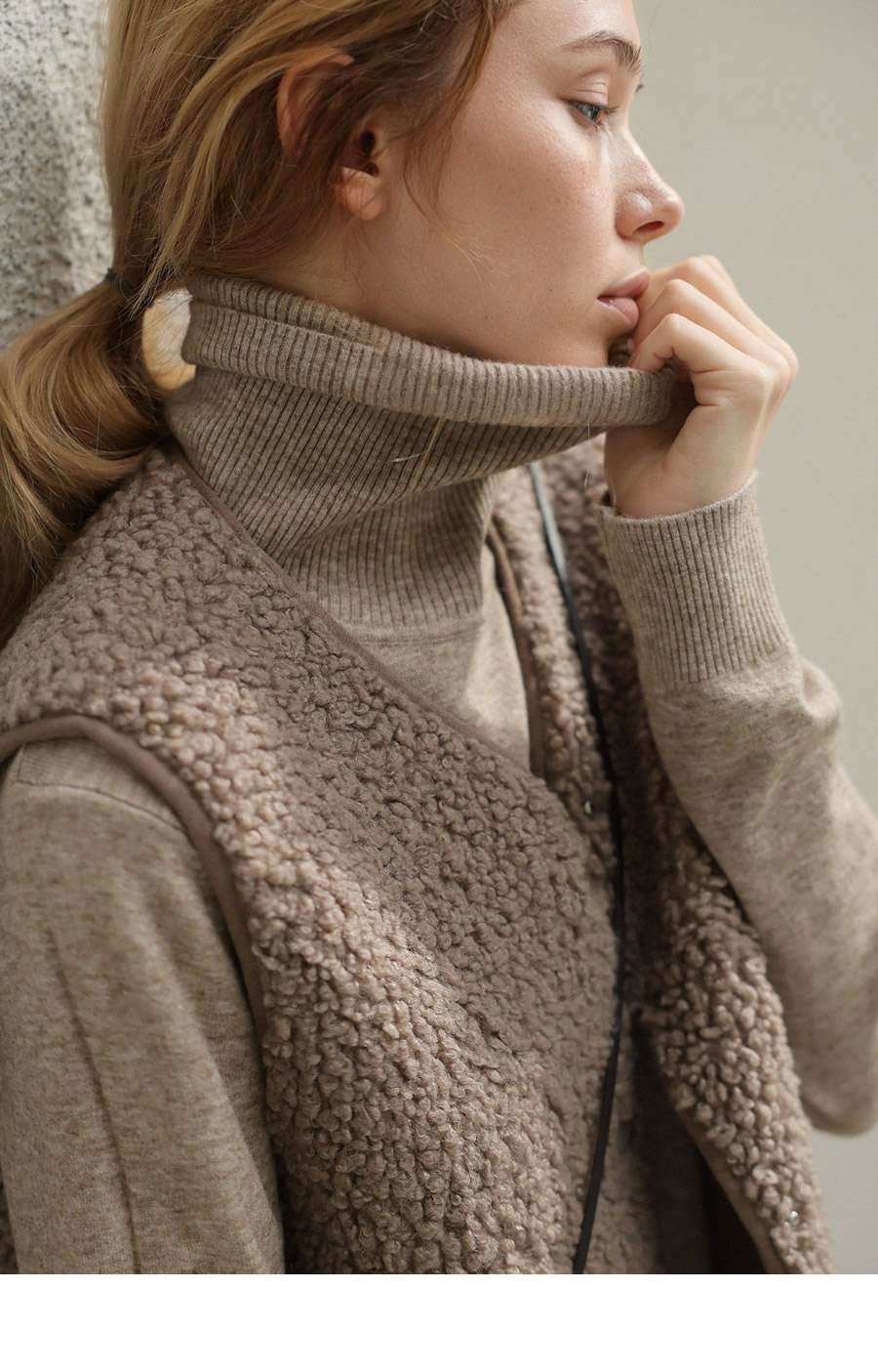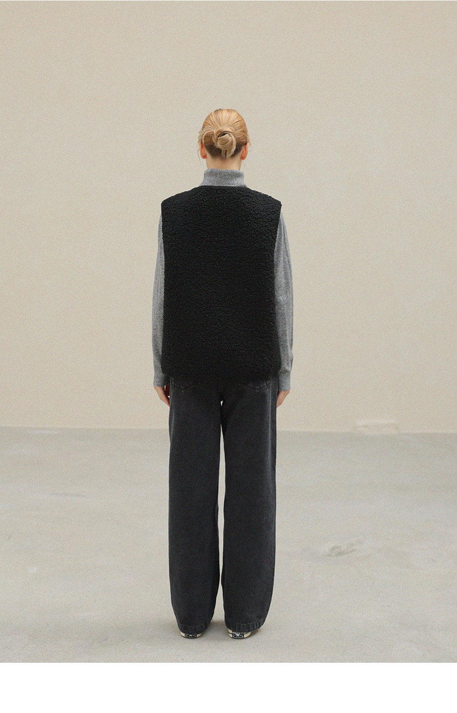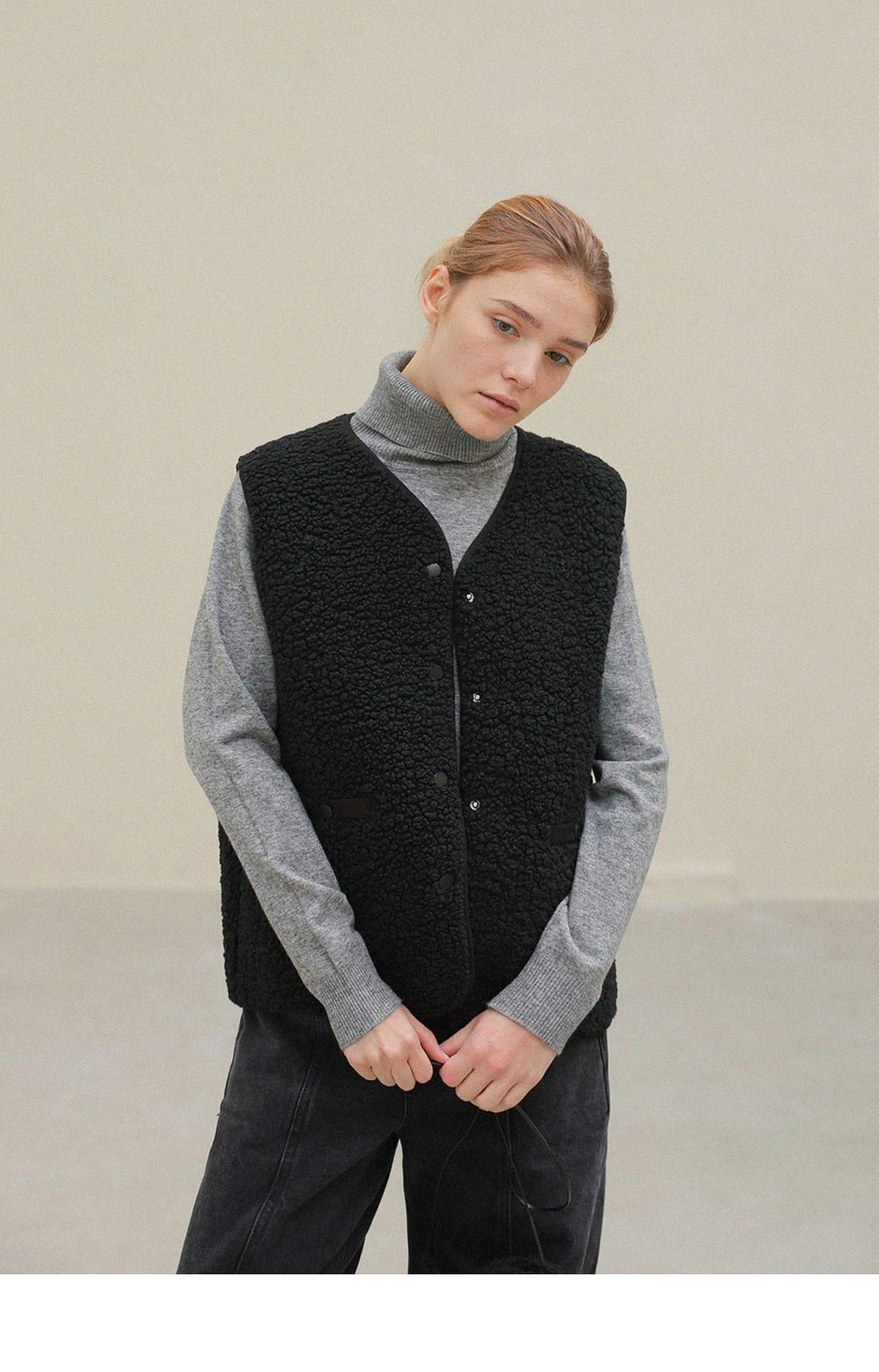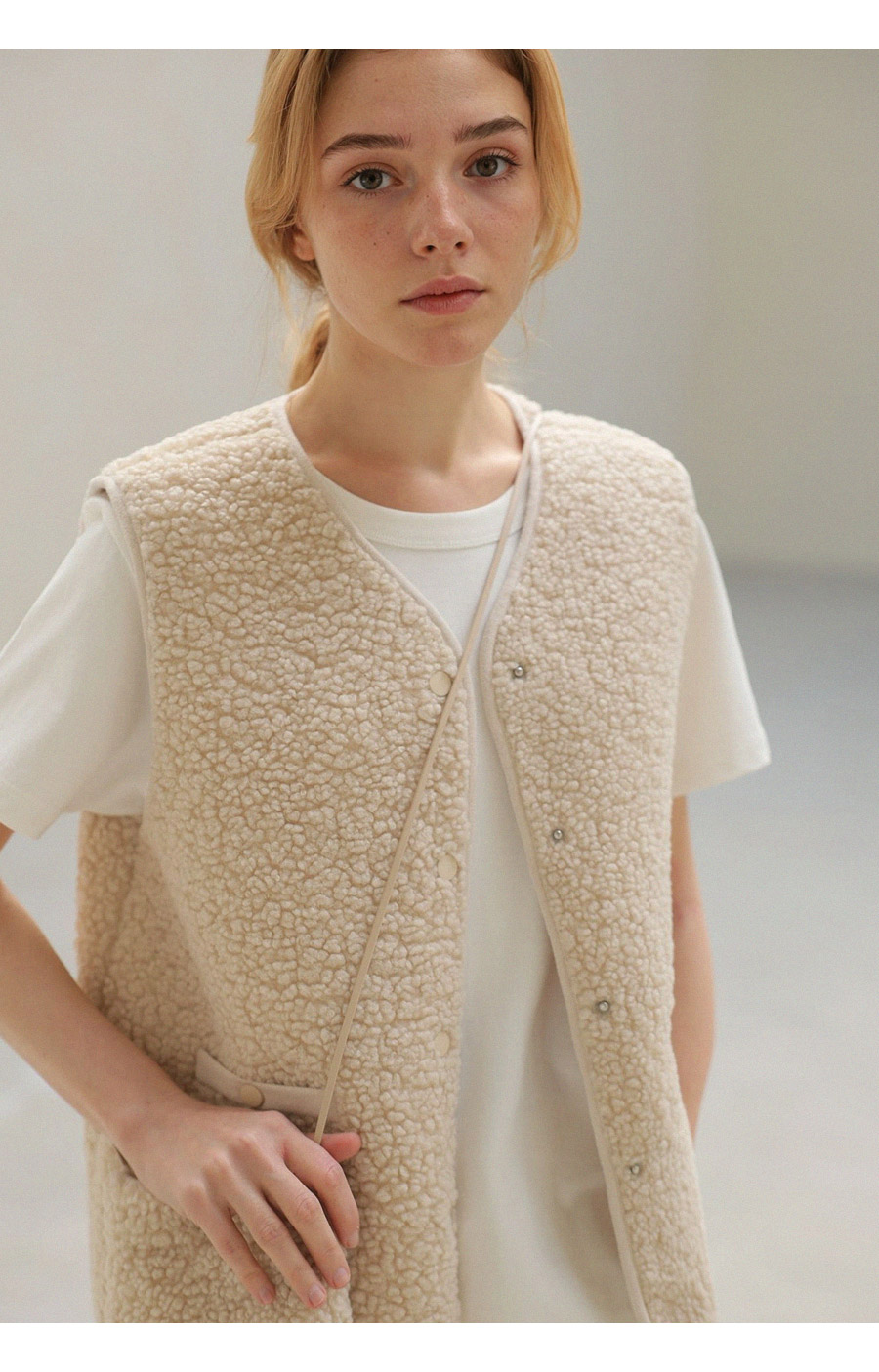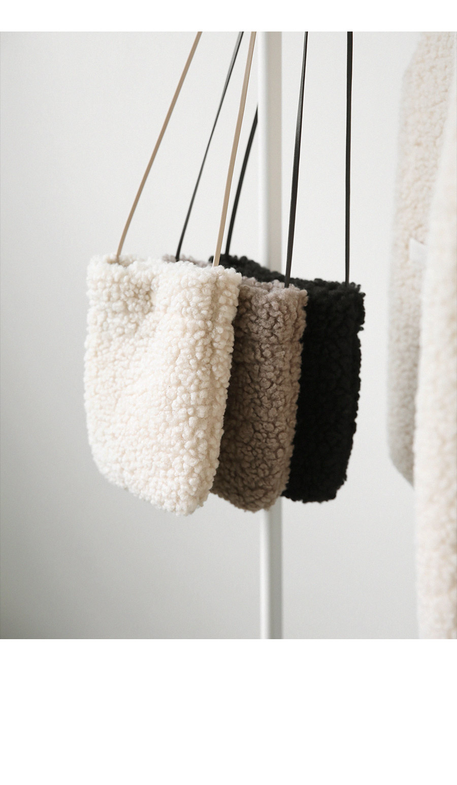 "포근한 덤블 소재와 미니 가방 세트로 완성한 윈터 베스트"
