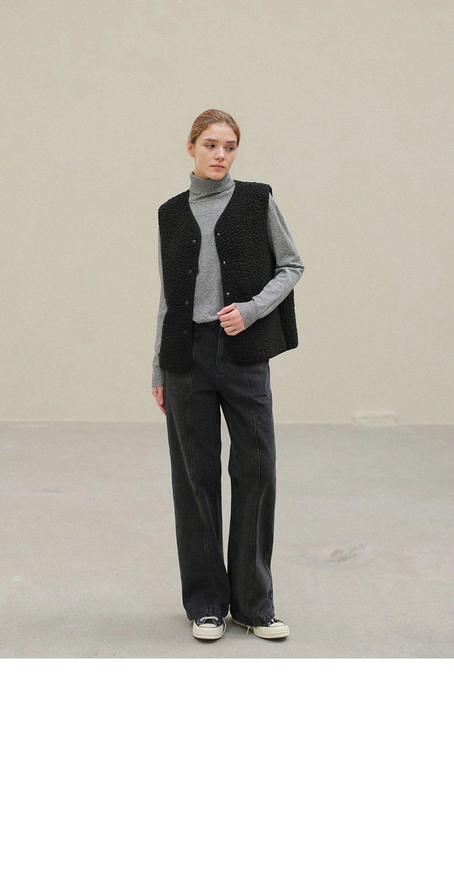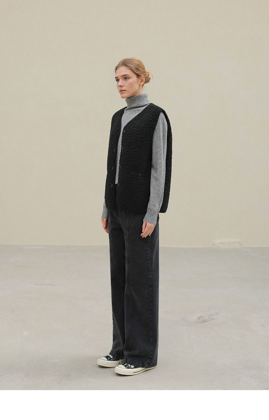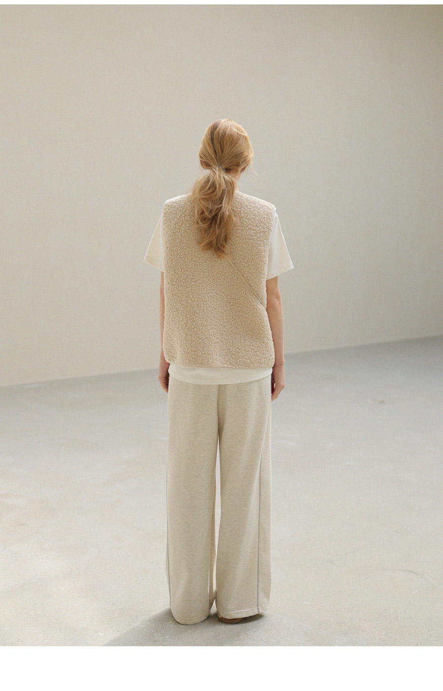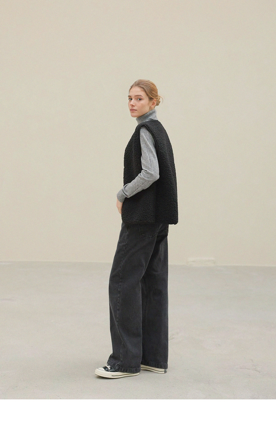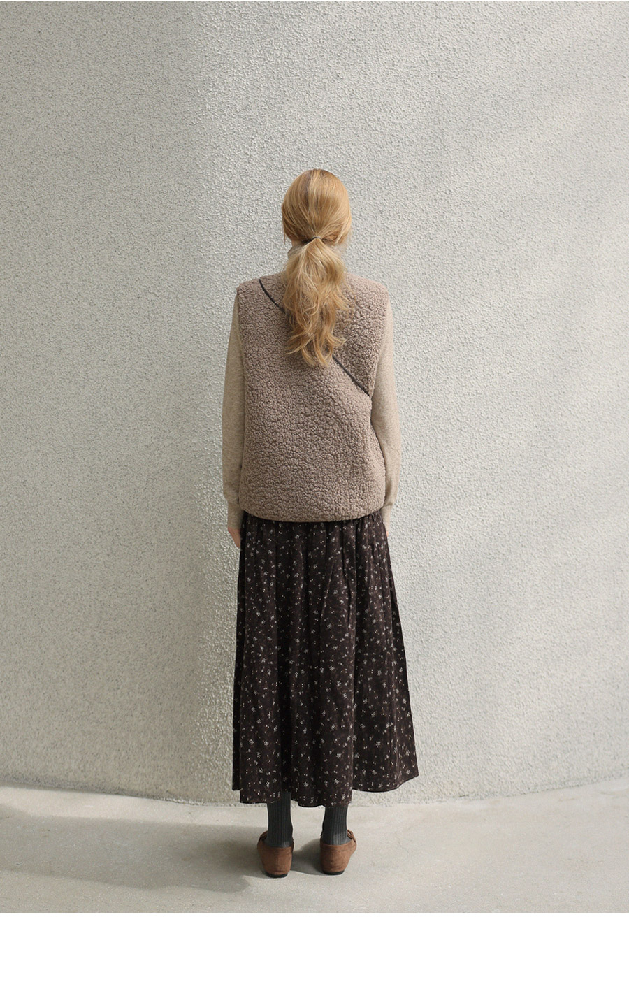 "포근한 덤블 소재와 미니 가방 세트로 완성한 윈터 베스트"