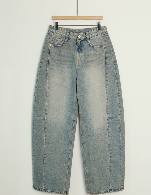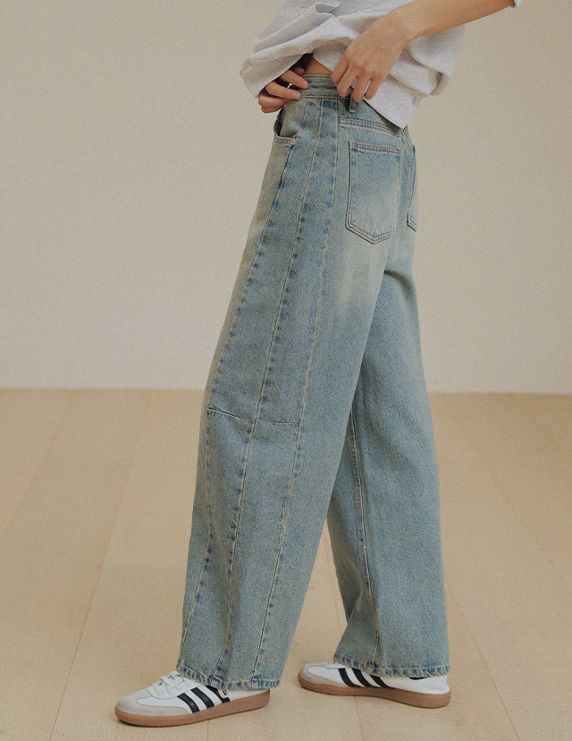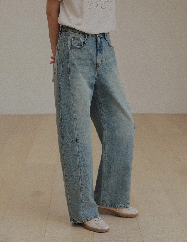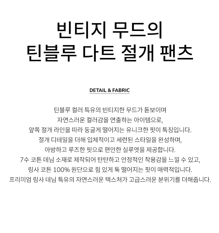 "빈티지 무드의 틴블루 다트 절개 팬츠"