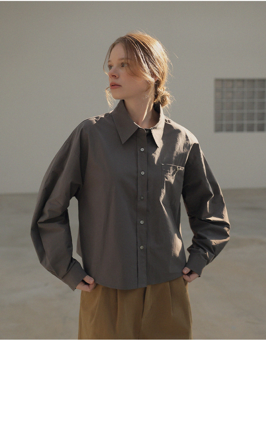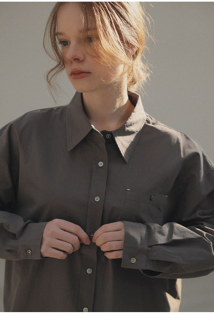 - 깔끔한 스탠다드 카라와 심플 버튼 여밈 디테일
