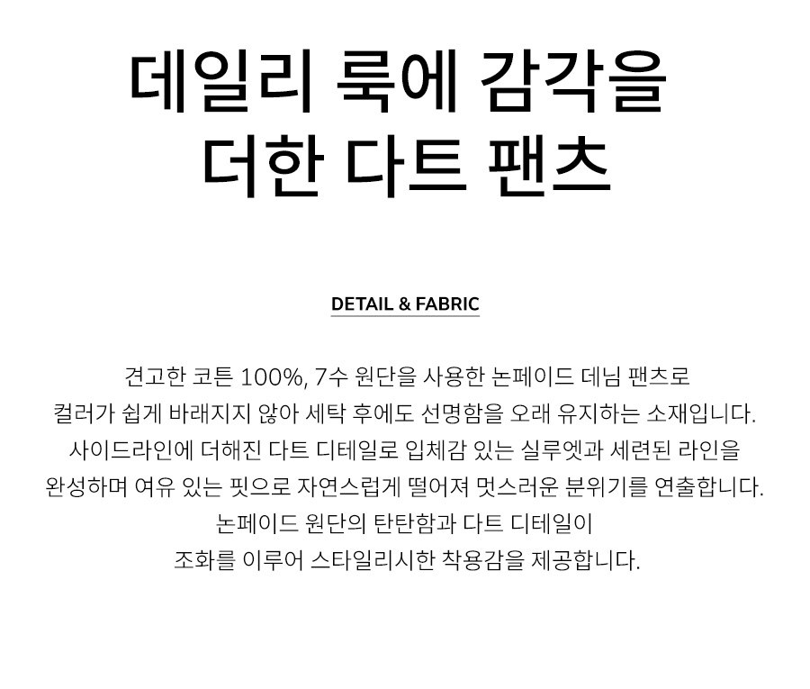 - 논페이드 원단의 탄탄함과 다트 디테일이 더해져 스타일리시한 착용감 제공