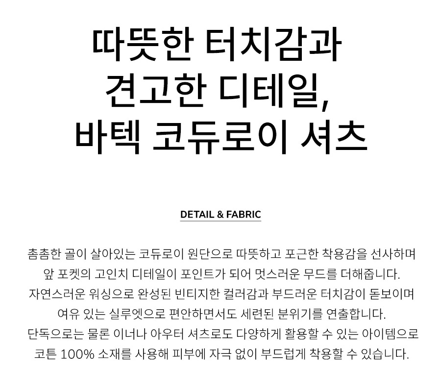 "따뜻한 터치감과 견고한 디테일, 바텍 코듀로이 셔츠"